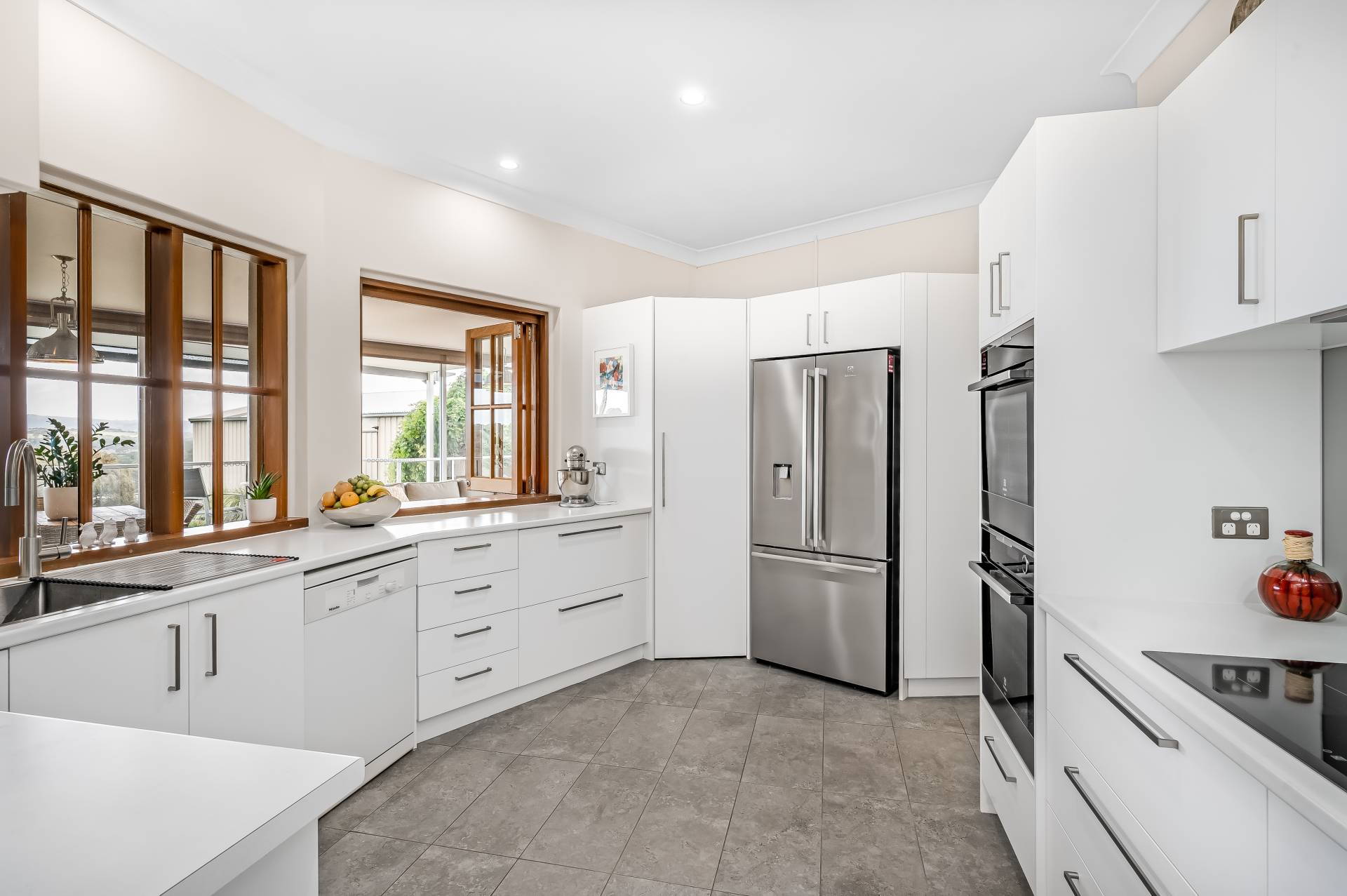 - Central and spacious designer kitchen featuring sparkling white-on-white cabinetry and bench tops, sleek electric cook top, in-wall ovens and conversation-ready servery