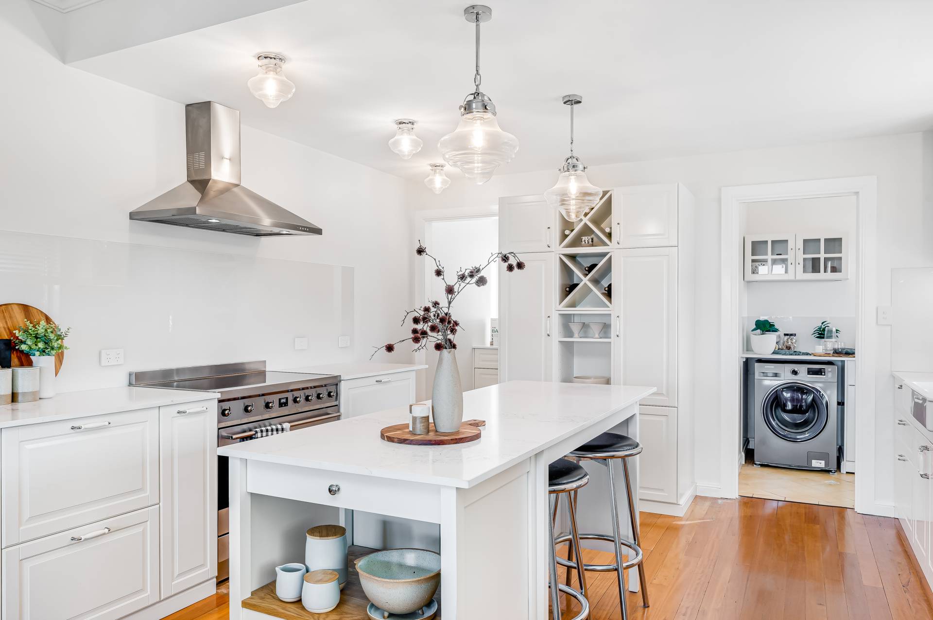 − Beautiful free-flowing lounge, dining and crisp white gourmet kitchen with abundant elegant cabinetry and cupboards, butler’s pantry, gleaming stainless appliances including sleek electric cook top for easy cleaning and stone bench tops