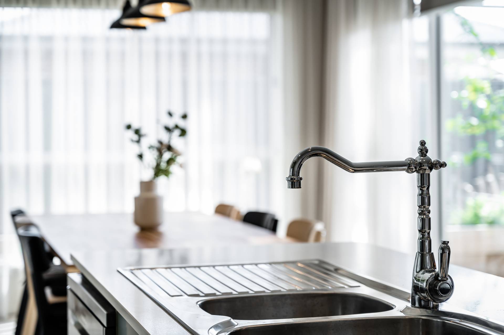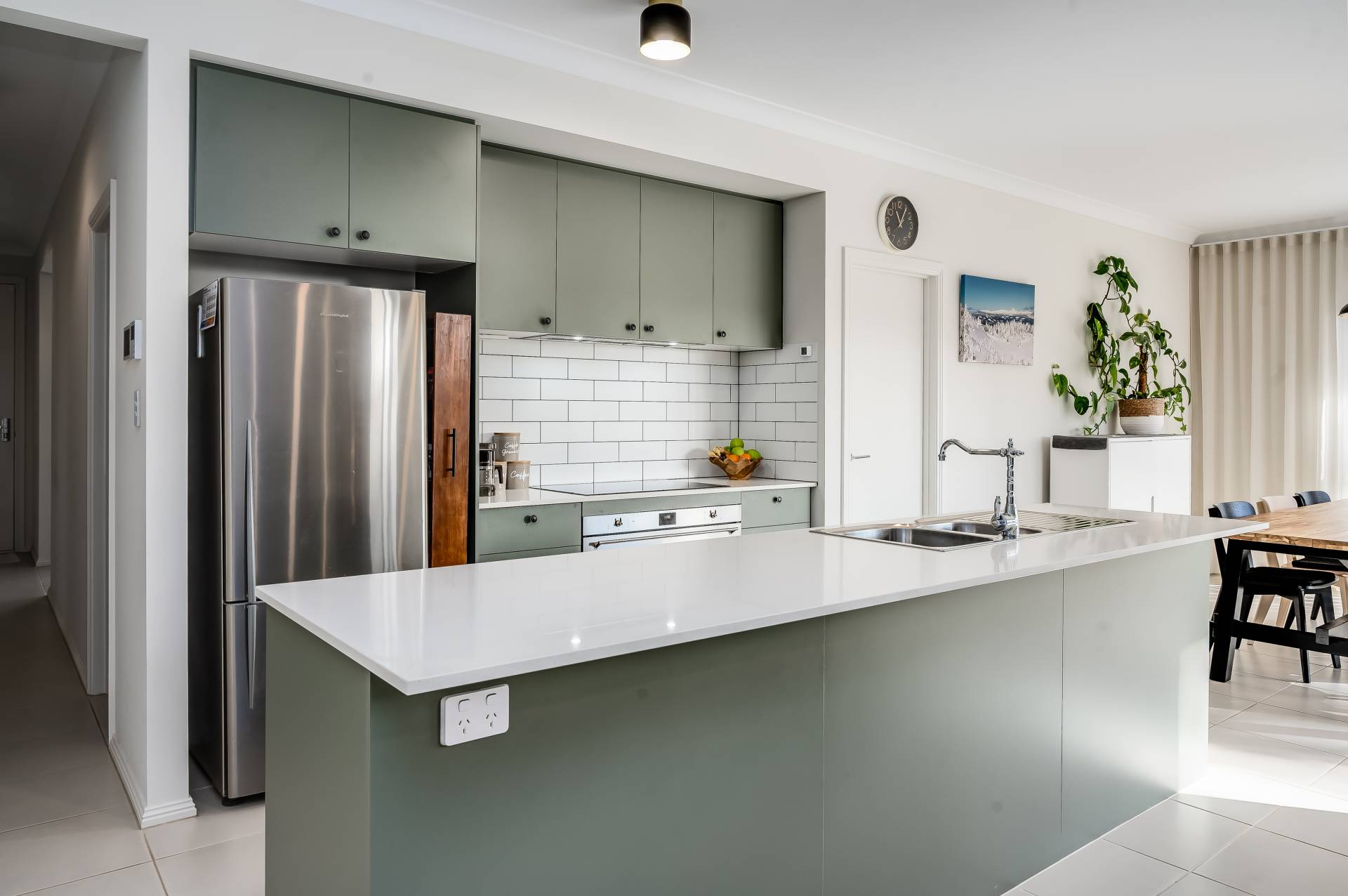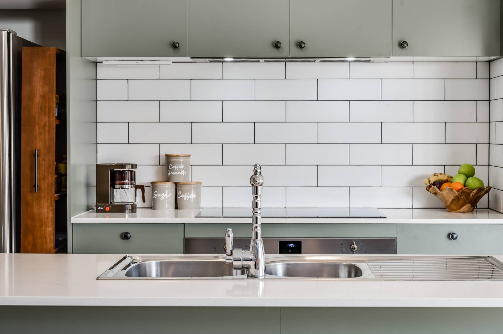 − Beautiful indoor-outdoor entertaining potential headlined by the sparkling chef’s zone flush with stone bench tops, subway tile splashback, sage green cabinetry and cupboards, and gleaming stainless appliances including sleek electric cook top