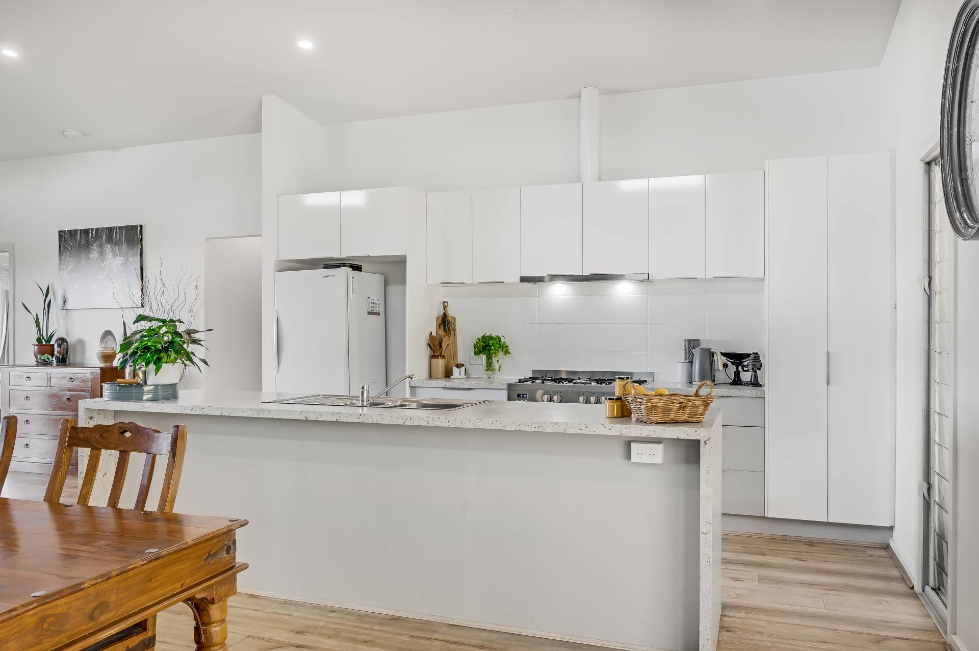 - Stone-topped designer chef’s zone featuring sprawling bench top space, abundant crisp cabinetry and cupboards, and gleaming stainless appliances including dishwasher and 900mm oven/gas stove top