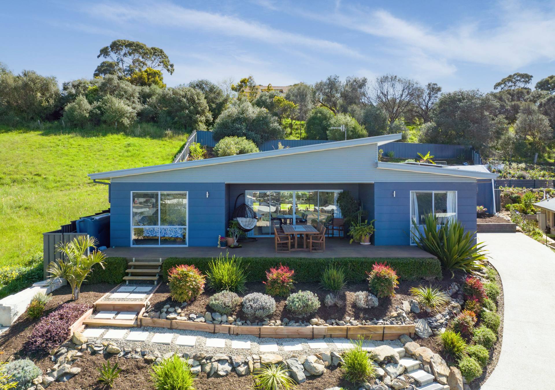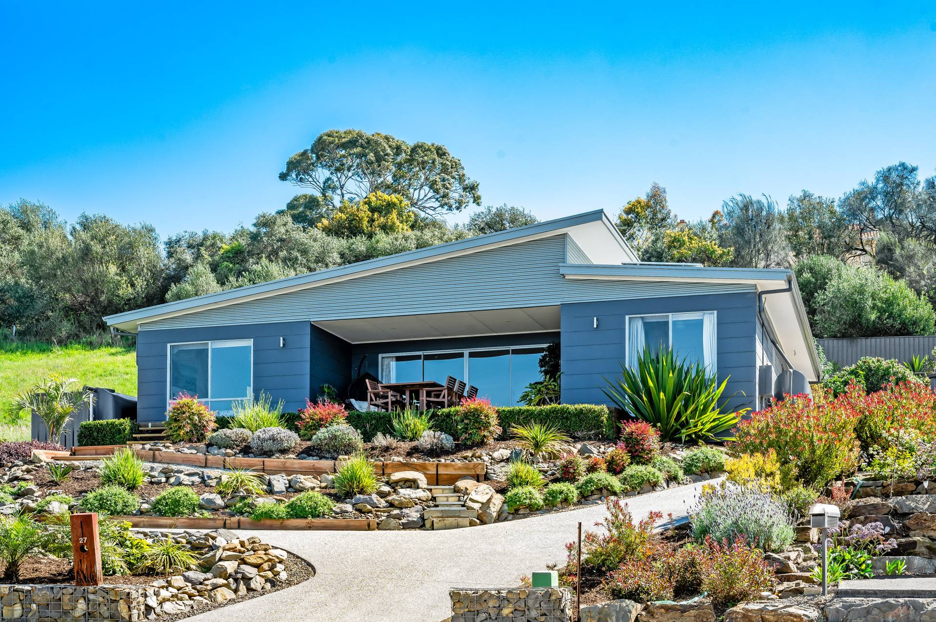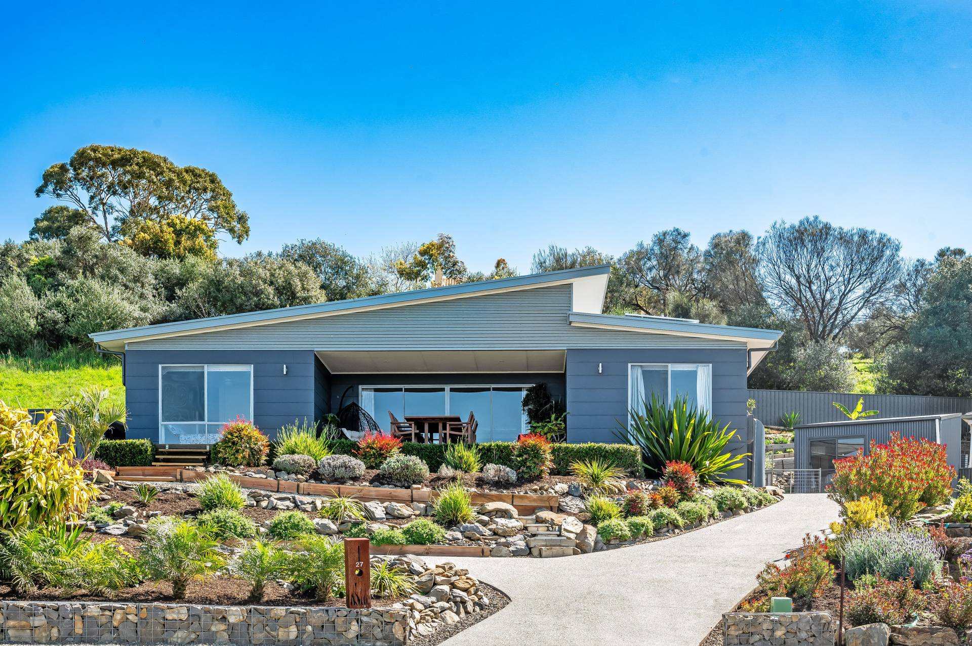 - Beautiful front and rear gardens, cascading with established easy-care native gardens
