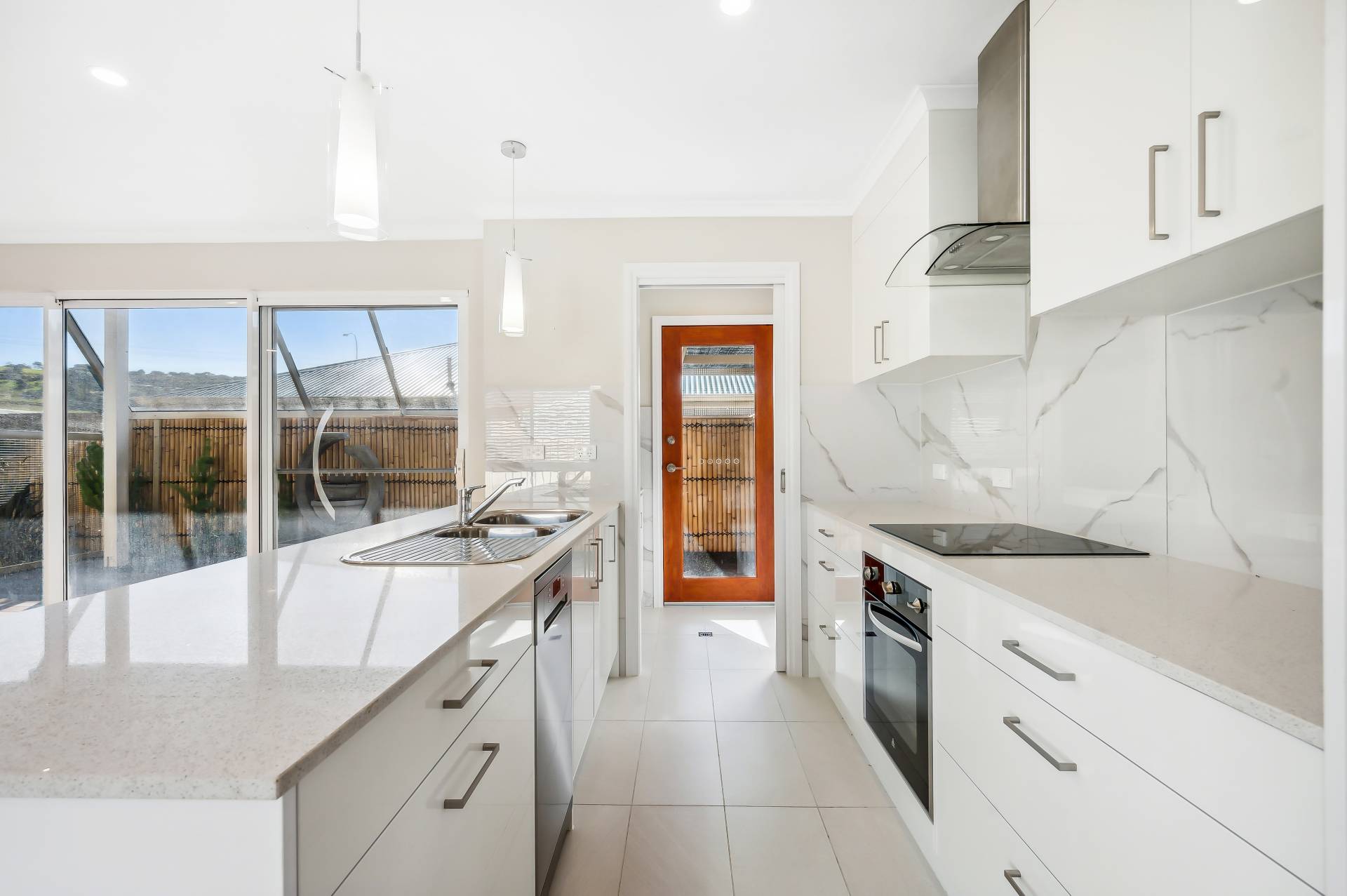 - Sparkling designer kitchen flush with stone bench tops and breakfast bar, pendant lighting, feature tile splashback, and stainless appliances including dishwasher and easy-clean electric cook top