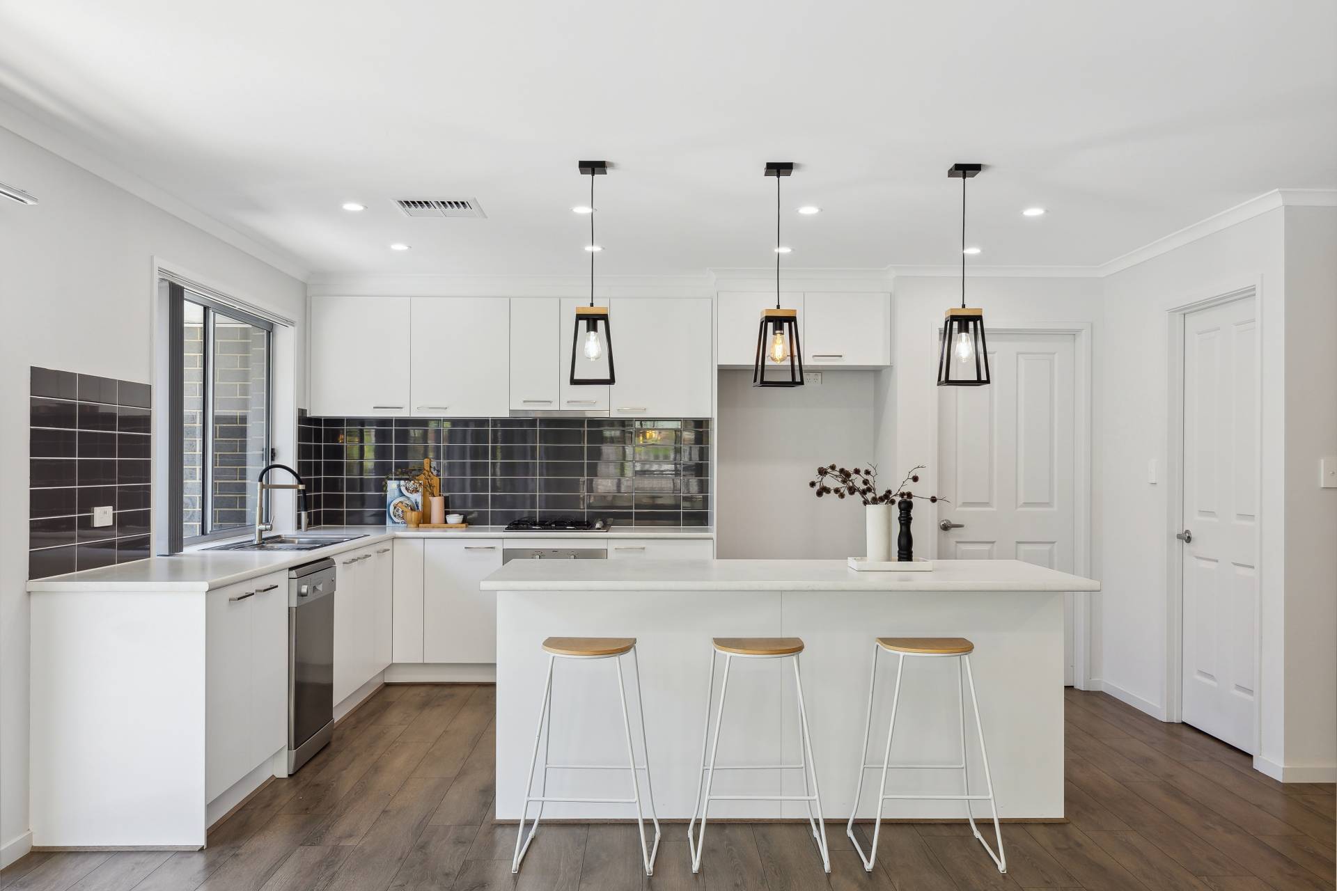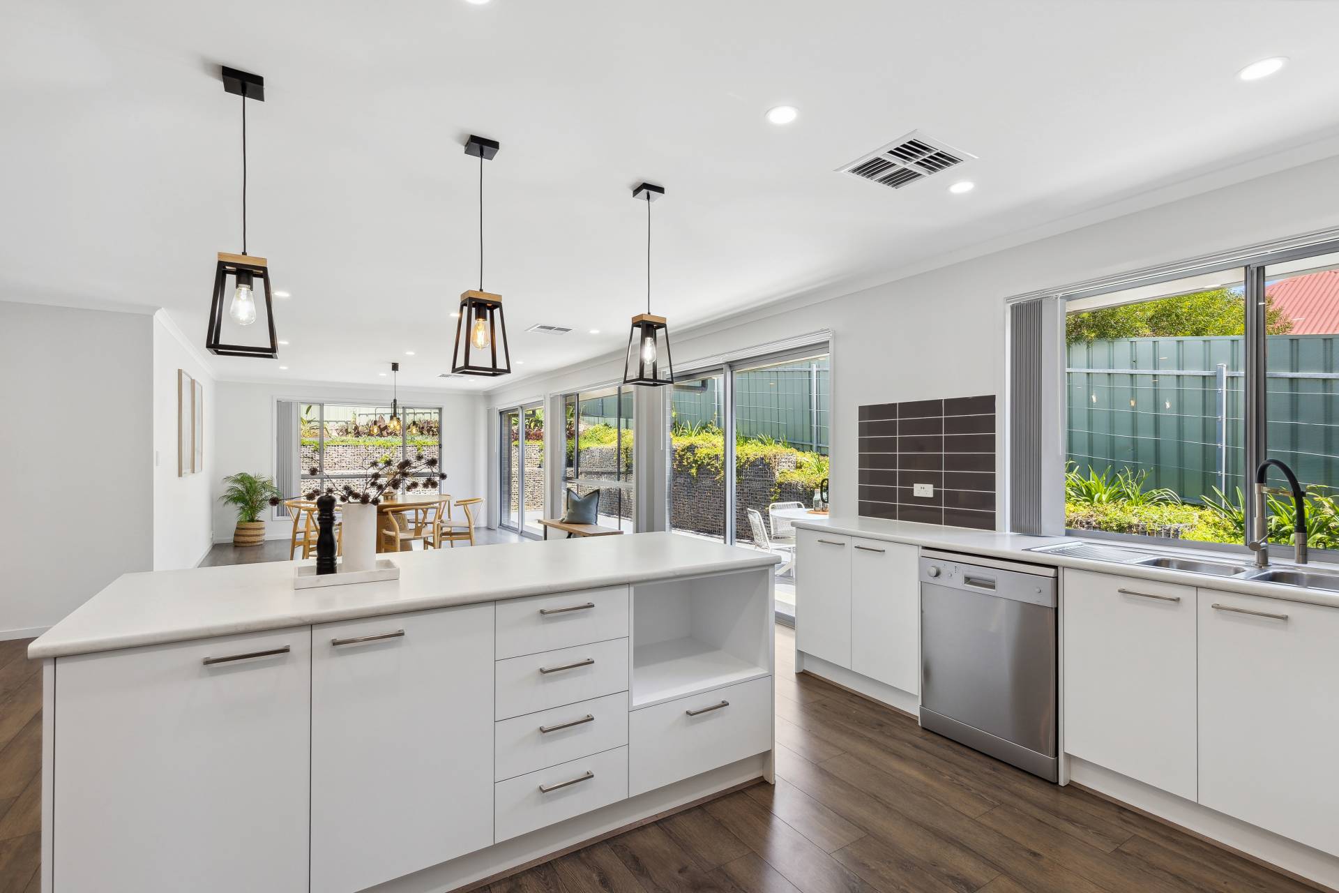 - Sweeping modern chef’s zone featuring sprawling bench top space perfect for casual easts and company while you cook, abundant cabinetry and cupboards, WIP, pendant lighting and stainless appliances including dishwasher