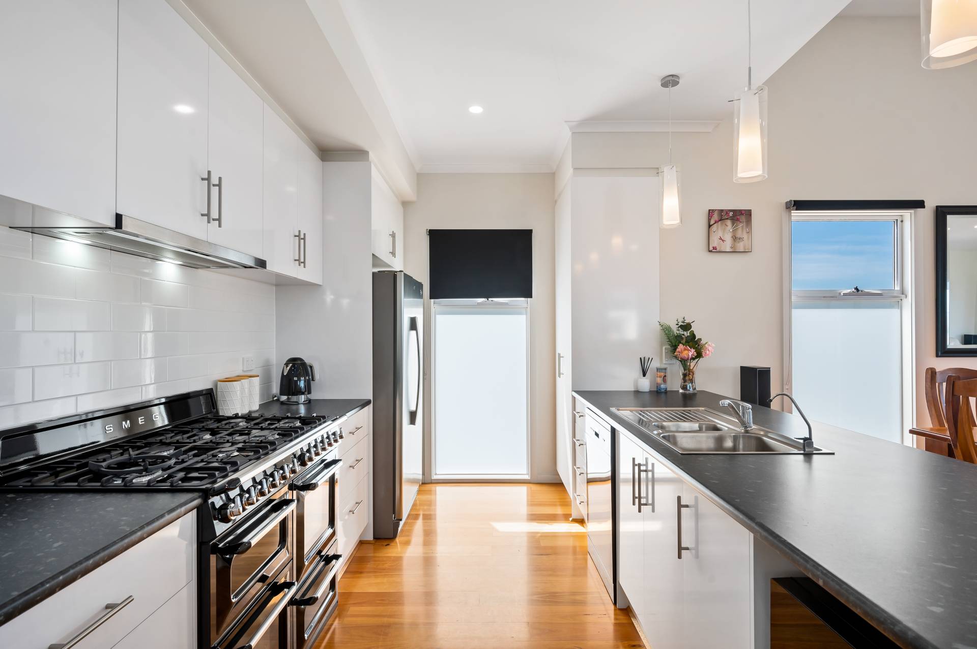 - Crisp modern kitchen with great bench top space, abundant cabinetry, pendant lighting, dishwasher and dual Smeg ovens for stress-free cooking