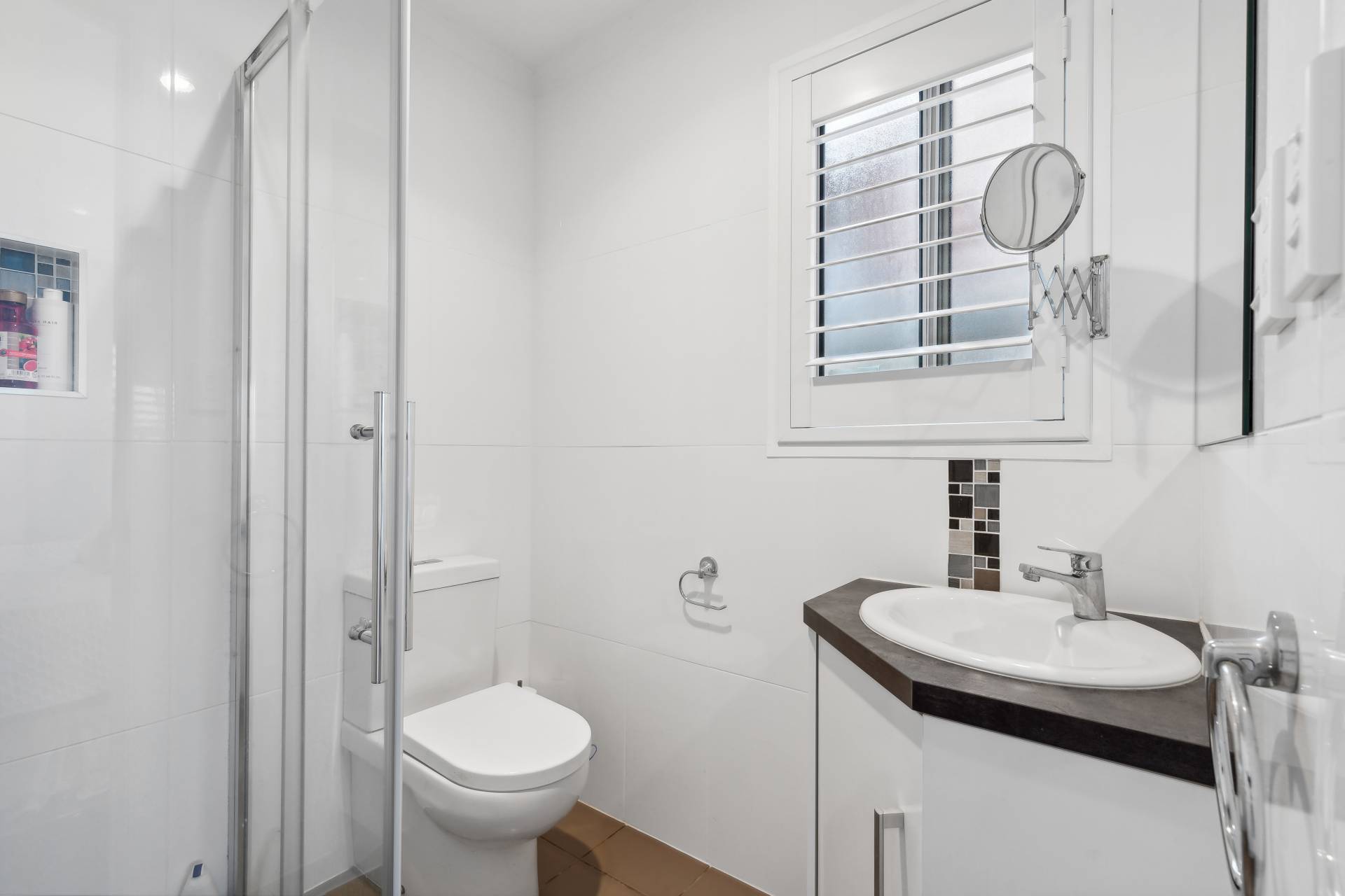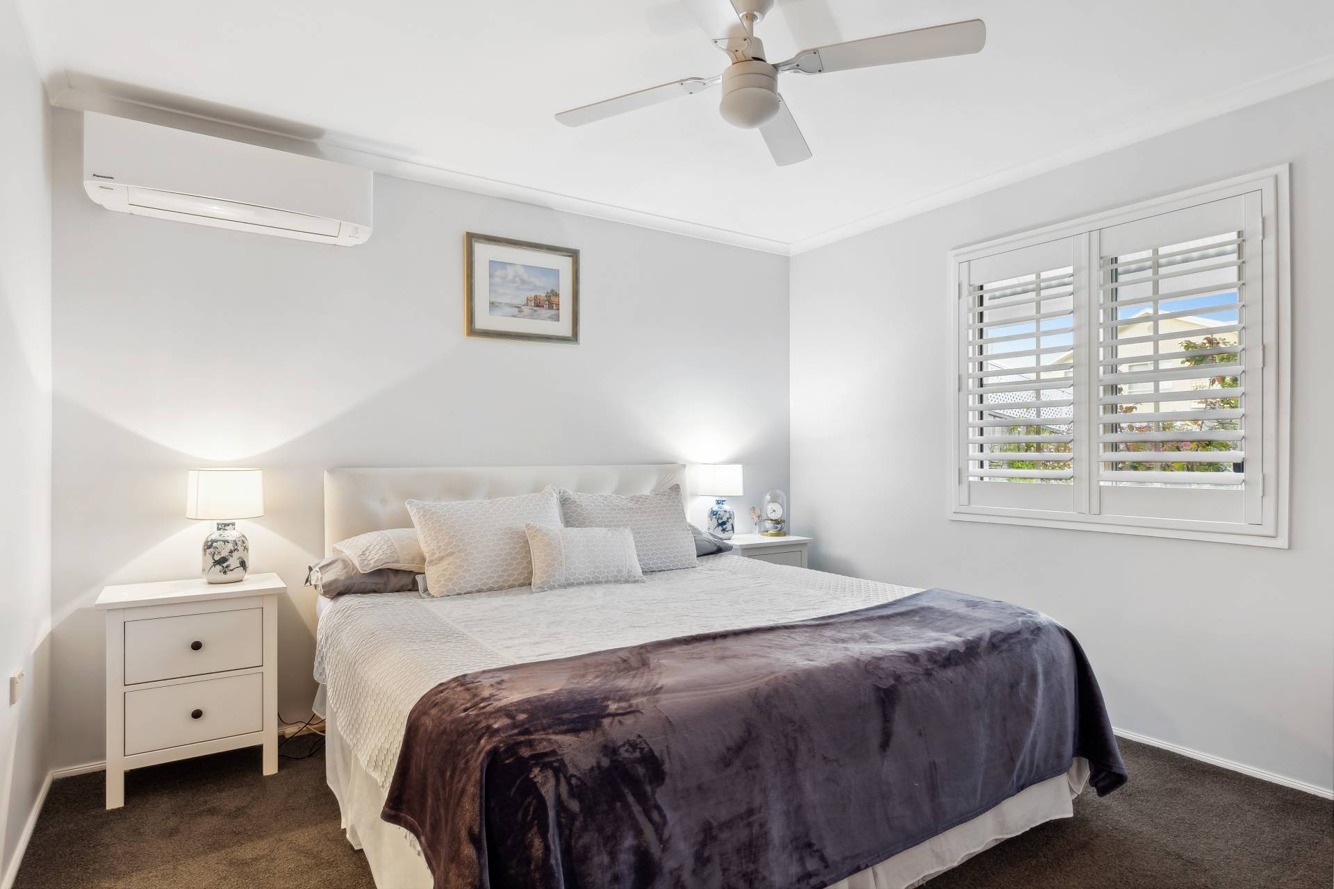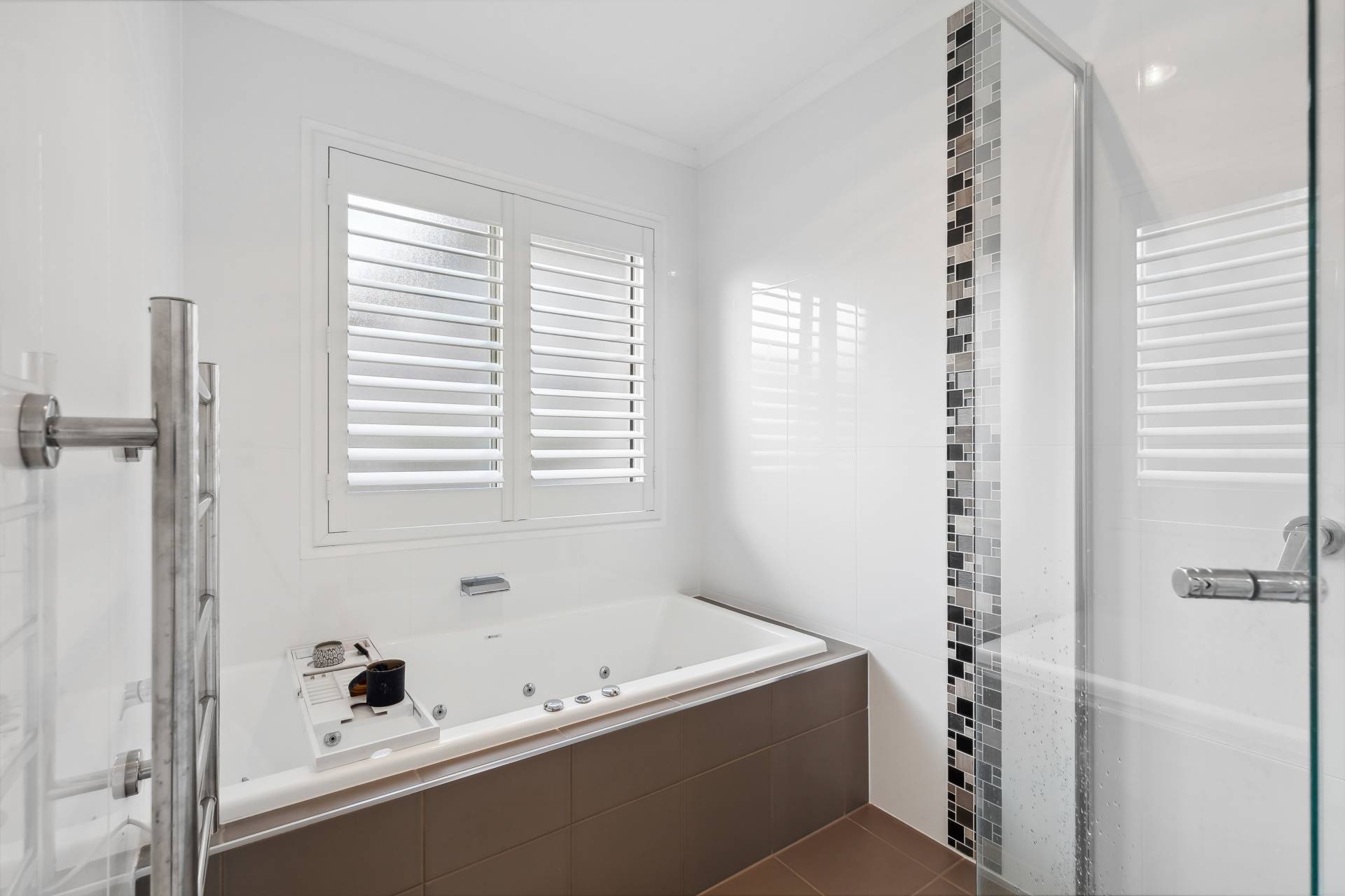 • Spacious master bedroom featuring plantation shutters, ceiling fan, split-system AC, WIR and gleaming ensuite with a spa bath