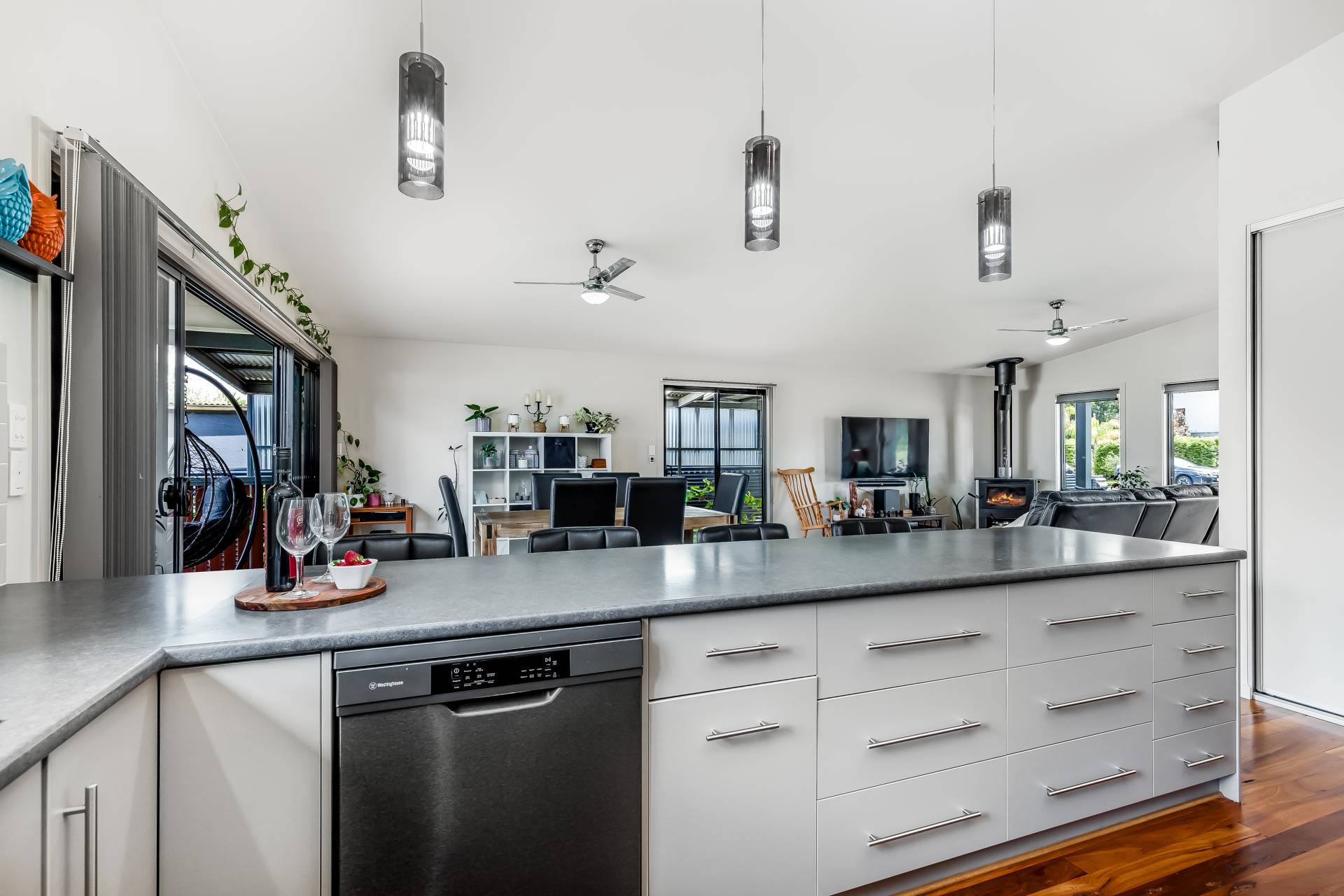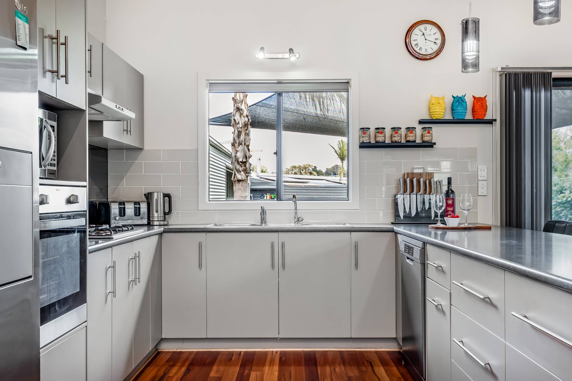 • Spacious foodie’s zone flush with sweeping bench tops for stress-free cooking, abundant cabinetry and cupboards, pendant lighting, gleaming stainless appliances including dishwasher, and lovely backyard views