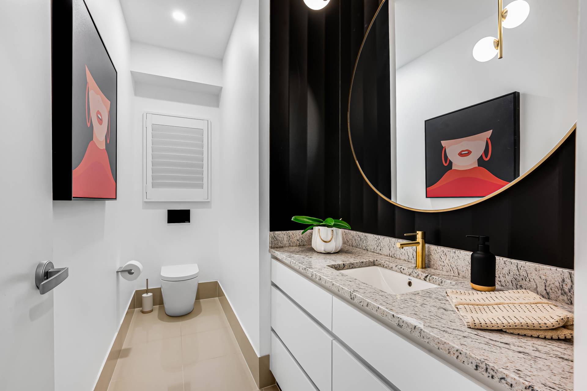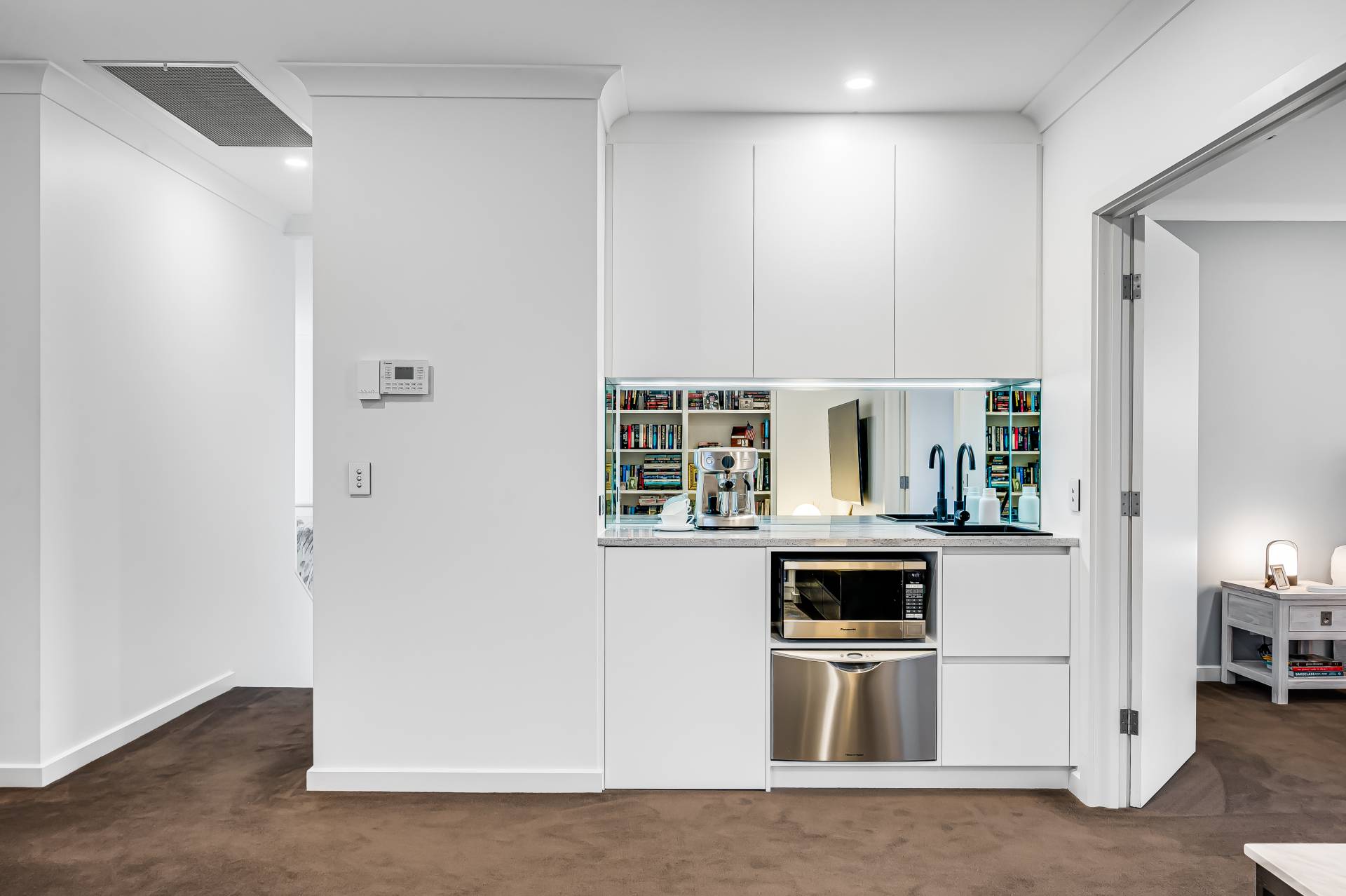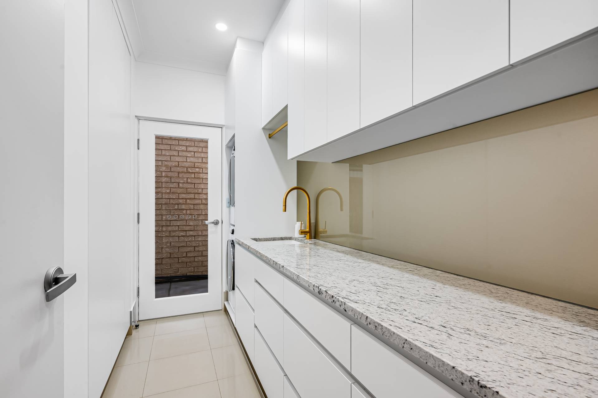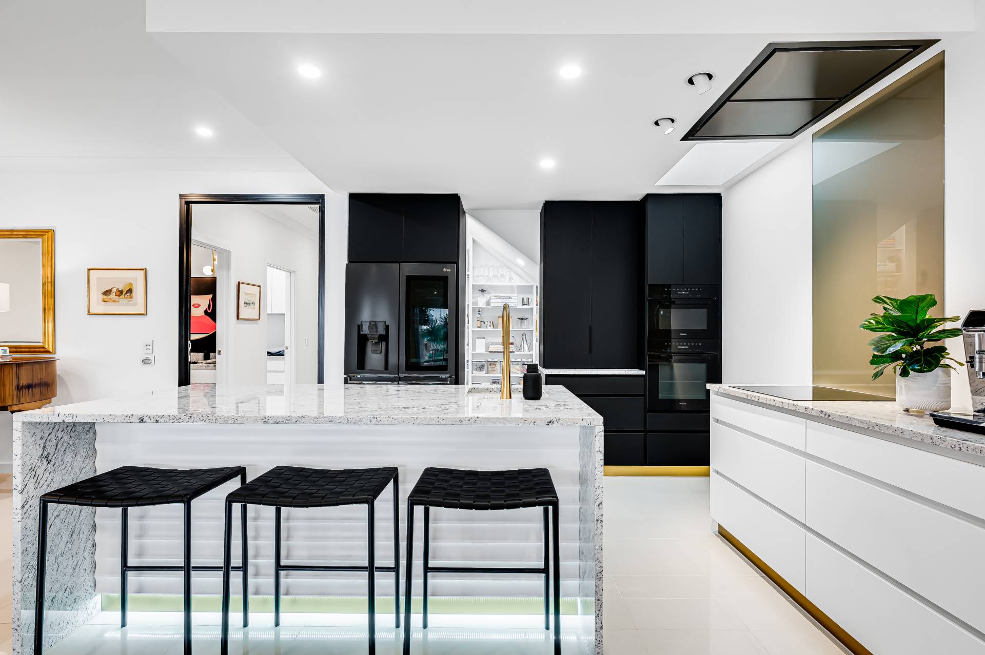 • Luxury chef’s zone featuring granite waterfall bench tops and island, sleek contrast cabinetry, brass fixtures, abundant cabinetry including WIP, and premium appliances