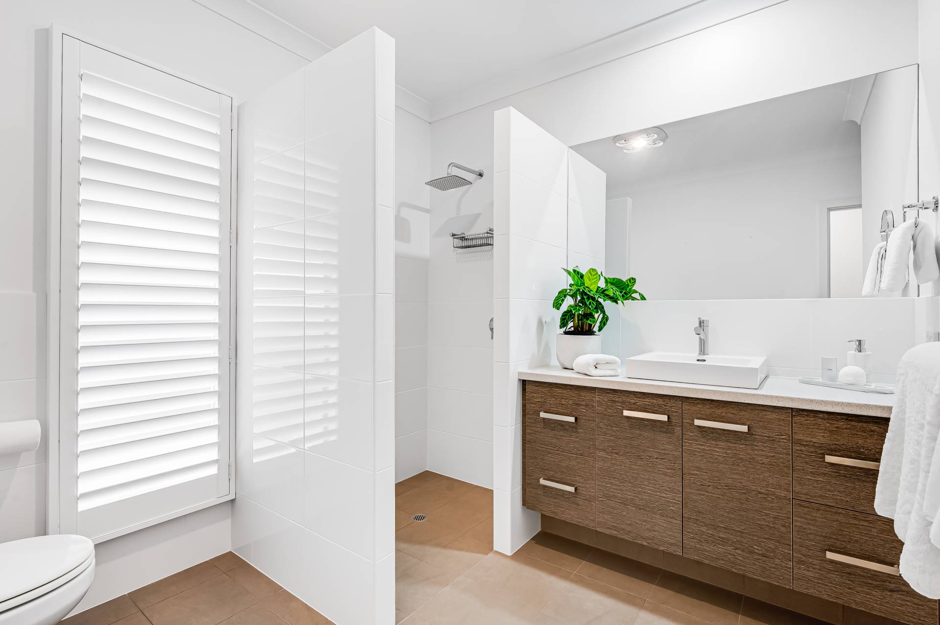 • Upstairs retreat with kitchenette including dishwasher, and sparkling bathroom featuring walk-in shower, heat lamps and plantation shutters