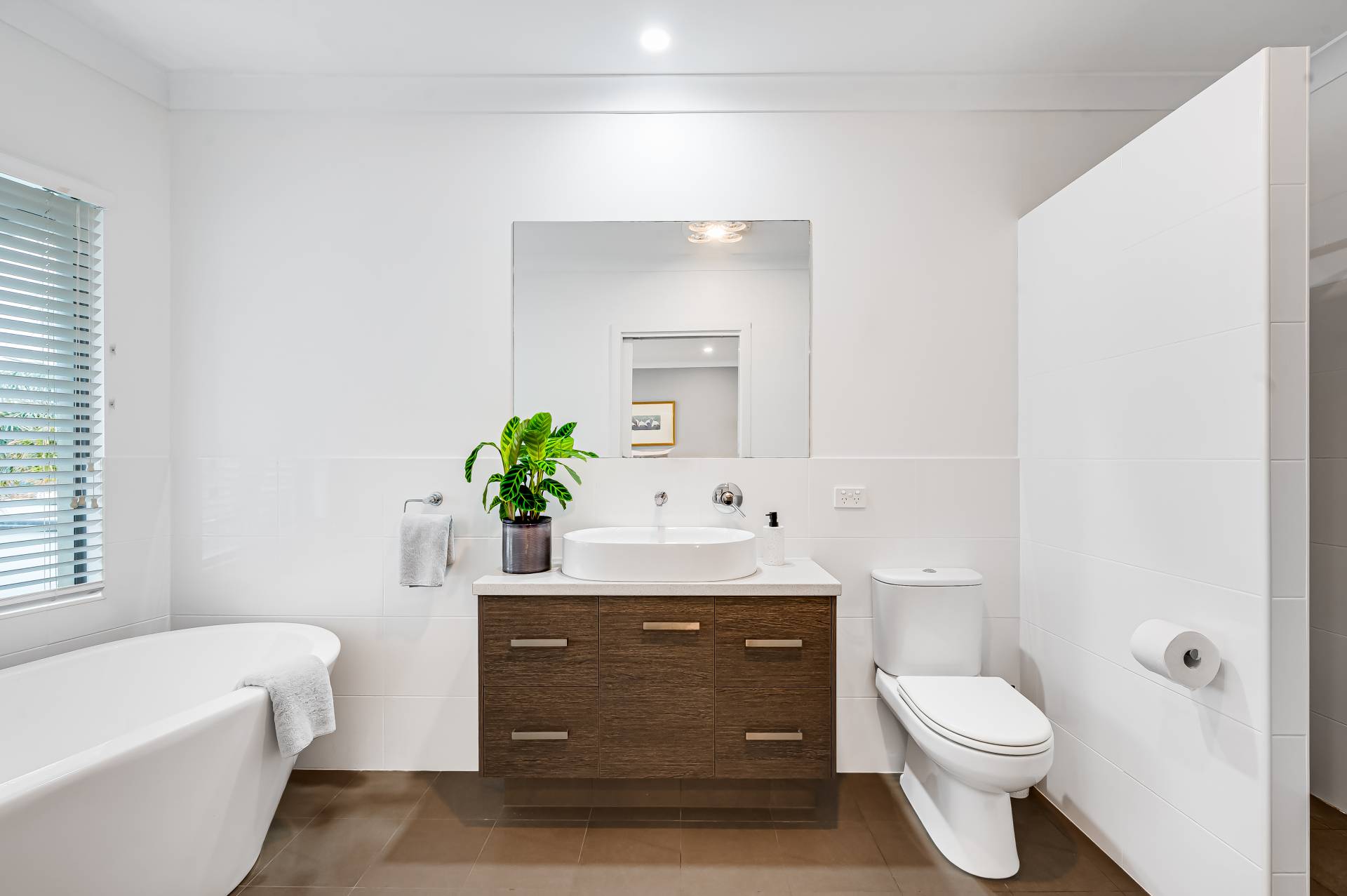 Tiptoe upstairs to the lofty relaxing retreat helmed by a savvy kitchenette, while 2 plantation-shuttered bedrooms bookend the well-conceived top floor that keeps the spectacular master perfectly private. Together with a panoramic east-facing balcony starting your day to utter perfection, elegant ensuite featuring sumptuous free-standing bath, and powerful ducted AC throughout powered by a bill-busting 46-panel solar system – the long-list of modern comforts combine for a magical seaside property primed for the brightest of futures whether you’re seeking that much sought-after holiday home or a new South Coast chapter with the whole family.