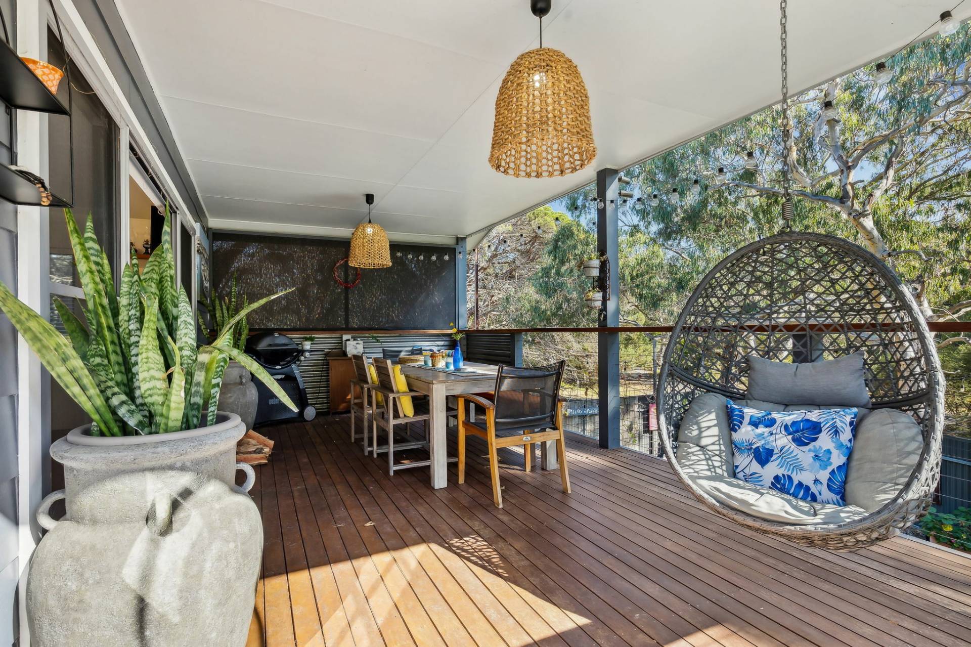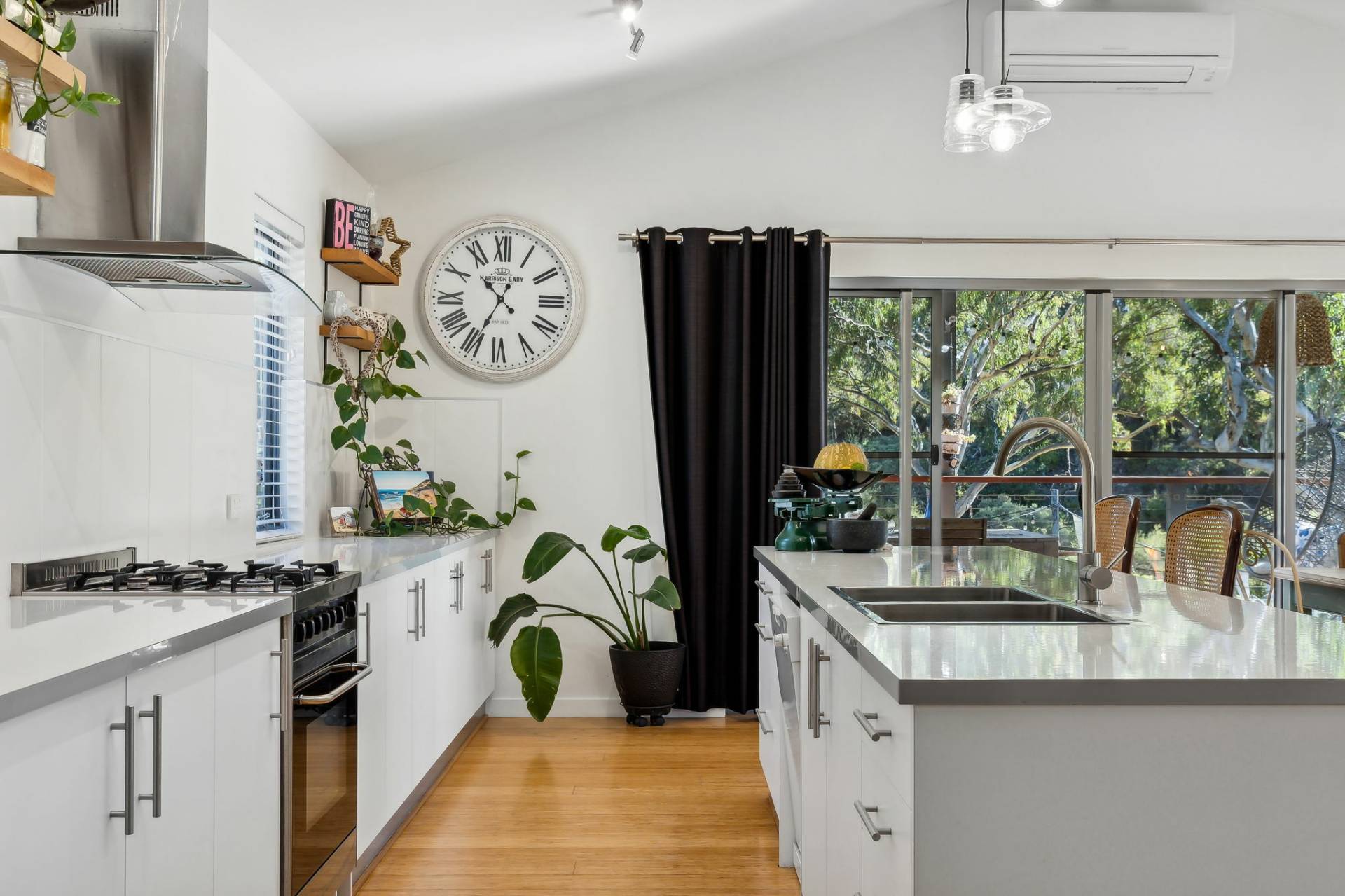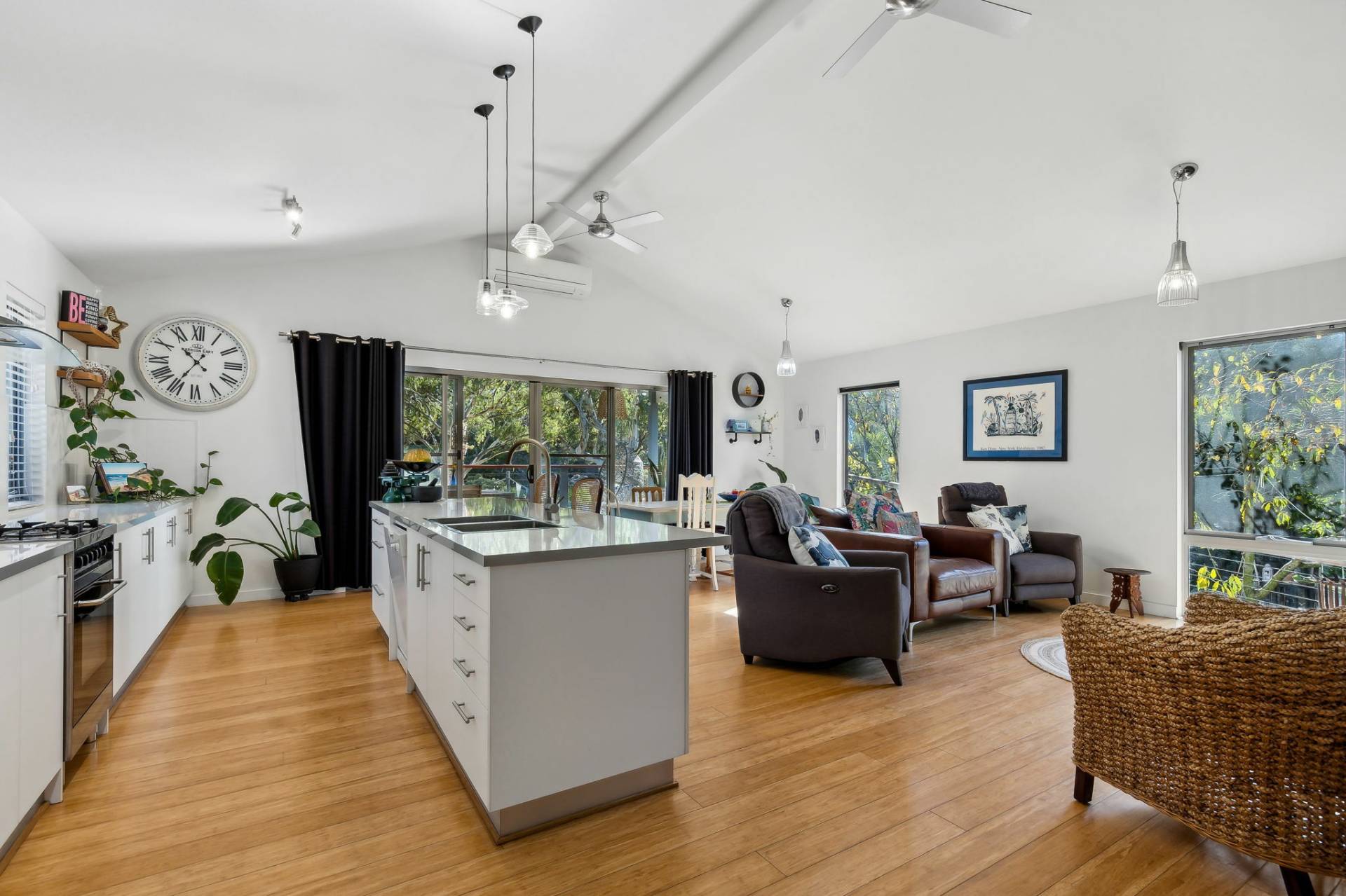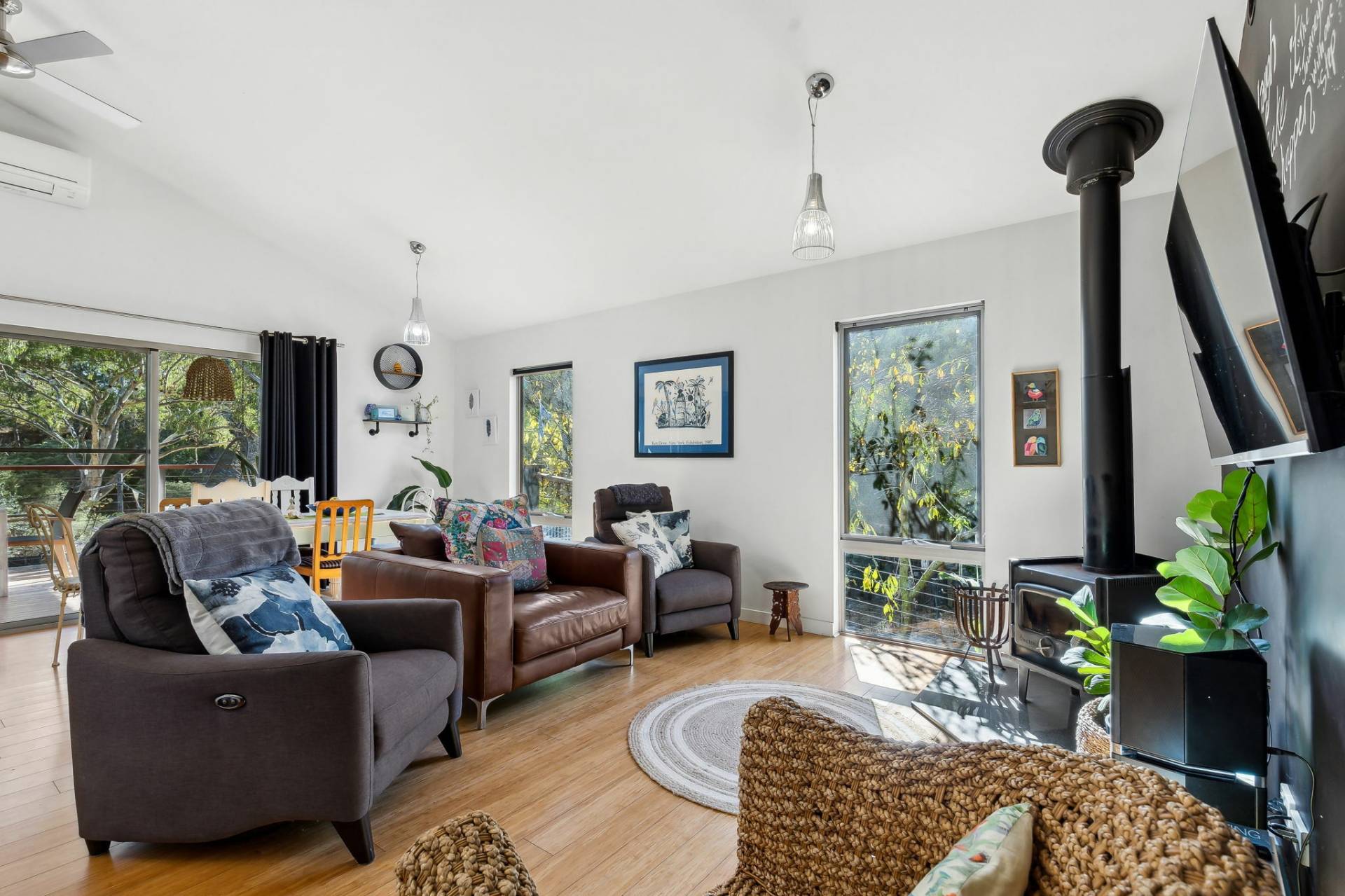 A big timber deck extends off the family/dining area and catering to gatherings out here will be super-easy from a well-appointed kitchen with a gas cooker, dishwasher, walk-in pantry, and a twinkling trio of pendant lights above the island bench. Equipped for all-season entertaining with a roof and its own set of pendant lights, the deck overlooks a magical grassy yard with raised veggie beds, an open-air firepit nook, and handy workshop, onto a forest of gorgeous gum trees in the reserve behind the back fence.