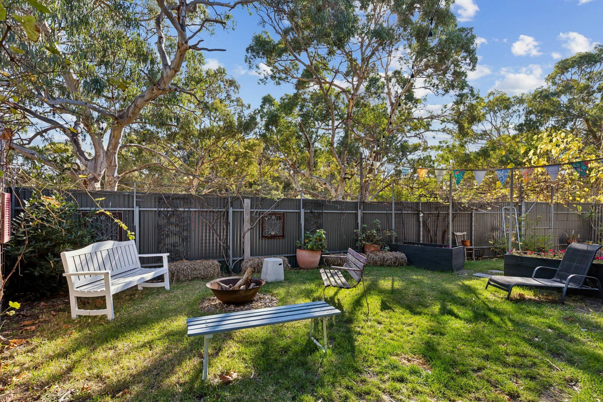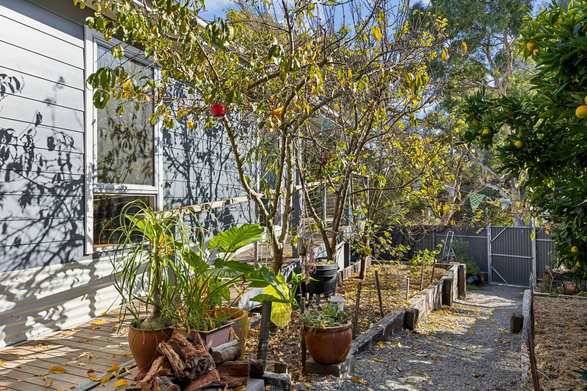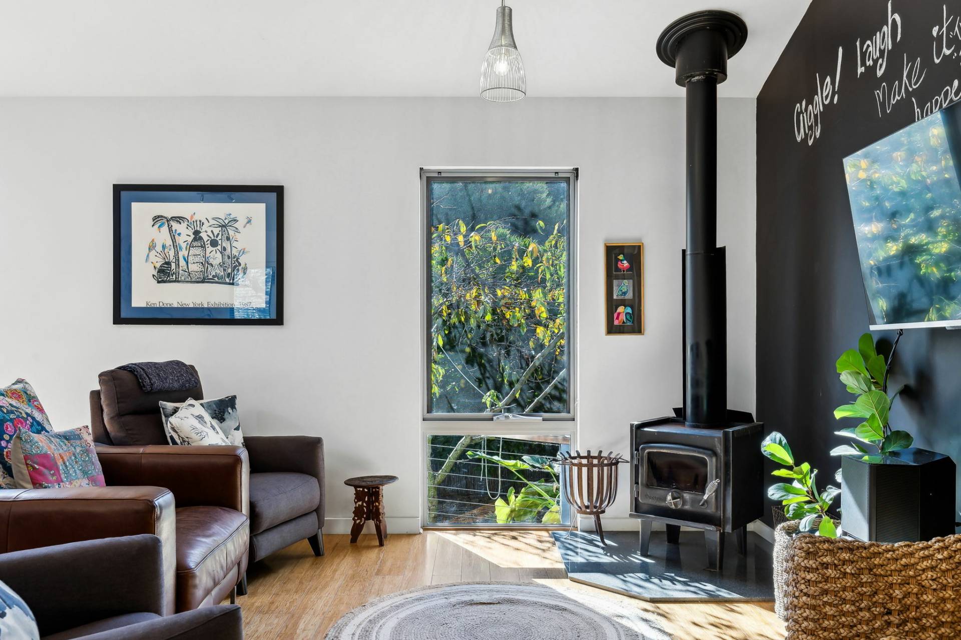 A big timber deck extends off the family/dining area and catering to gatherings out here will be super-easy from a well-appointed kitchen with a gas cooker, dishwasher, walk-in pantry, and a twinkling trio of pendant lights above the island bench. Equipped for all-season entertaining with a roof and its own set of pendant lights, the deck overlooks a magical grassy yard with raised veggie beds, an open-air firepit nook, and handy workshop, onto a forest of gorgeous gum trees in the reserve behind the back fence.