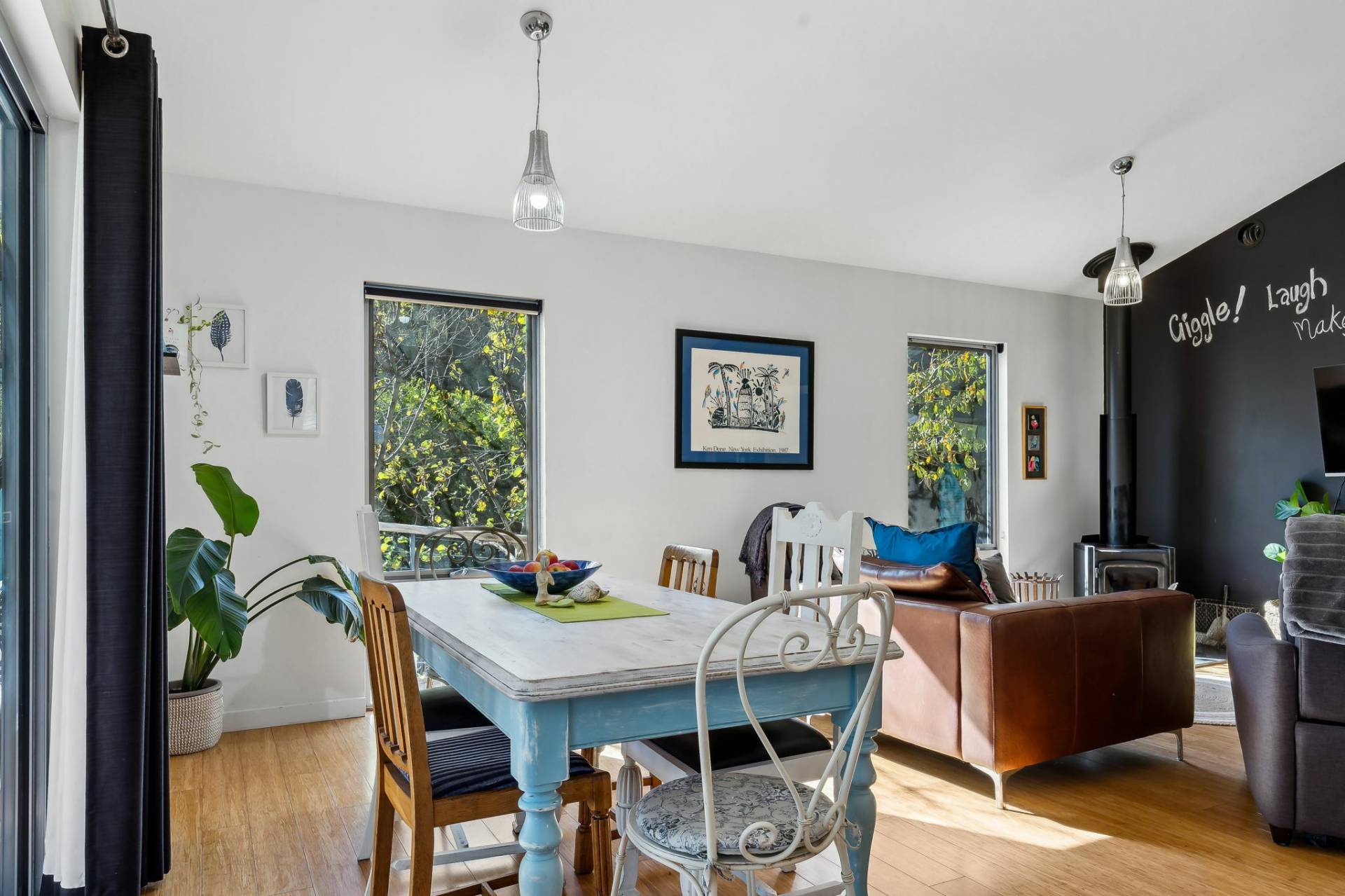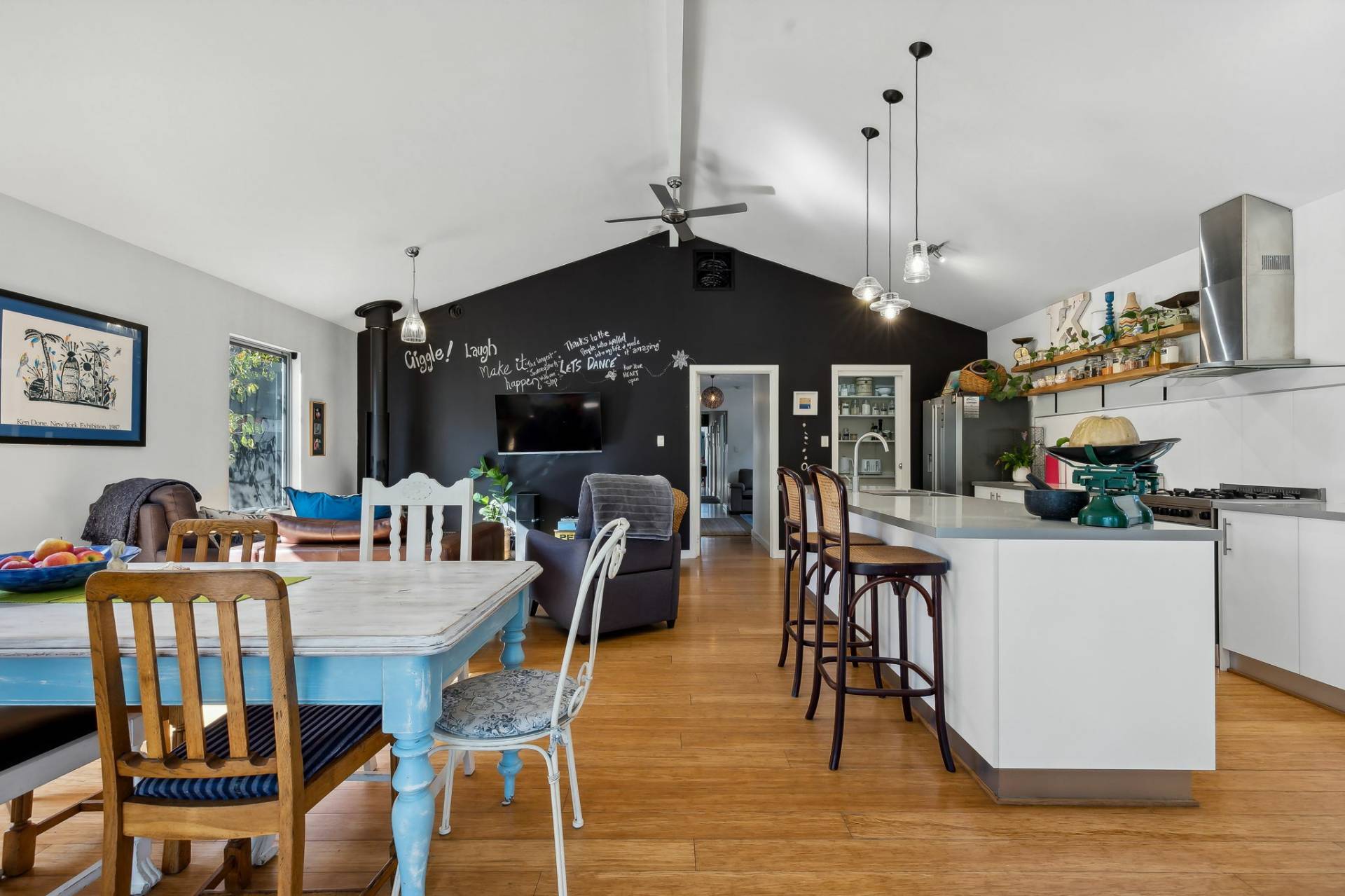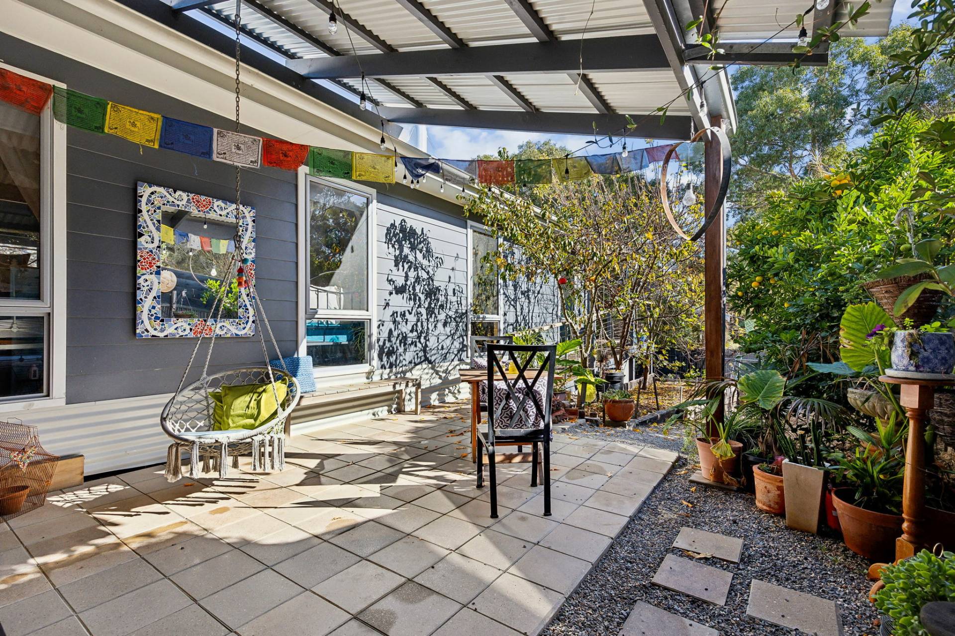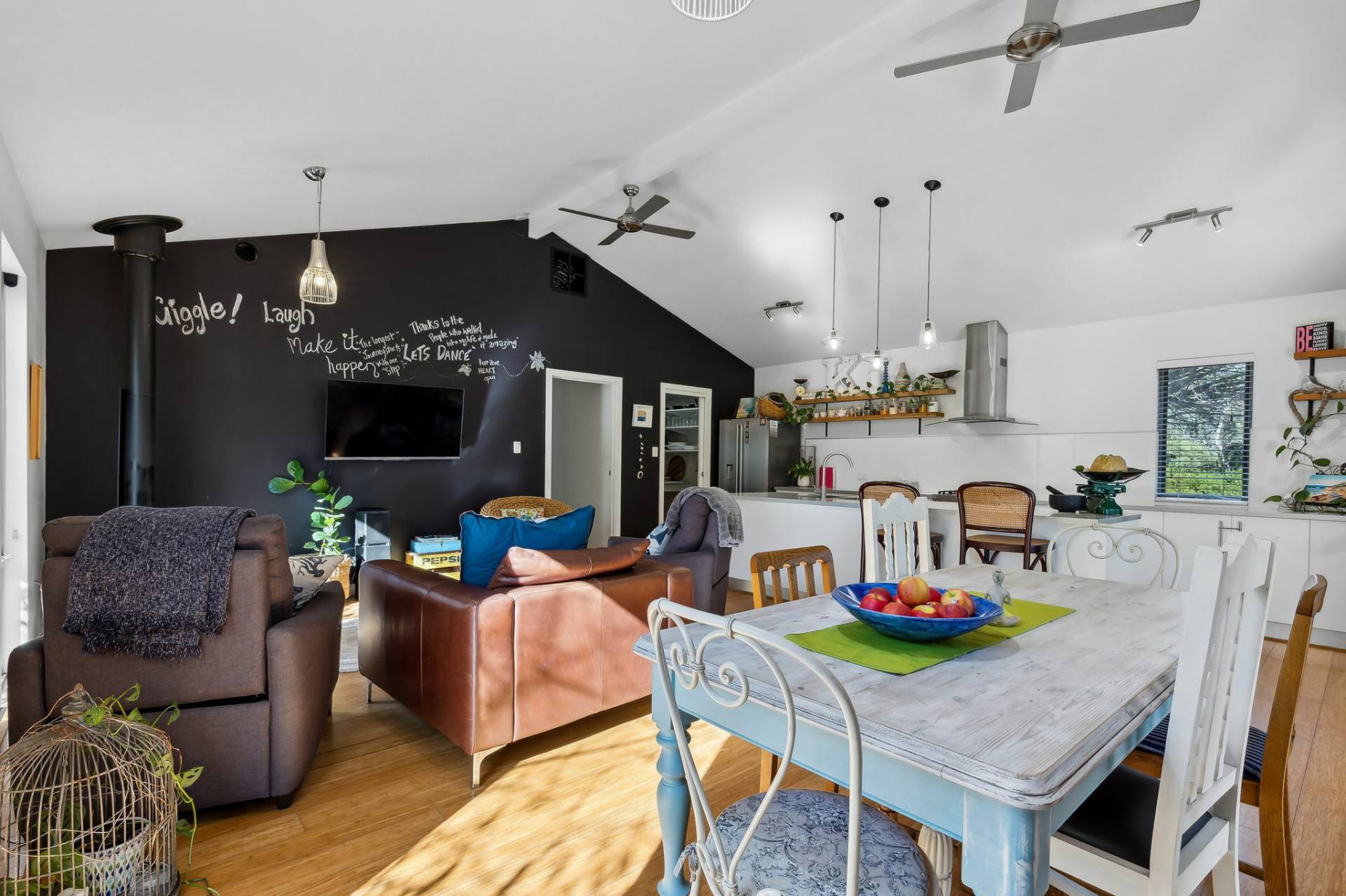A big timber deck extends off the family/dining area and catering to gatherings out here will be super-easy from a well-appointed kitchen with a gas cooker, dishwasher, walk-in pantry, and a twinkling trio of pendant lights above the island bench. Equipped for all-season entertaining with a roof and its own set of pendant lights, the deck overlooks a magical grassy yard with raised veggie beds, an open-air firepit nook, and handy workshop, onto a forest of gorgeous gum trees in the reserve behind the back fence.