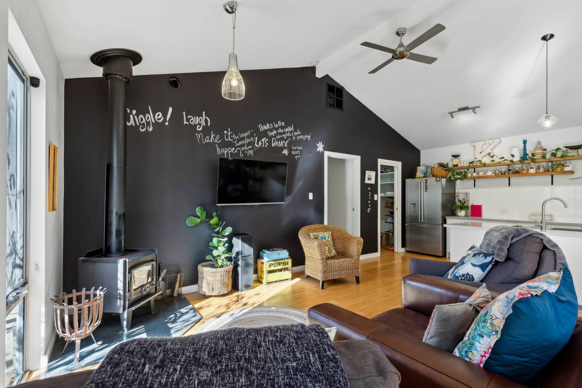 Angled roof lines softened by creeping vines create a striking first impression and you can easily imagine kicking off your sandals at the front door after a rejuvenating beach swim. Inside, honey-toned hybrid timber floors tempt you from the main entry and front living room down a central passageway, past an open lounge/rumpus, and through to a light-filled kitchen, family, and dining zone with soaring raked ceilings, fans to complement a wall-mounted AC unit, and a pot-belly-style fireplace to warm up cool winter evenings.