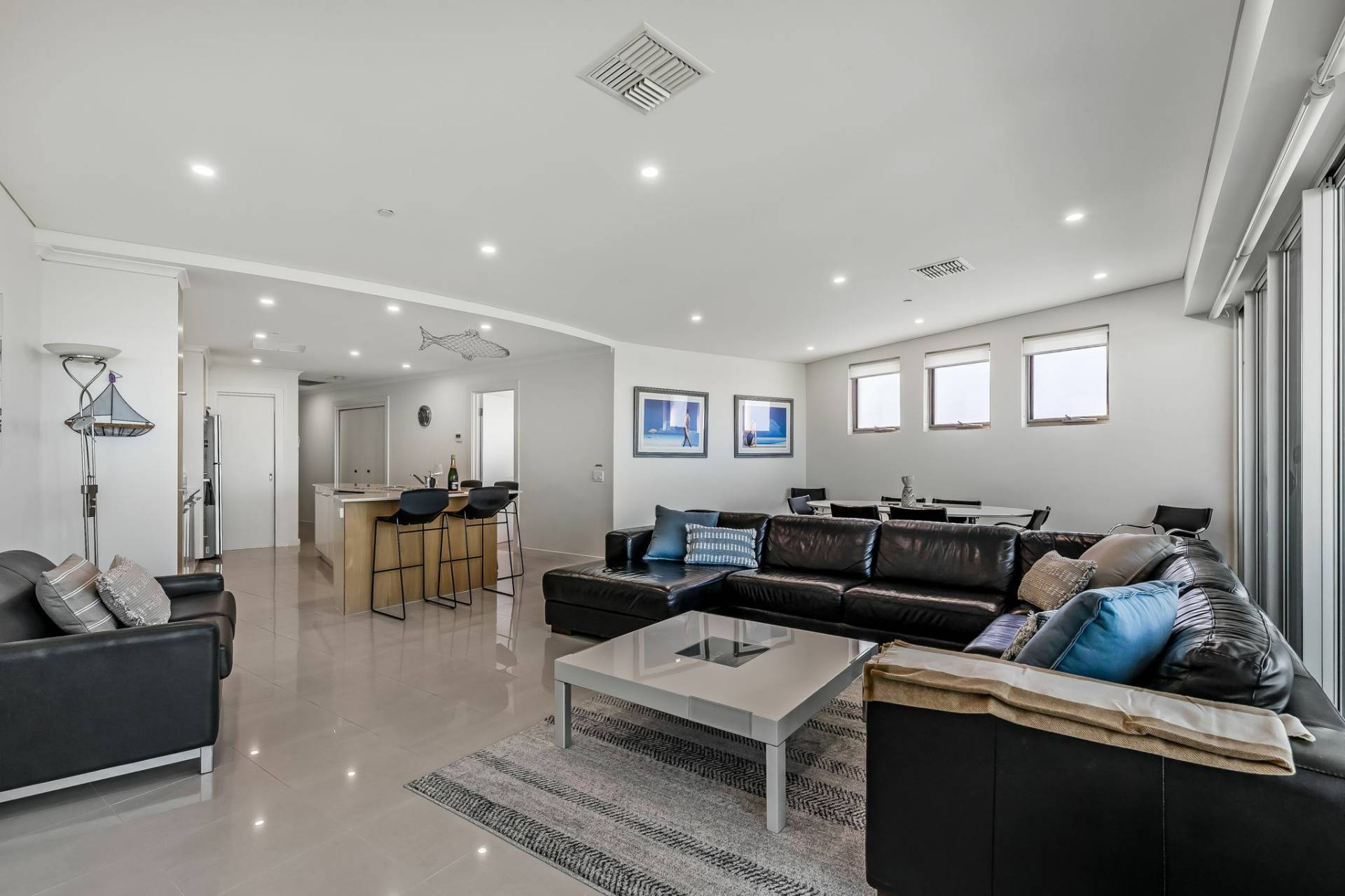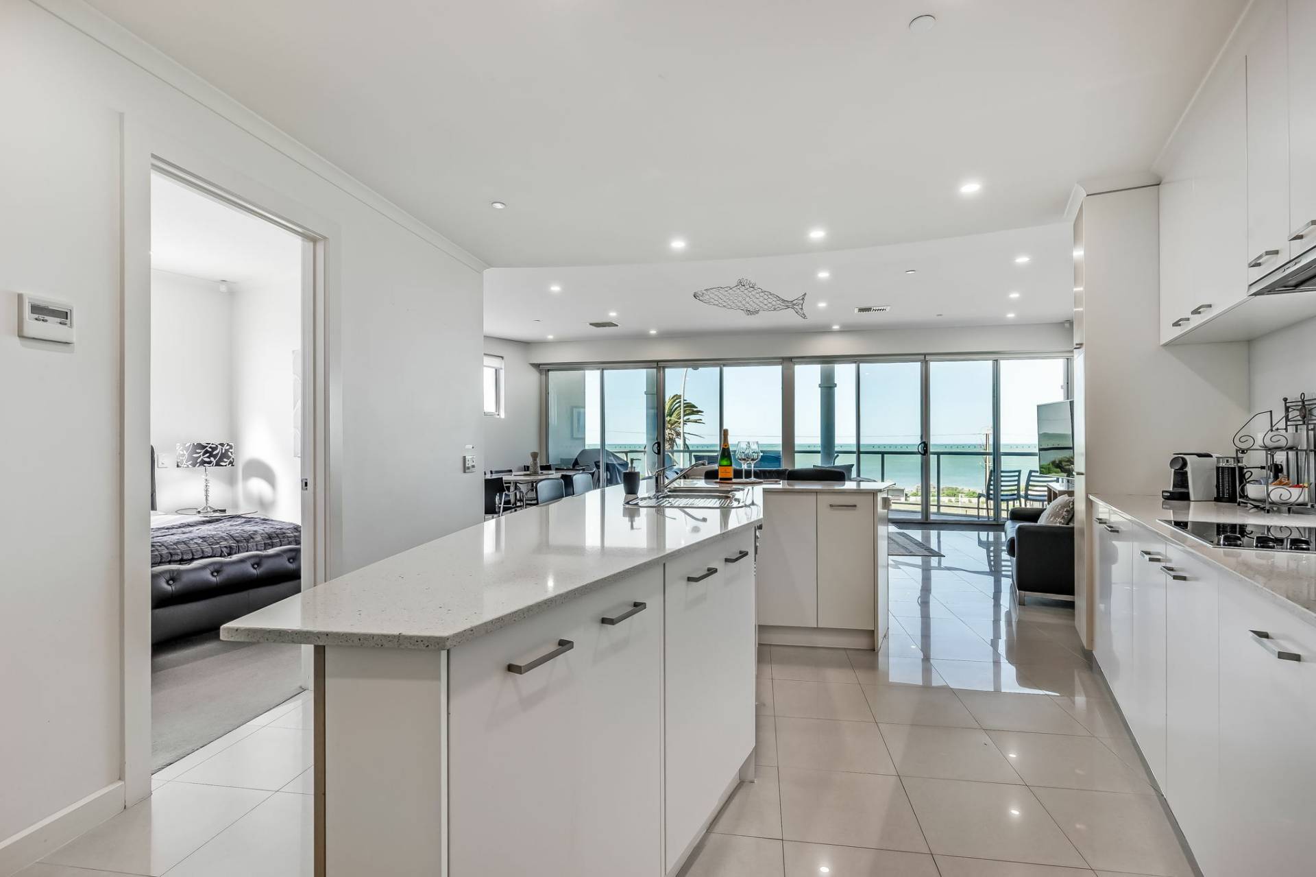 The open-plan kitchen, living, and dining area flows out to a private balcony, showcasing breathtaking views over Granite Island and the southern coastline. Large windows fill the space with natural light, while reverse-cycle heating and cooling ensure comfort all year round.