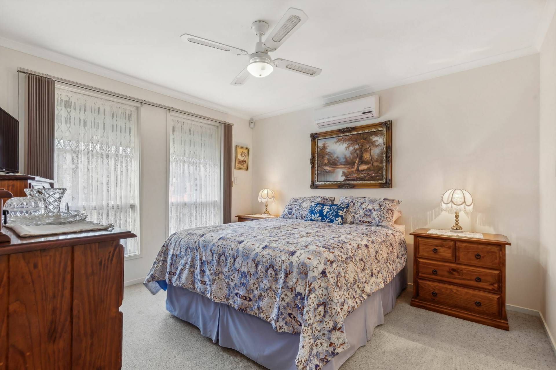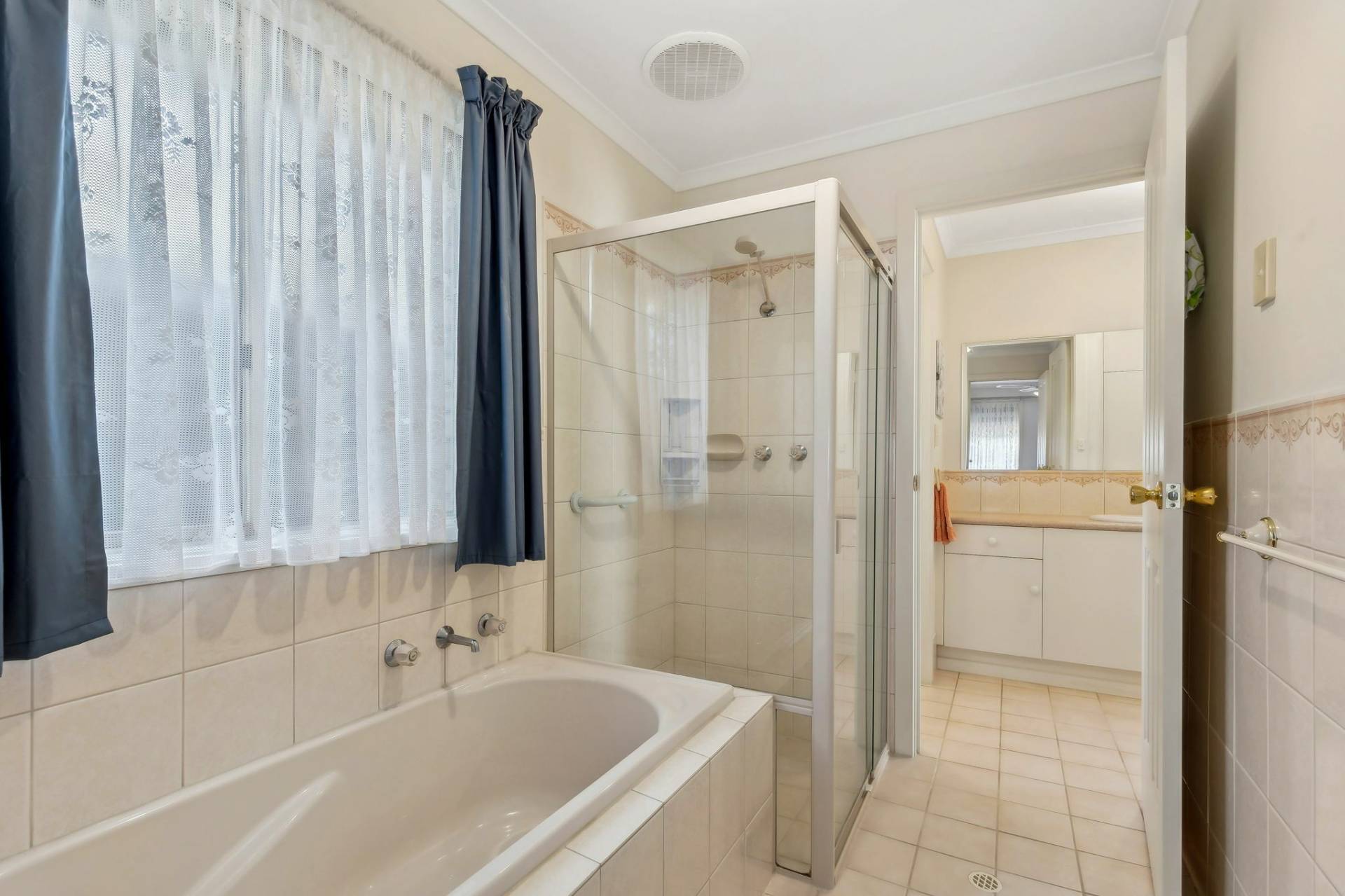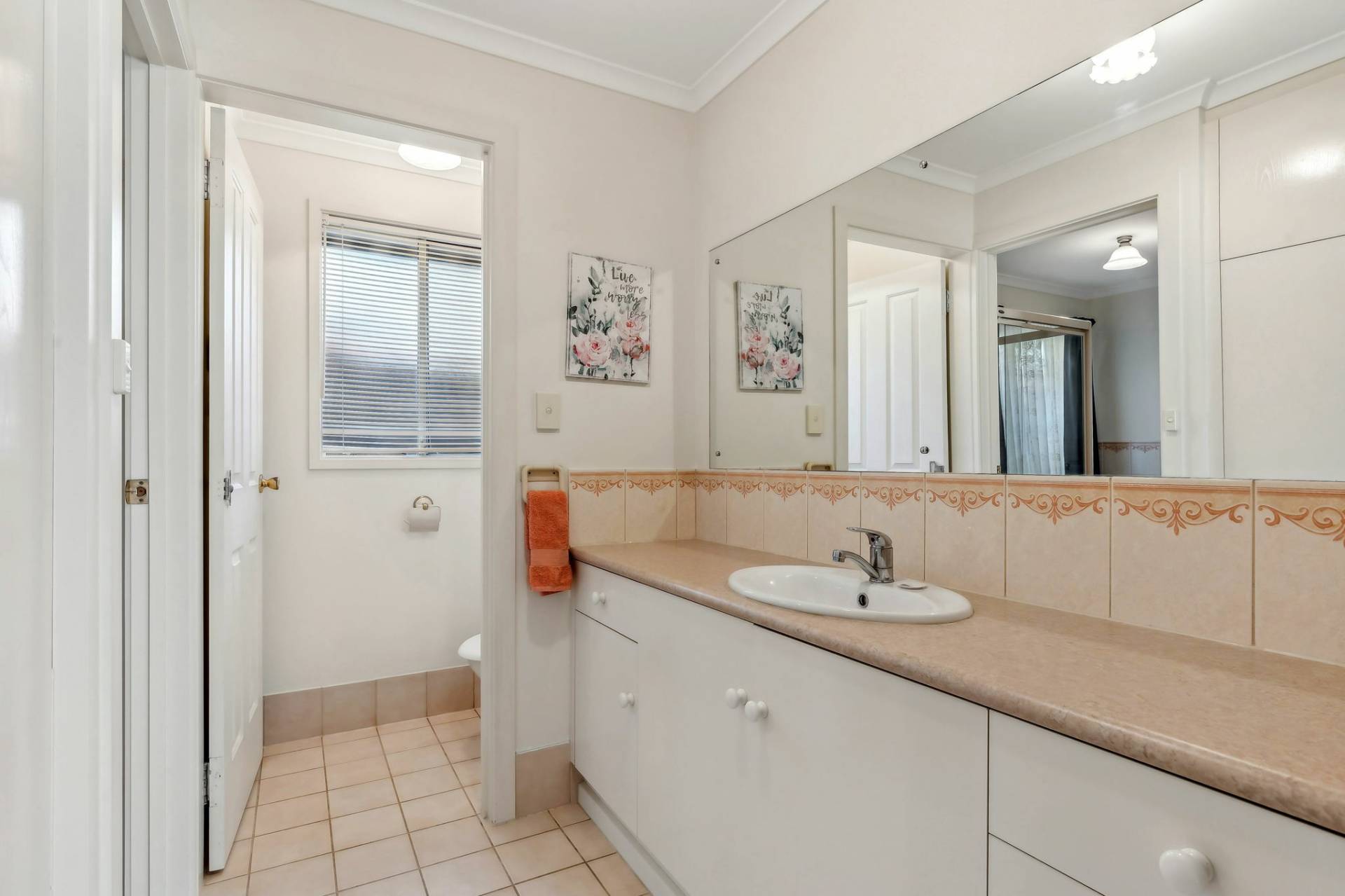 The property features three spacious bedrooms. The master bedroom, located at the front of the home, boasts a walk-in robe and private access to a two-way main bathroom. The bathroom offers the convenience of a separate bath, shower, toilet, and vanity area. A functional laundry with built-ins adds extra storage and practicality.