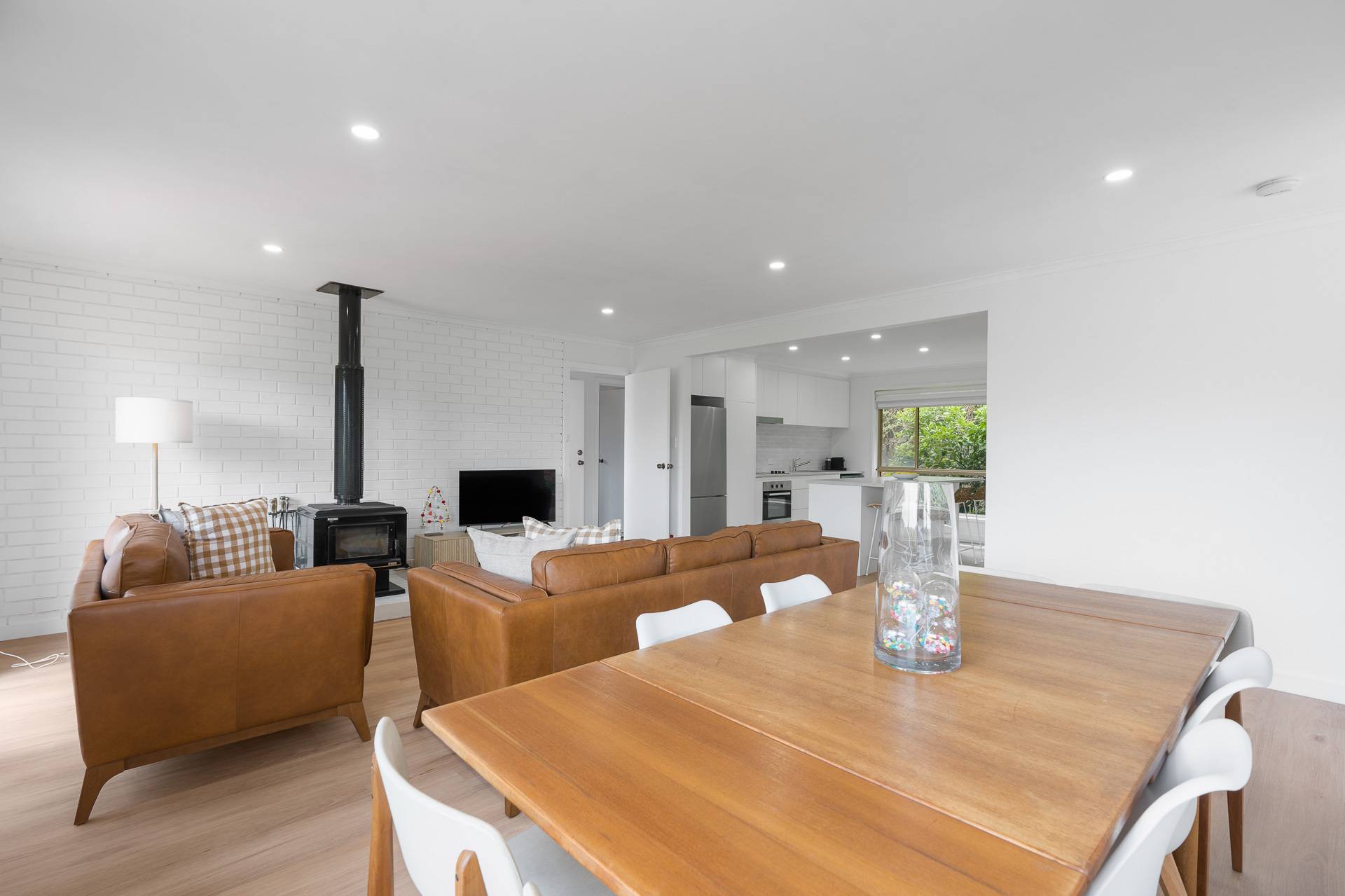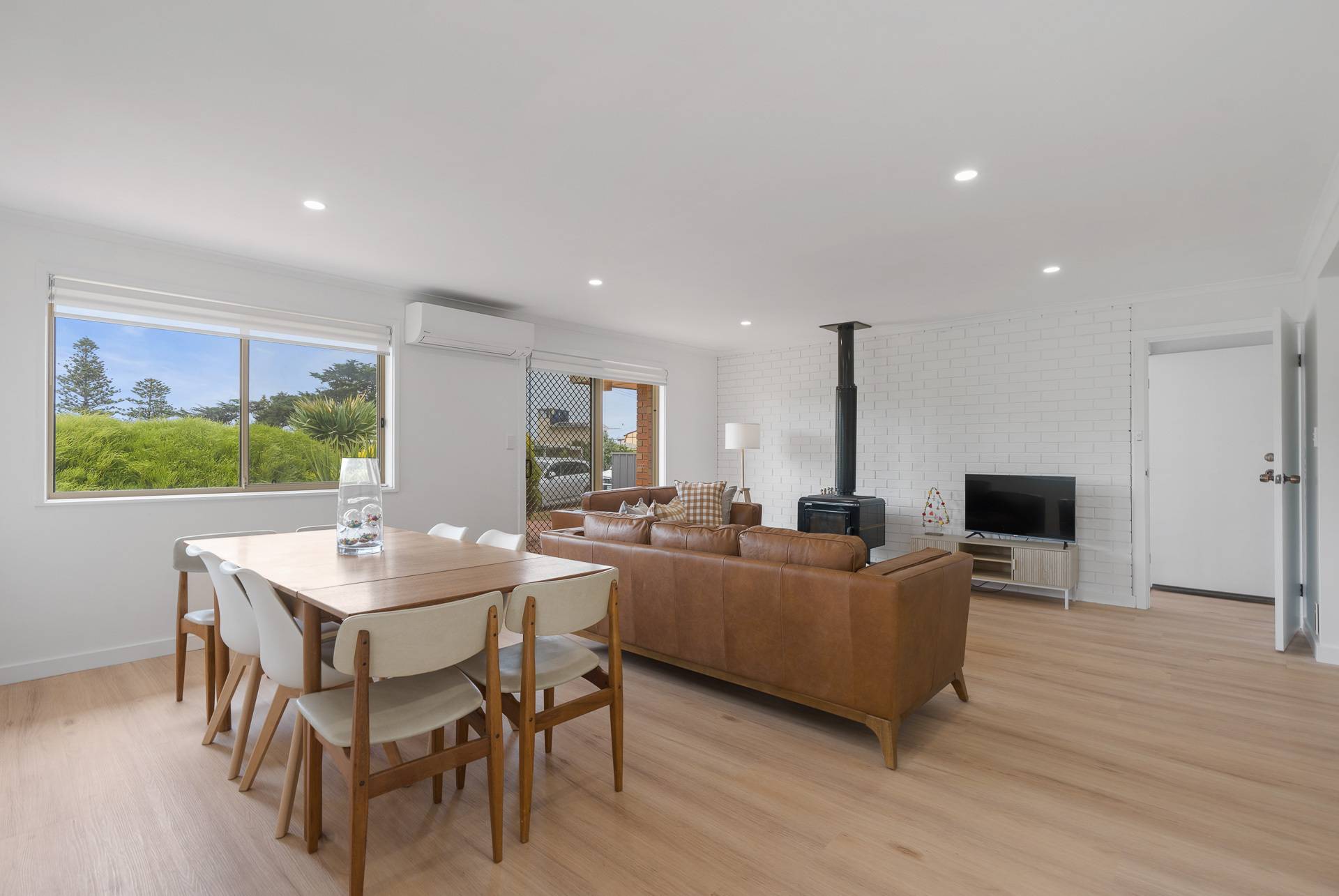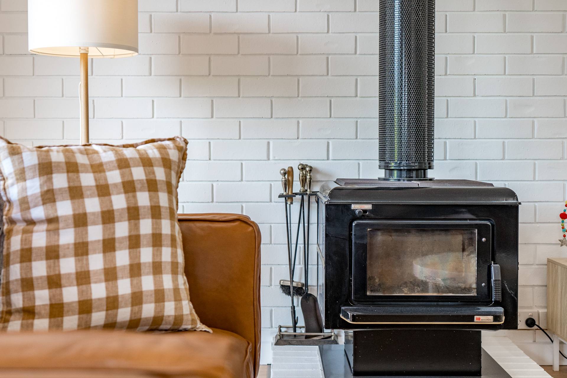 The open-plan kitchen, dining, and living area is the heart of the home, featuring a beautiful exposed brick wall with a cozy combustion fireplace. The newly renovated kitchen is well-equipped with ample cabinet storage, plenty of bench space for cooking or entertaining, electric appliances and ceiling fan.