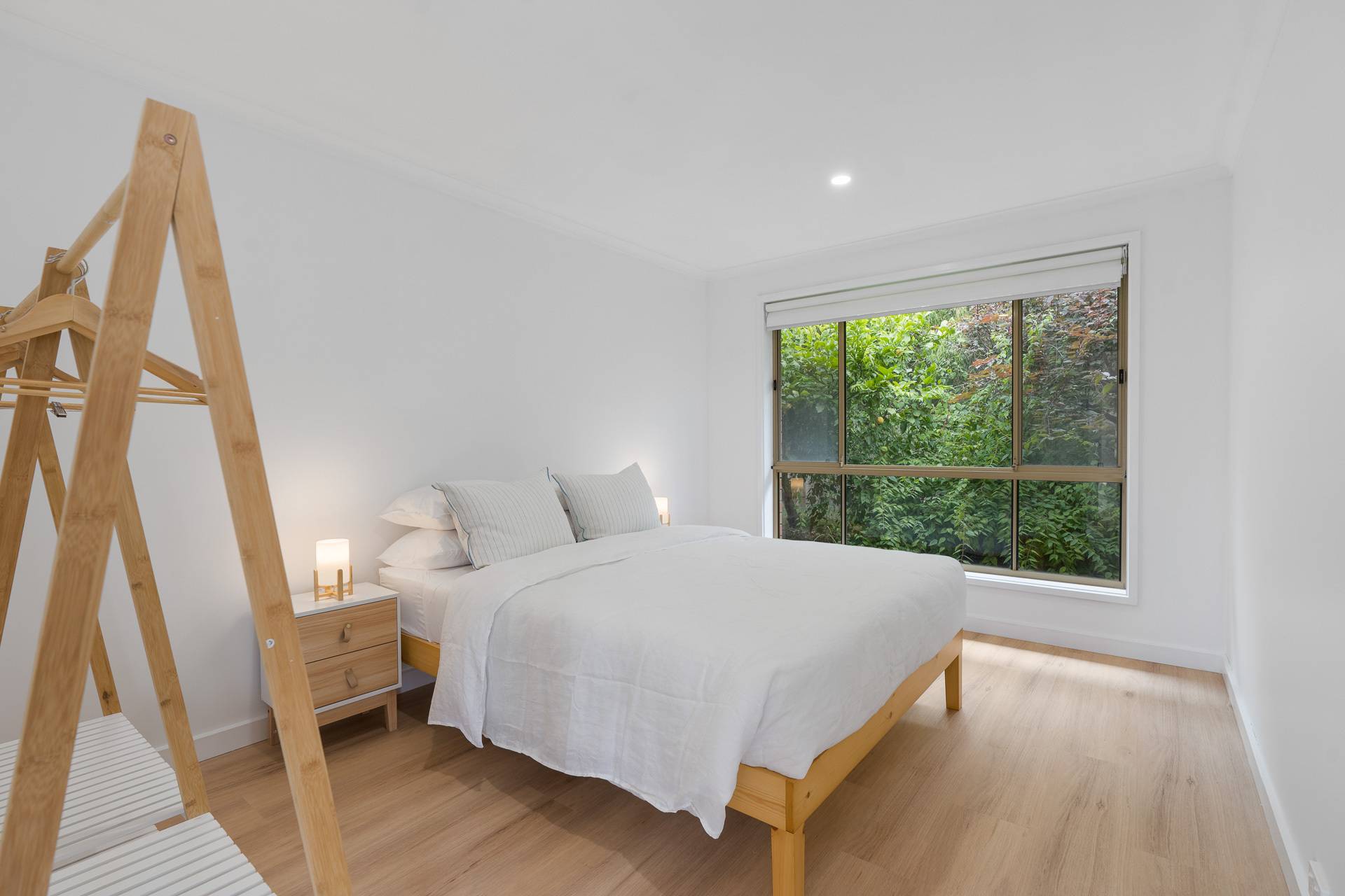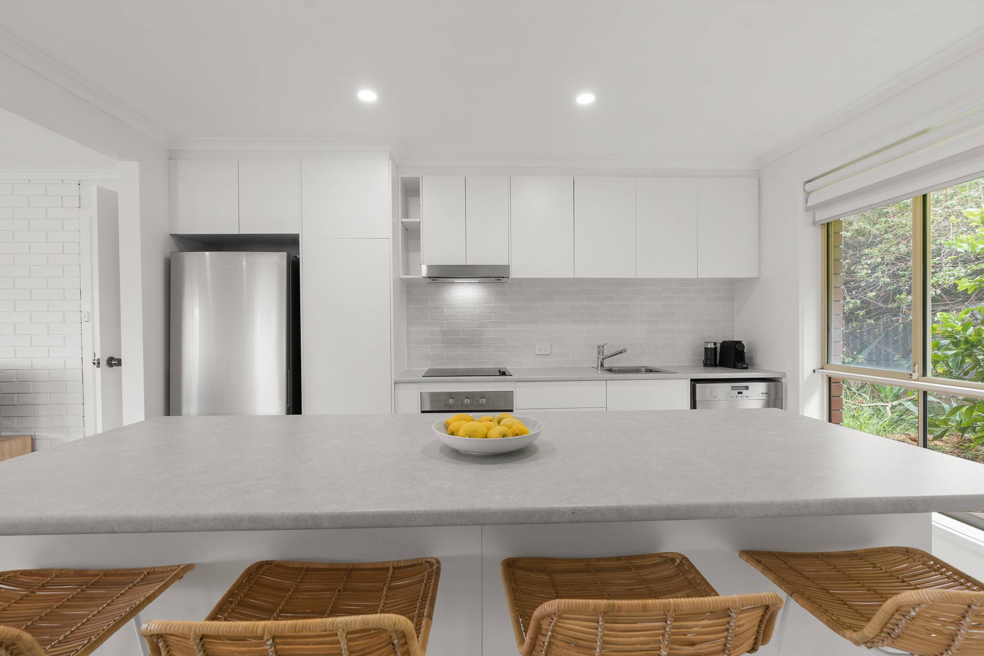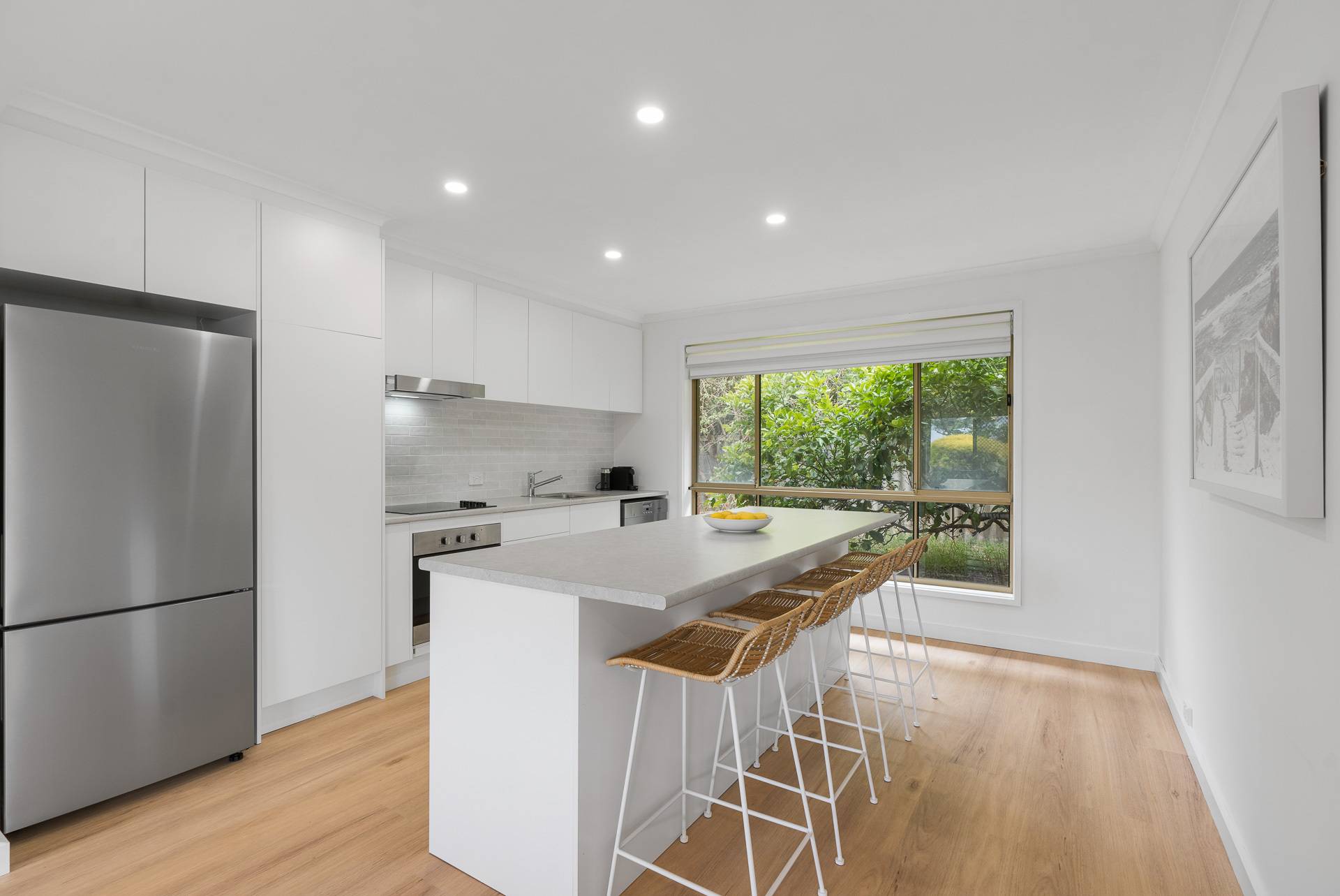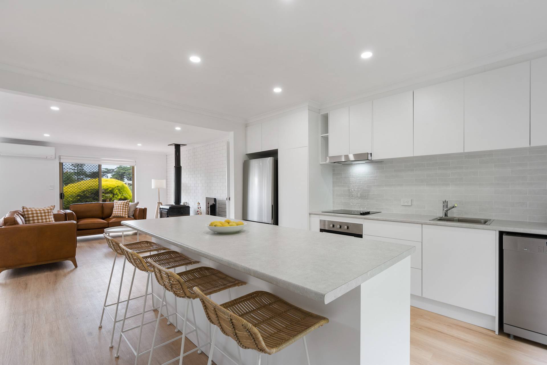 The open-plan kitchen, dining, and living area is the heart of the home, featuring a beautiful exposed brick wall with a cozy combustion fireplace. The newly renovated kitchen is well-equipped with ample cabinet storage, plenty of bench space for cooking or entertaining, electric appliances and ceiling fan.