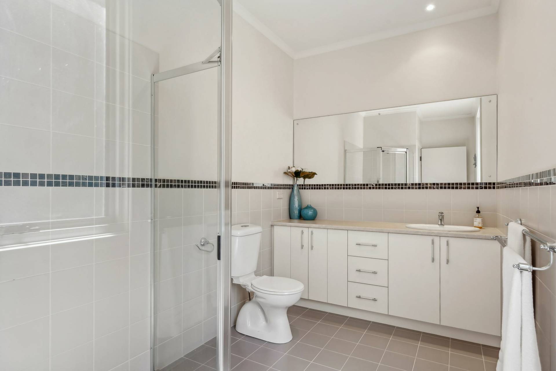 Master bedroom with built in robes and a bathroom. Kitchen includes stone benchtops, wall oven, microwave oven, filtered water tap and room for a large fridge.
