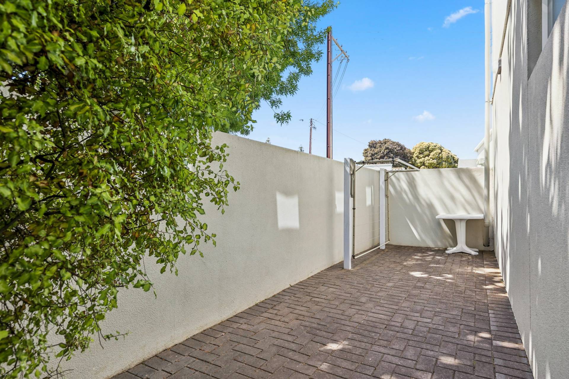Paved courtyard with clothes line.