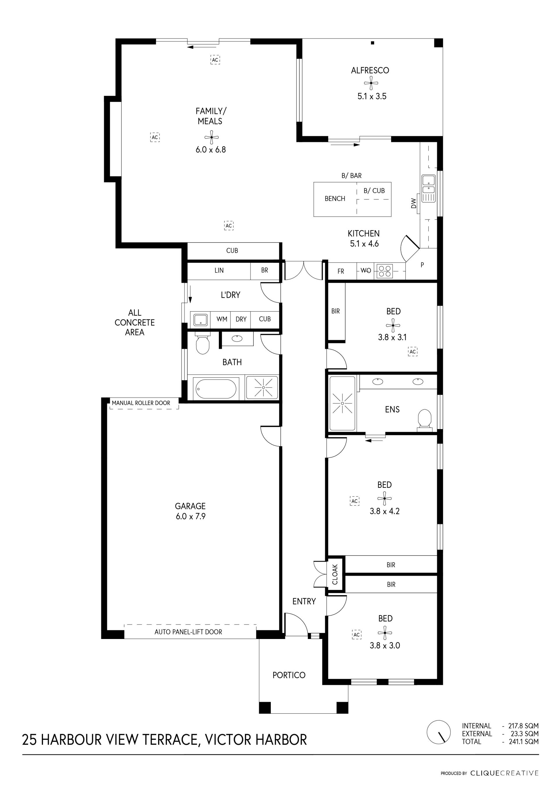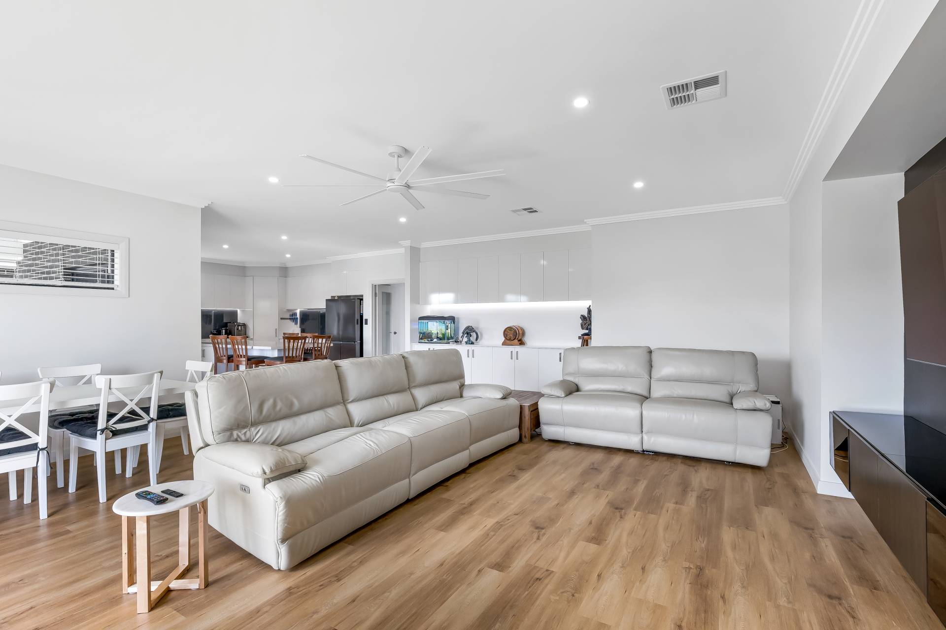 - Living area featuring an entertainment alcove that holds a 2.4 meter floating entertainment cabinet in the lounge & a 1800mm wide 6 blade multifunction ceiling fan / light