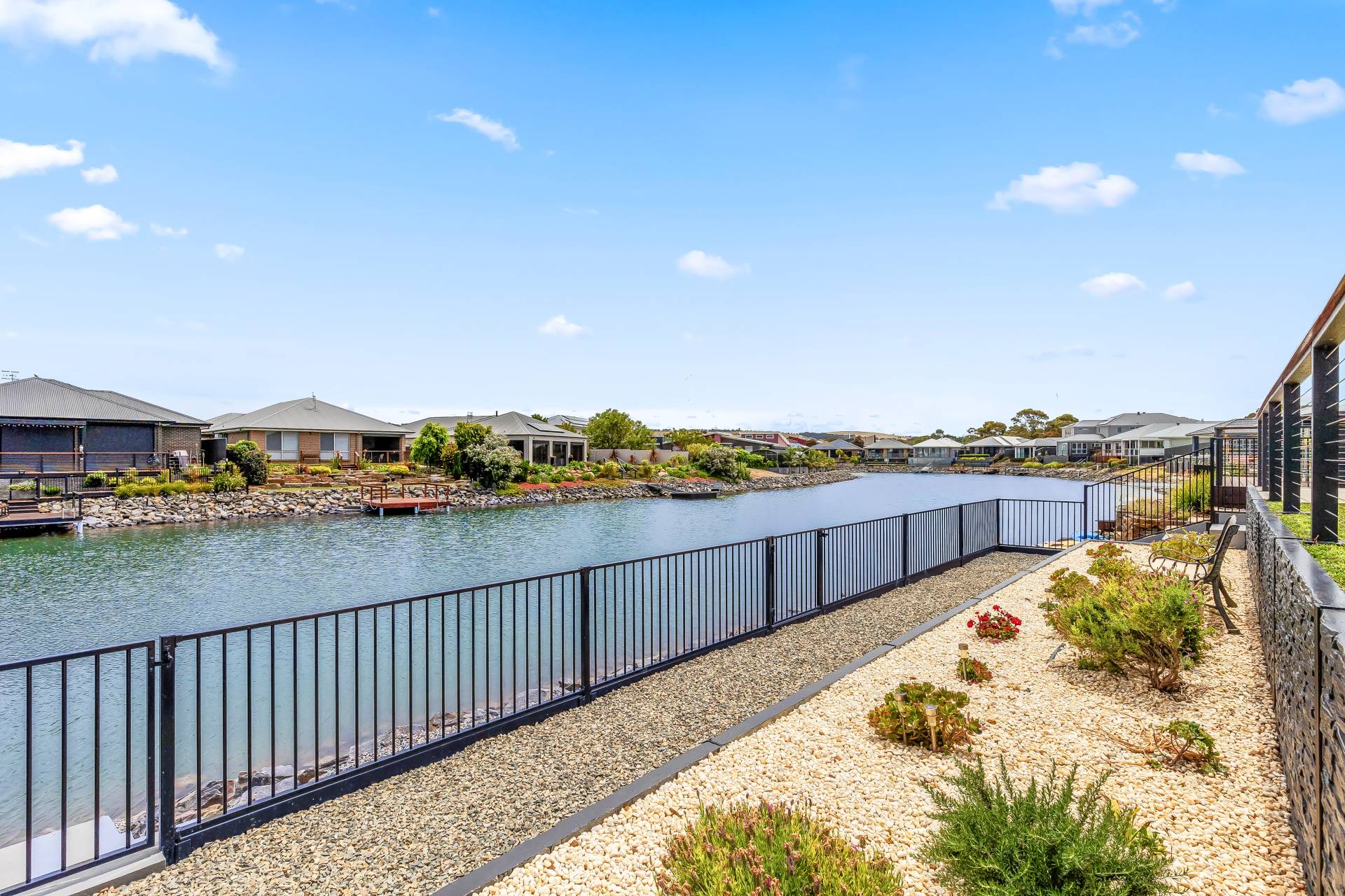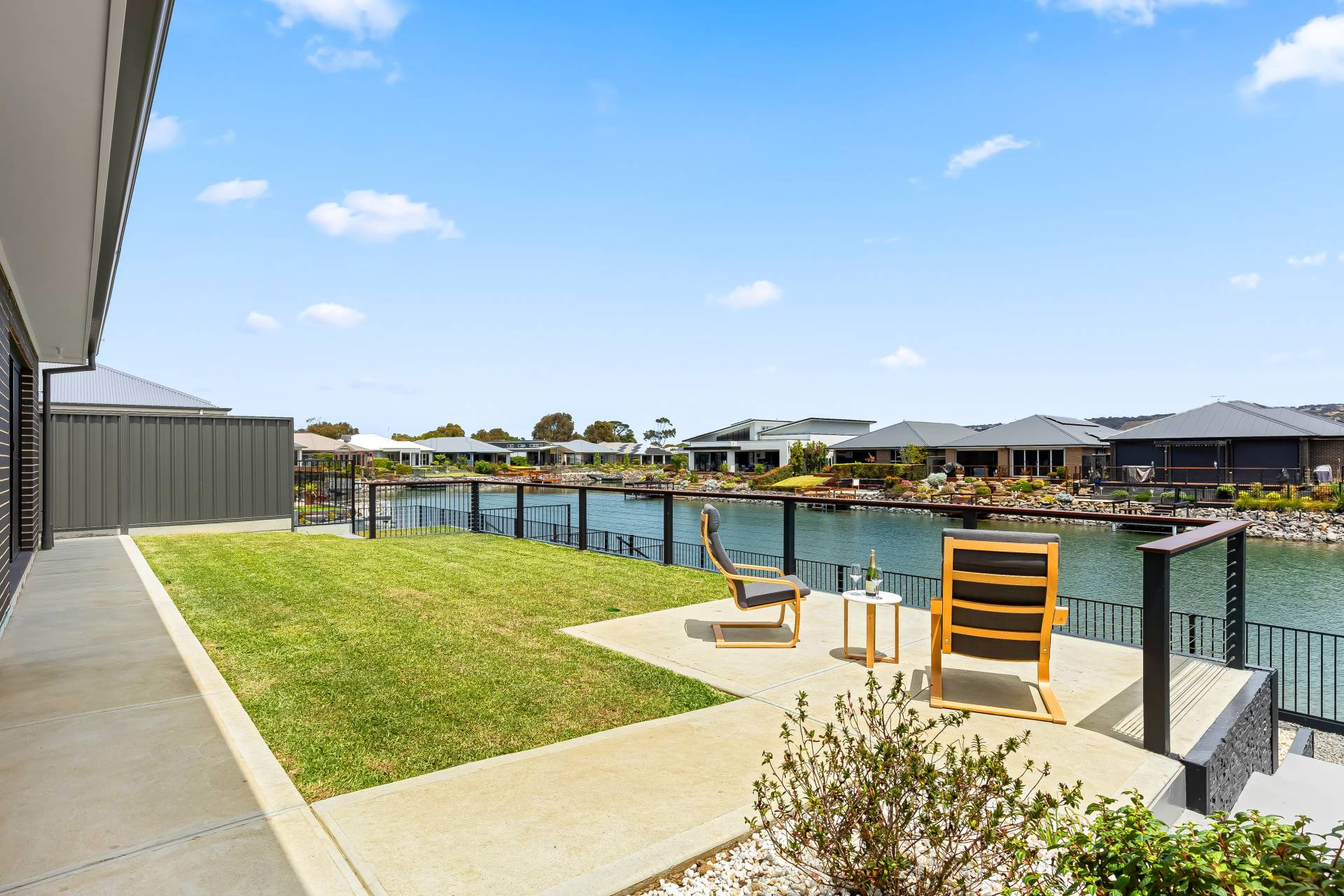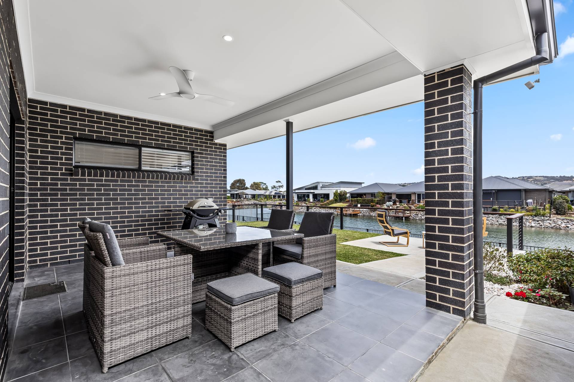− Tiled undercover alfresco and sunny patio with lawns and 180 waterfront views in tight-knit community