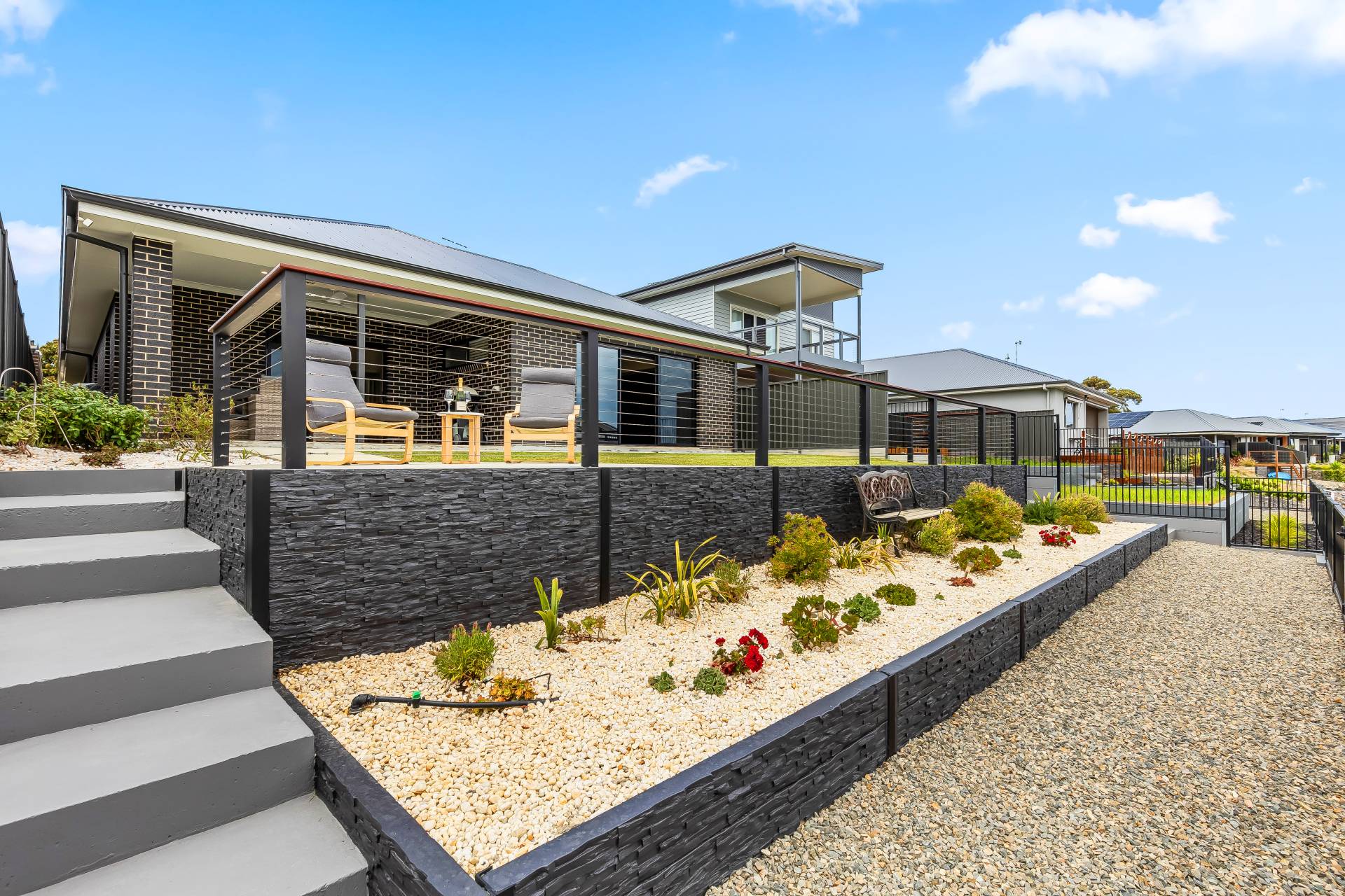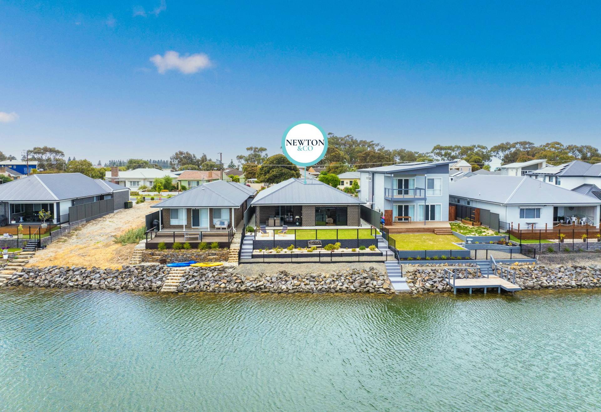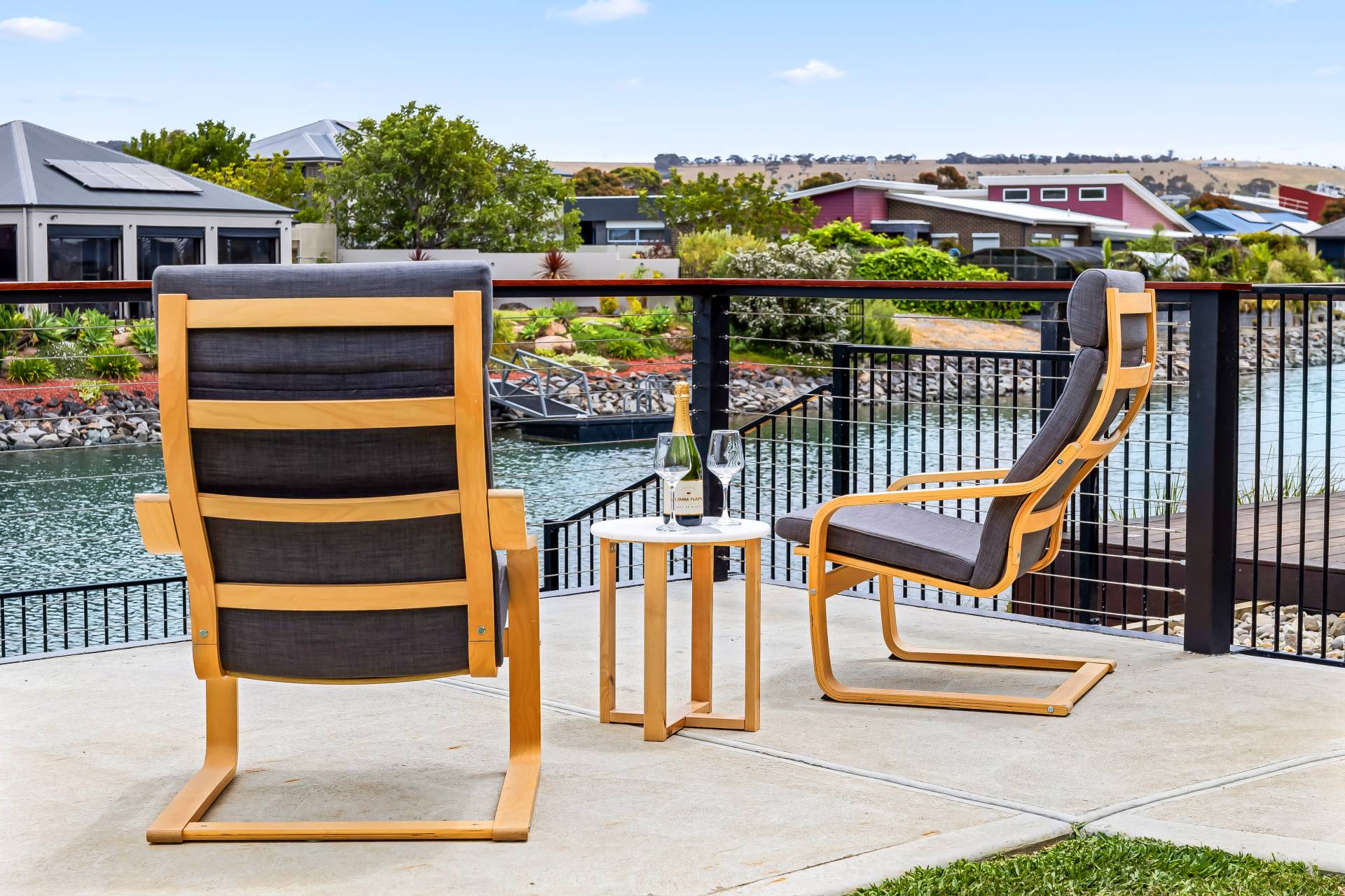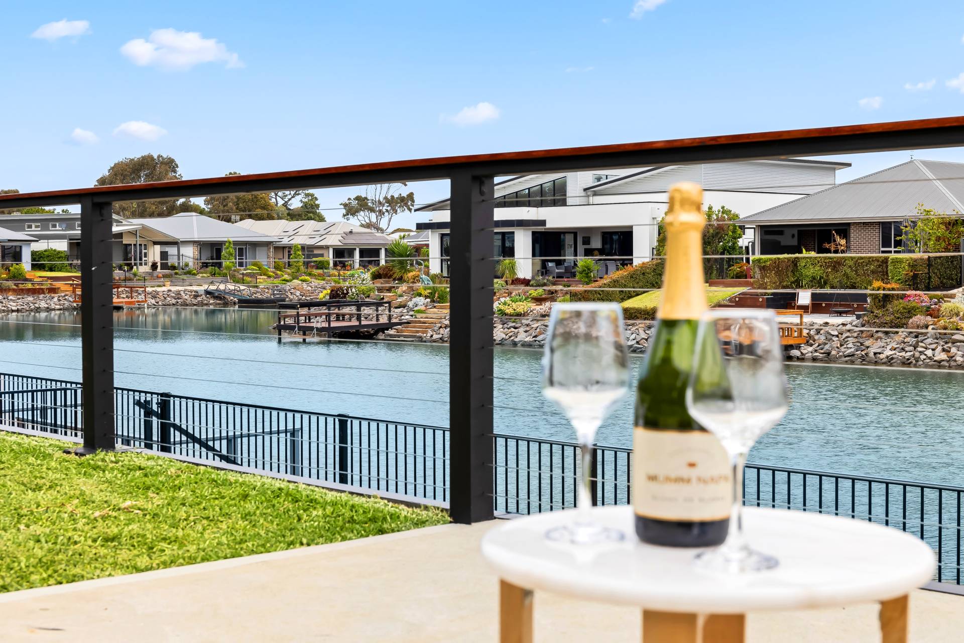 − Tiled undercover alfresco and sunny patio with lawns and 180 waterfront views in tight-knit community
