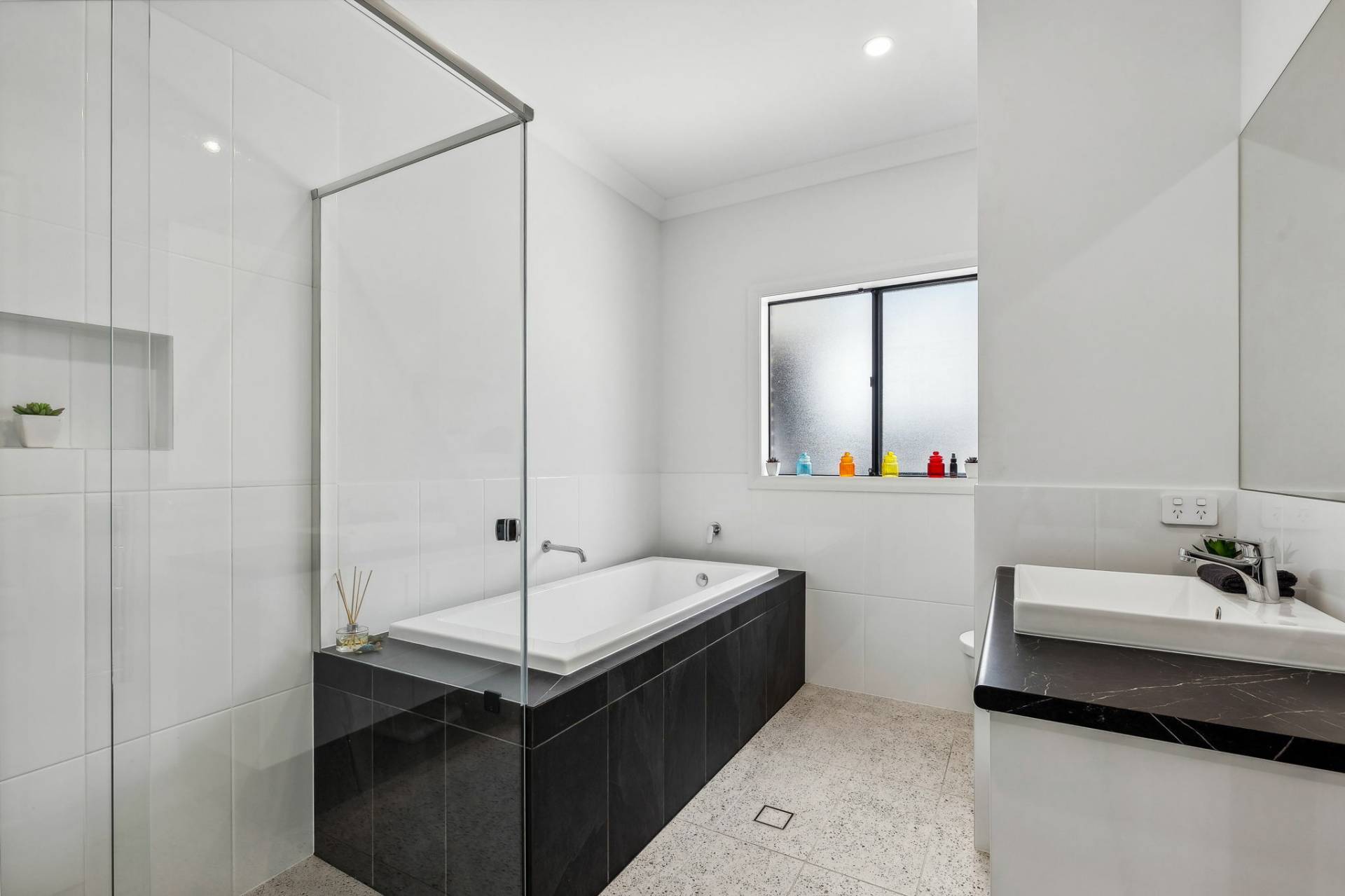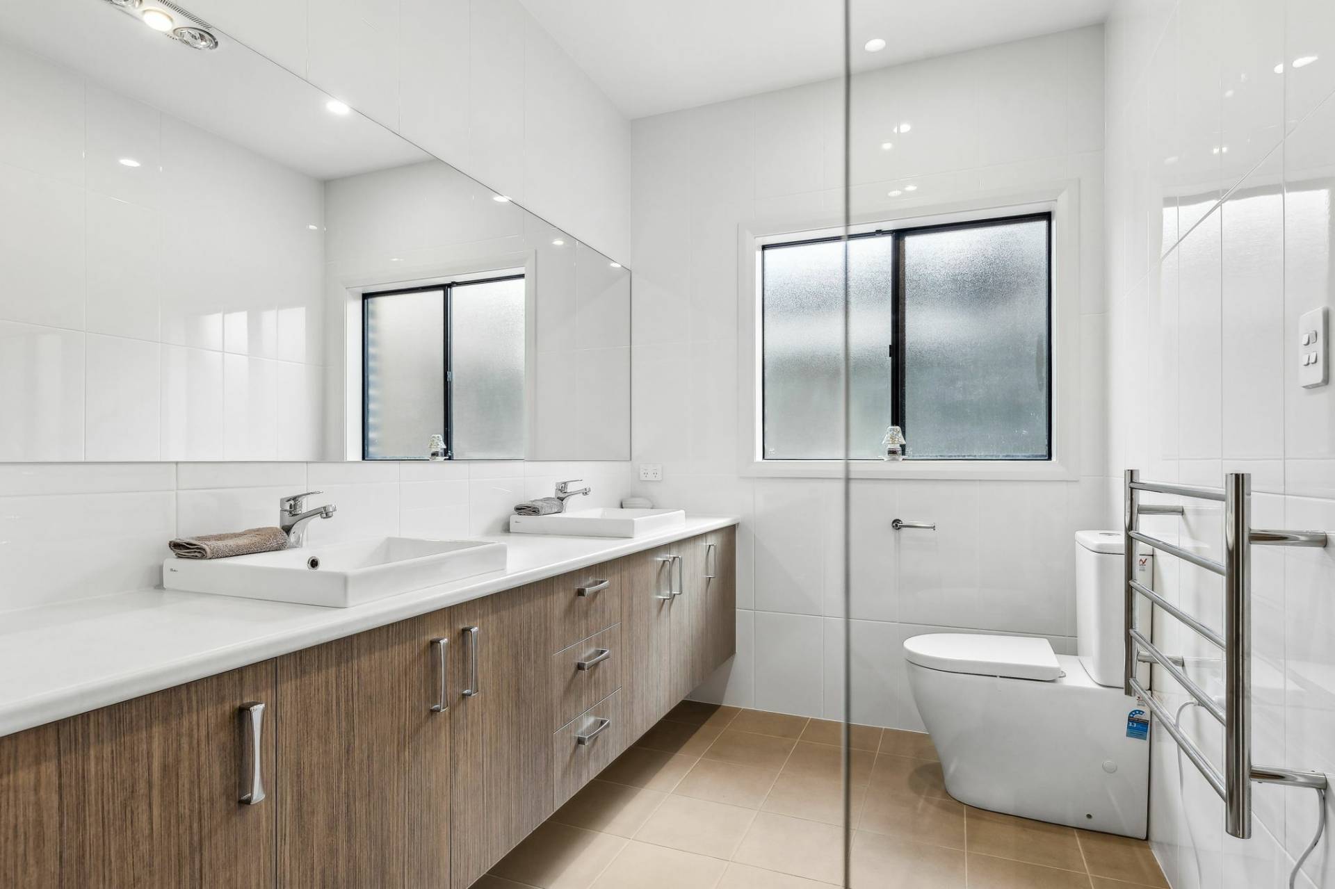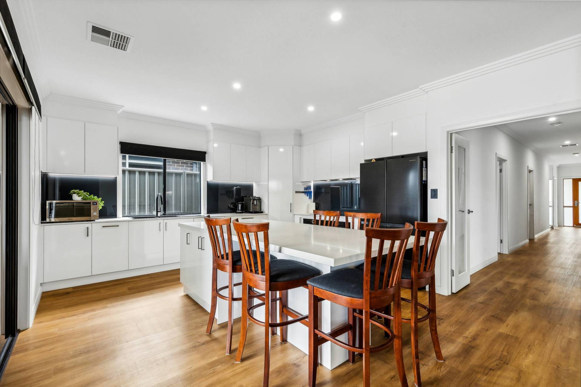 A wide hallway including a built-in cloak room and welcoming hybrid floors (100% waterproof) guide you past three spacious double bedrooms that include mirrored built-in robes, quality blinds and the comfort of ceiling fans, with a luxe ensuite for the main bedroom including a double vanity and large double shower, with an upgraded WC. Right in the mix, the main bathroom offers a family-friendly extra-depth bath and stylish tiling, along with a walk in shower and an upgraded WC taller than standard!