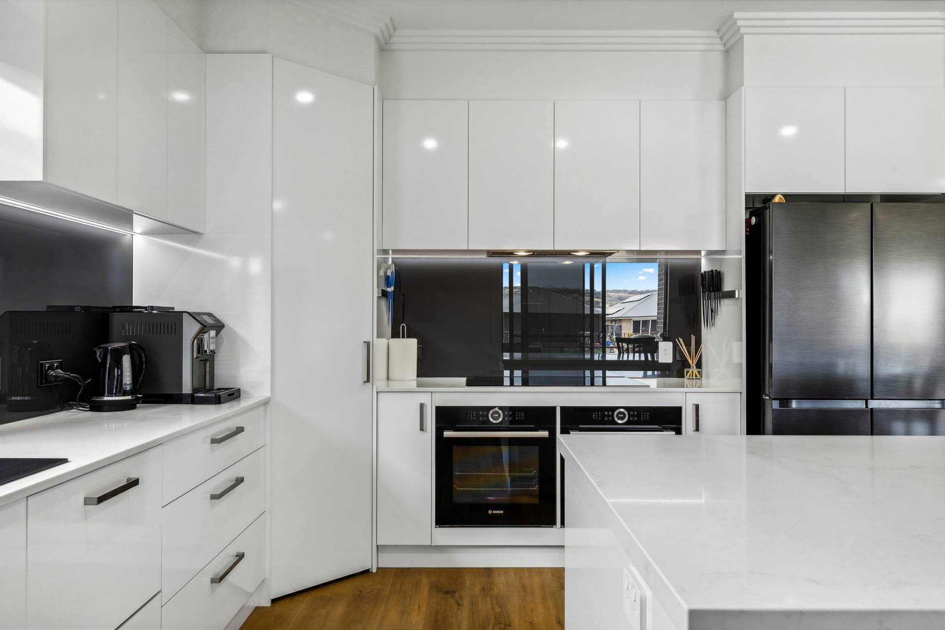 − Gleaming gourmet kitchen made for entertaining with dual Bosch ovens, central island breakfast bar, tons of bench space, an abundance of cabinetry, stone bench tops, Bosch 900 mm induction hotplate, integrated double drawer dishwasher, Graphite Glass splash backs, under cupboard led strip lighting