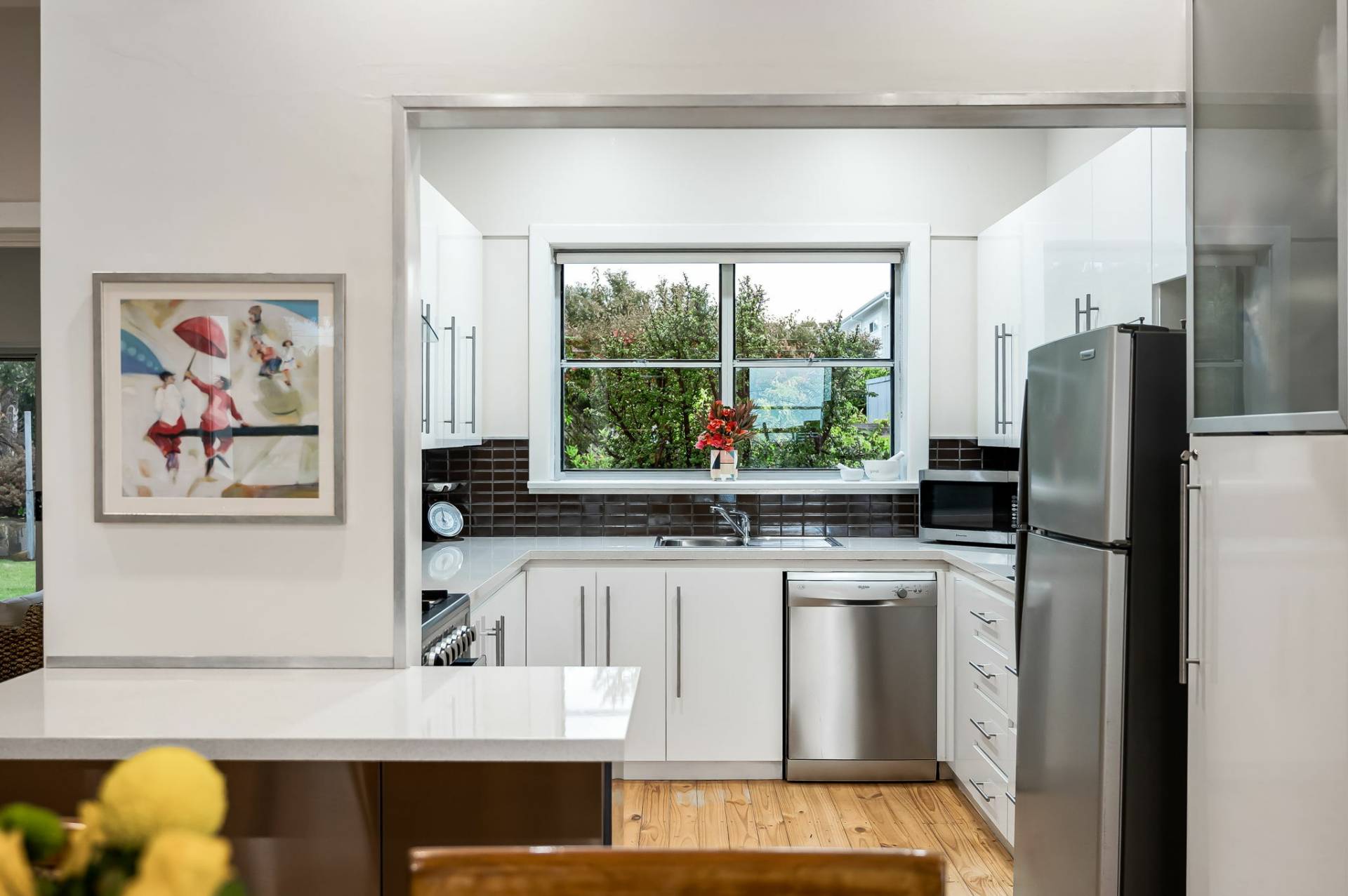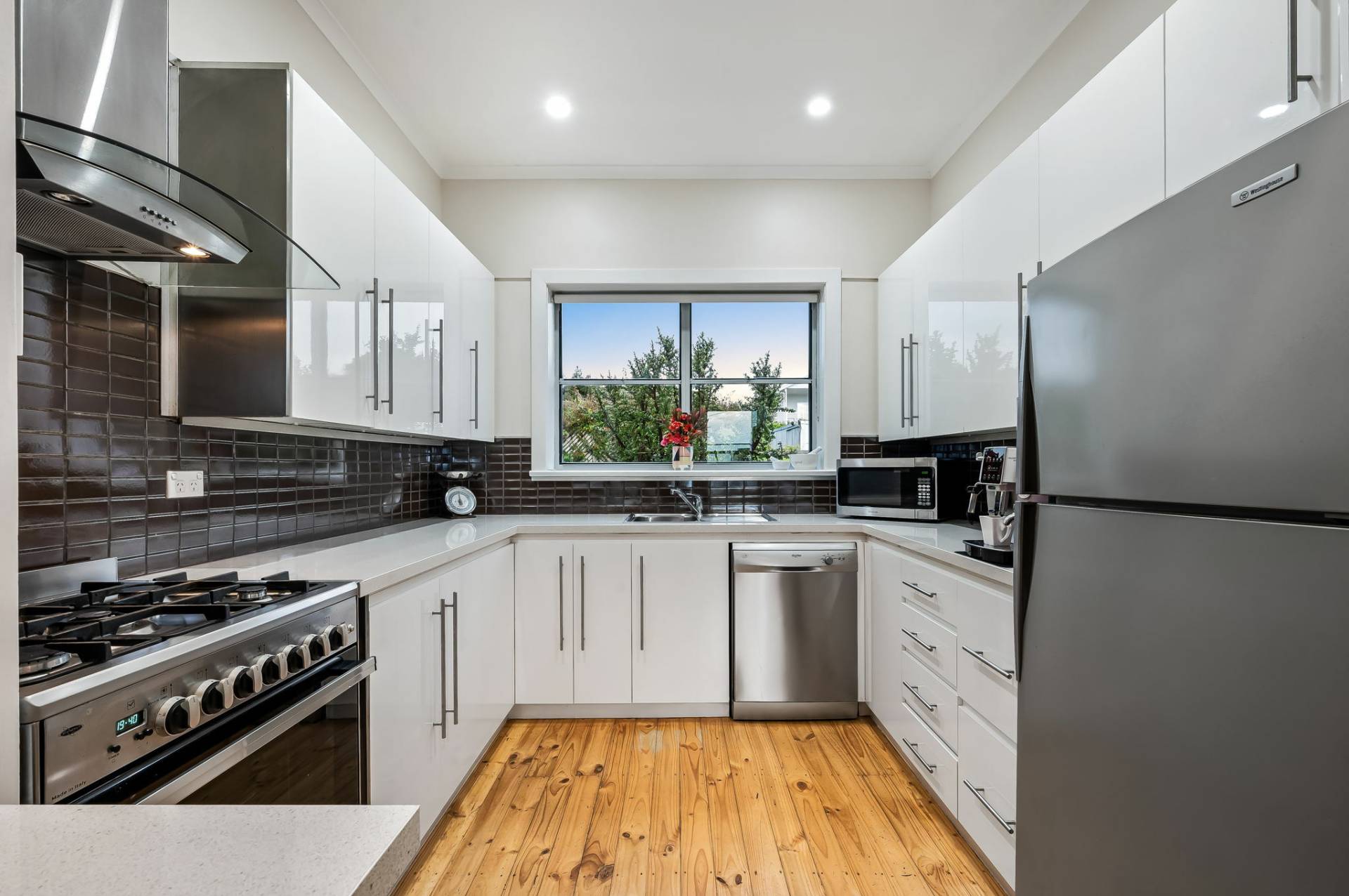 The sleek kitchen features stainless steel appliances and ample bench space, ideal for both everyday cooking and entertaining.