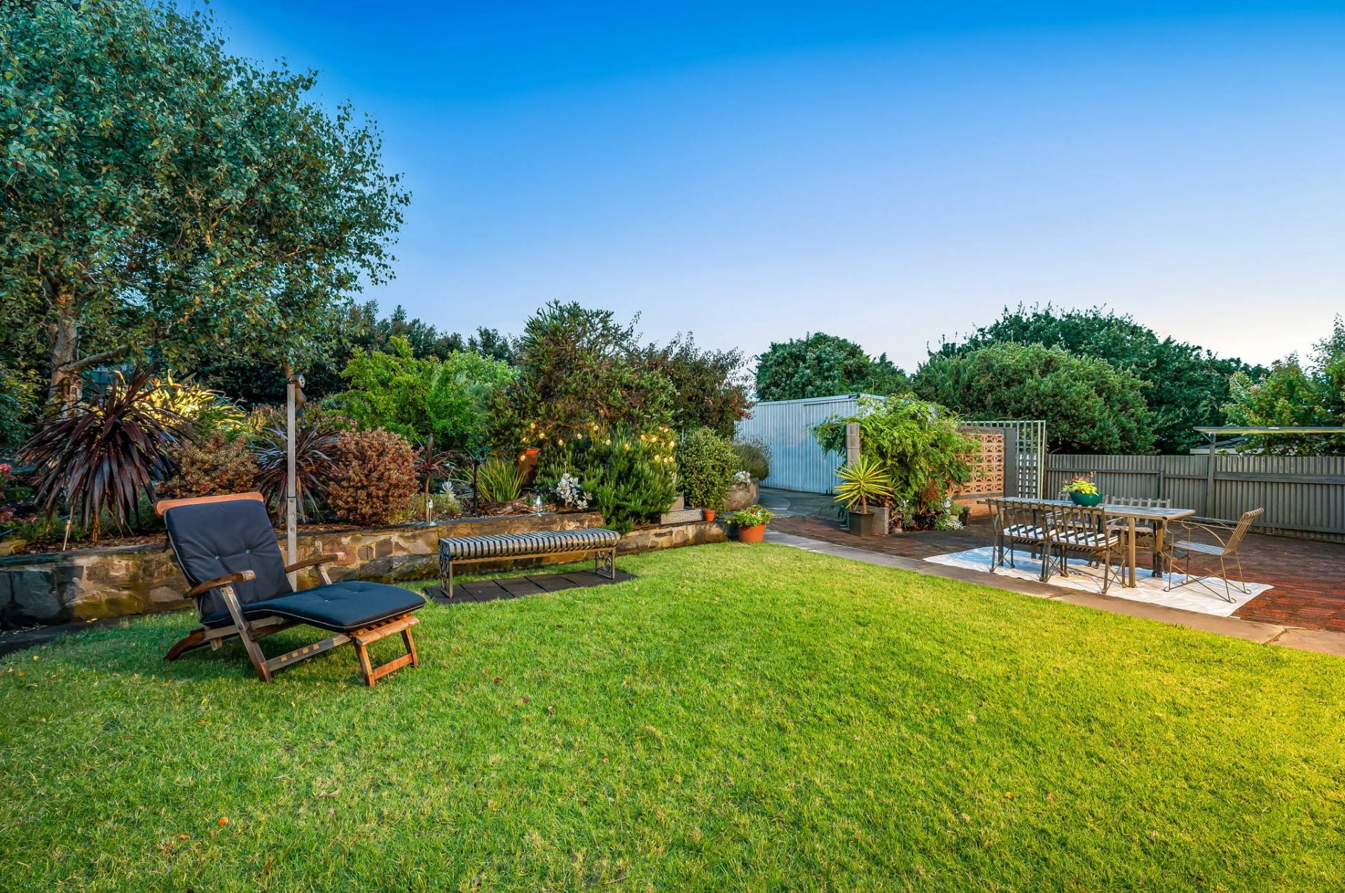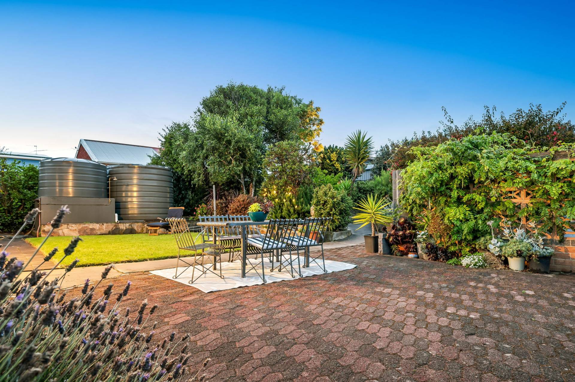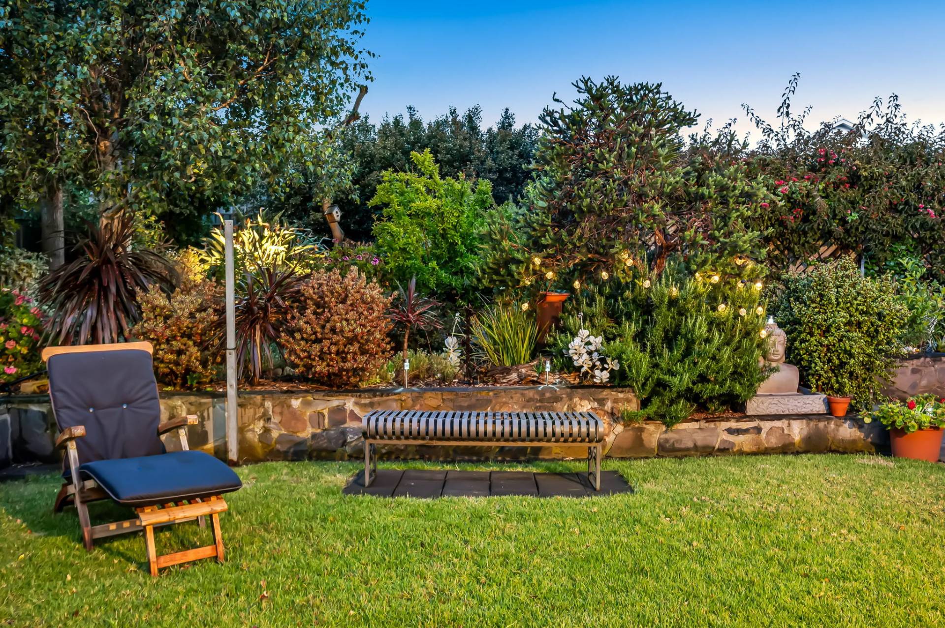 There are three generous bedrooms, plus a flexible fourth bedroom or study. The established gardens are lush and private, with fruit trees, manicured lawns, and space to relax.