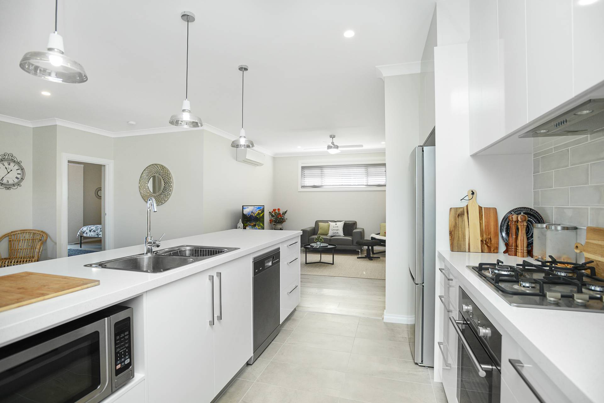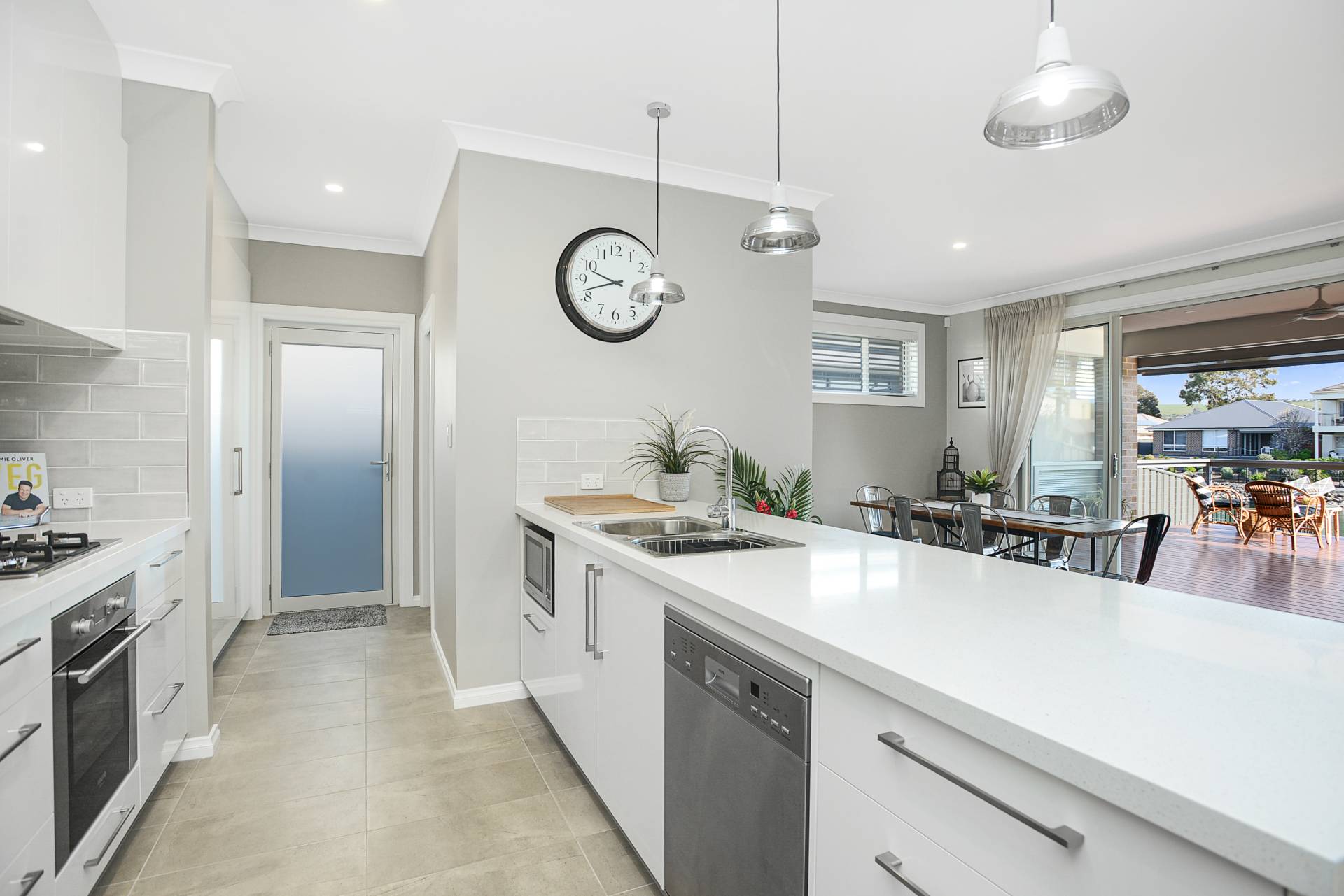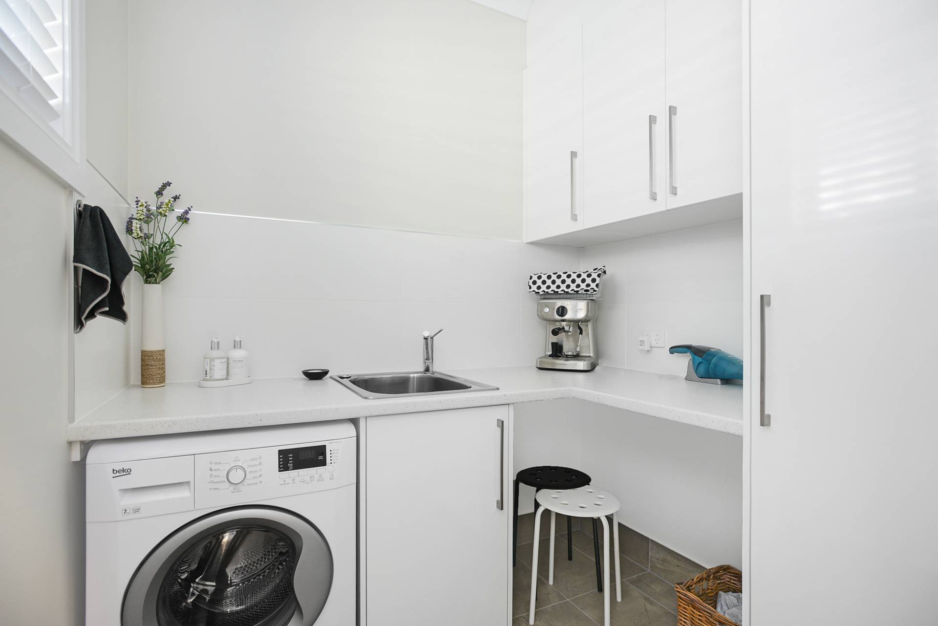 - Modern kitchen with Caesar stone bench tops, Stainless steel appliances and a walk-in pantry & laundry combined in one. This also leads out an undercover service court with hot & cold water can also be accessed from a roller door in the garage, very handy to store any outdoor equipment.