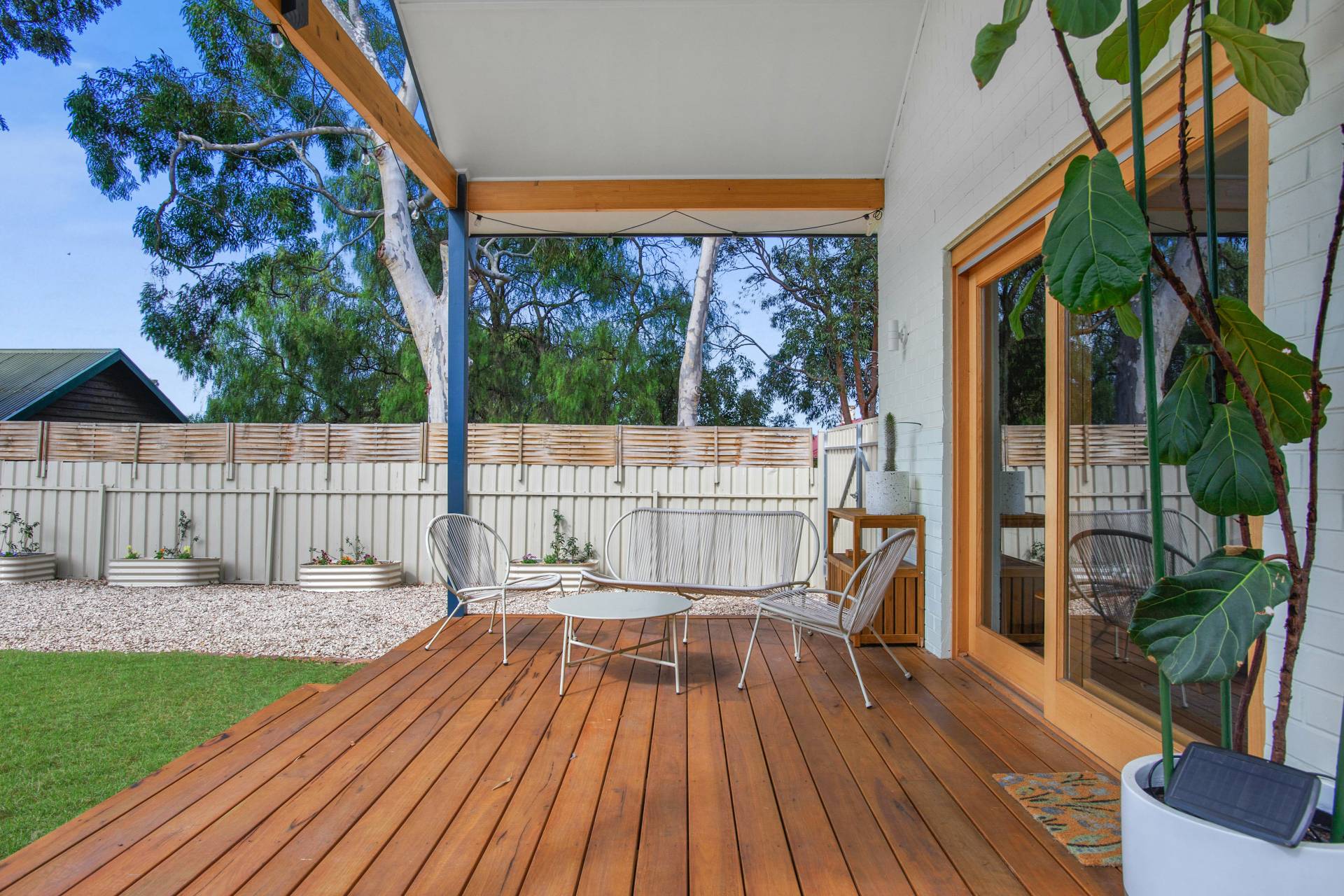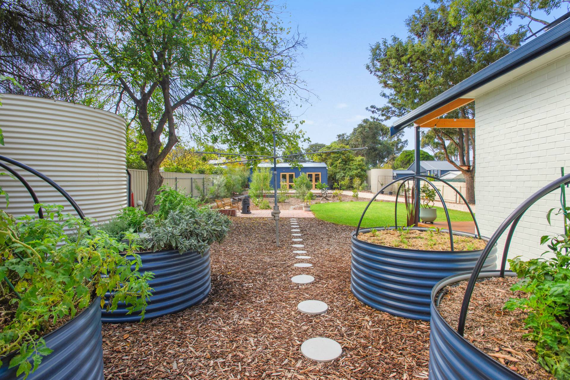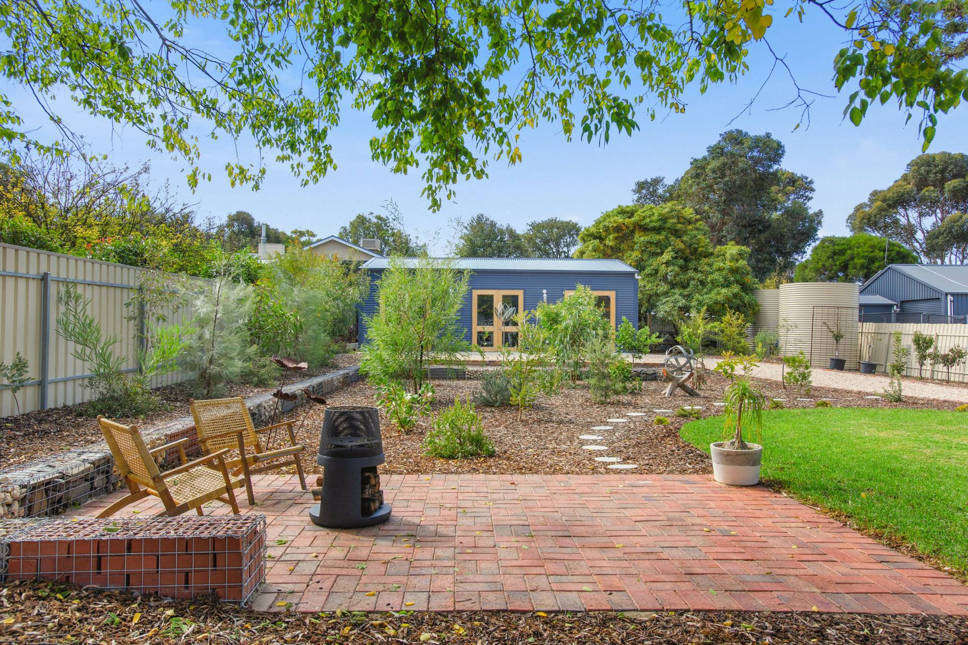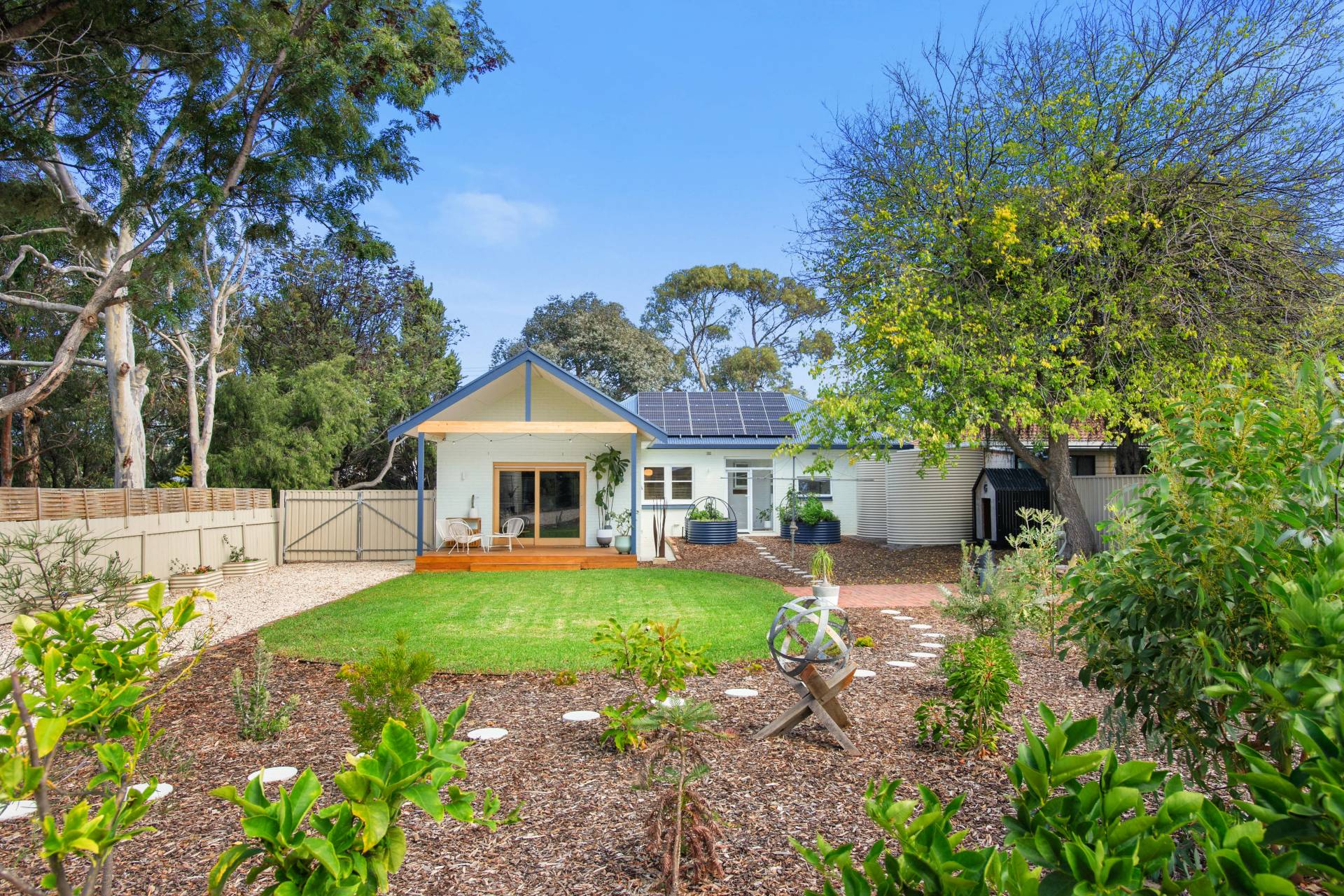 • Beautifully landscaped front and rear gardens, featuring a striking gabion wall, custom gates, citrus, stone fruit and fruit trees and three raised wicking beds perfect for homegrown produce