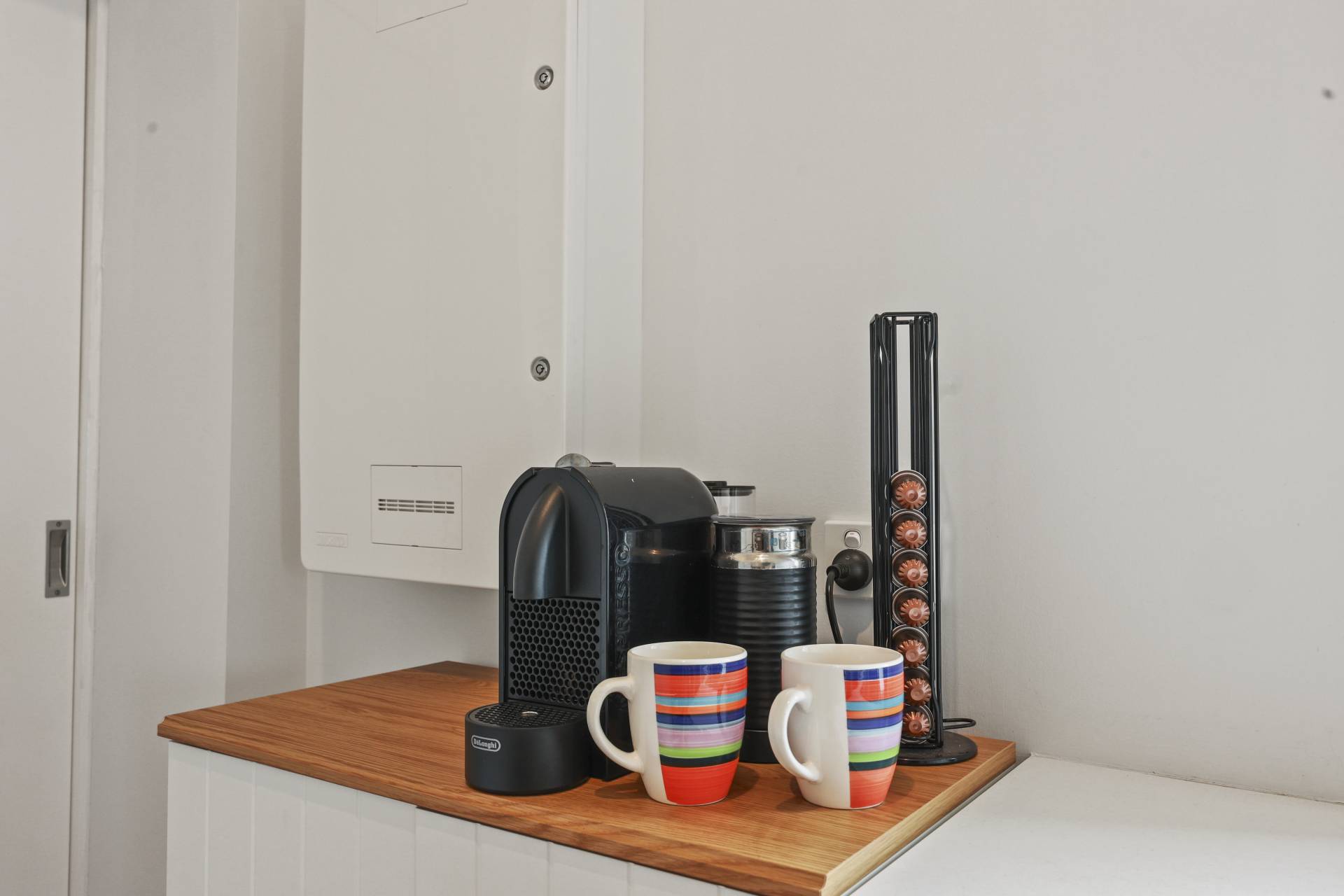 Compact kitchenette with bar fridge, coffee pod machine, and milk frother