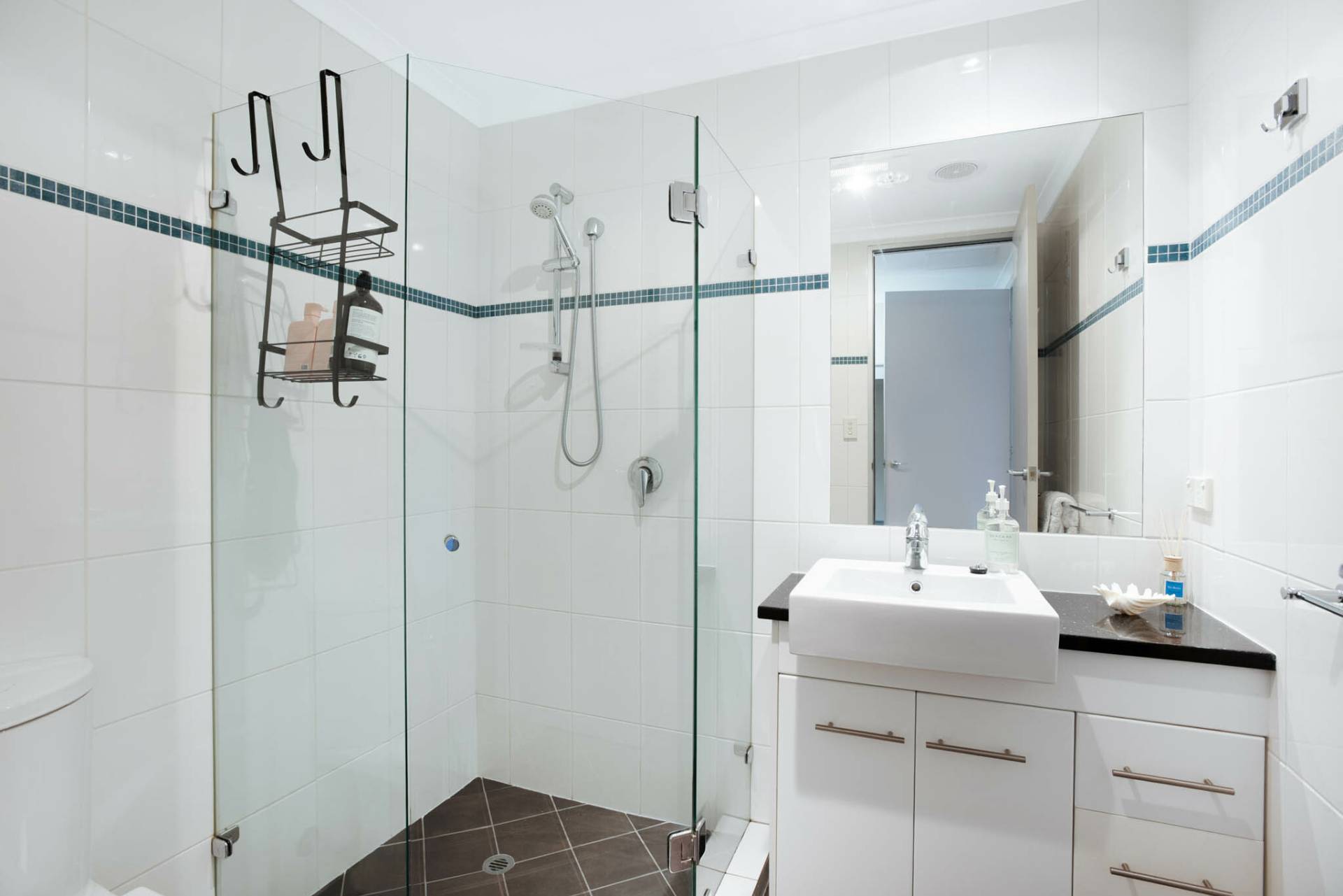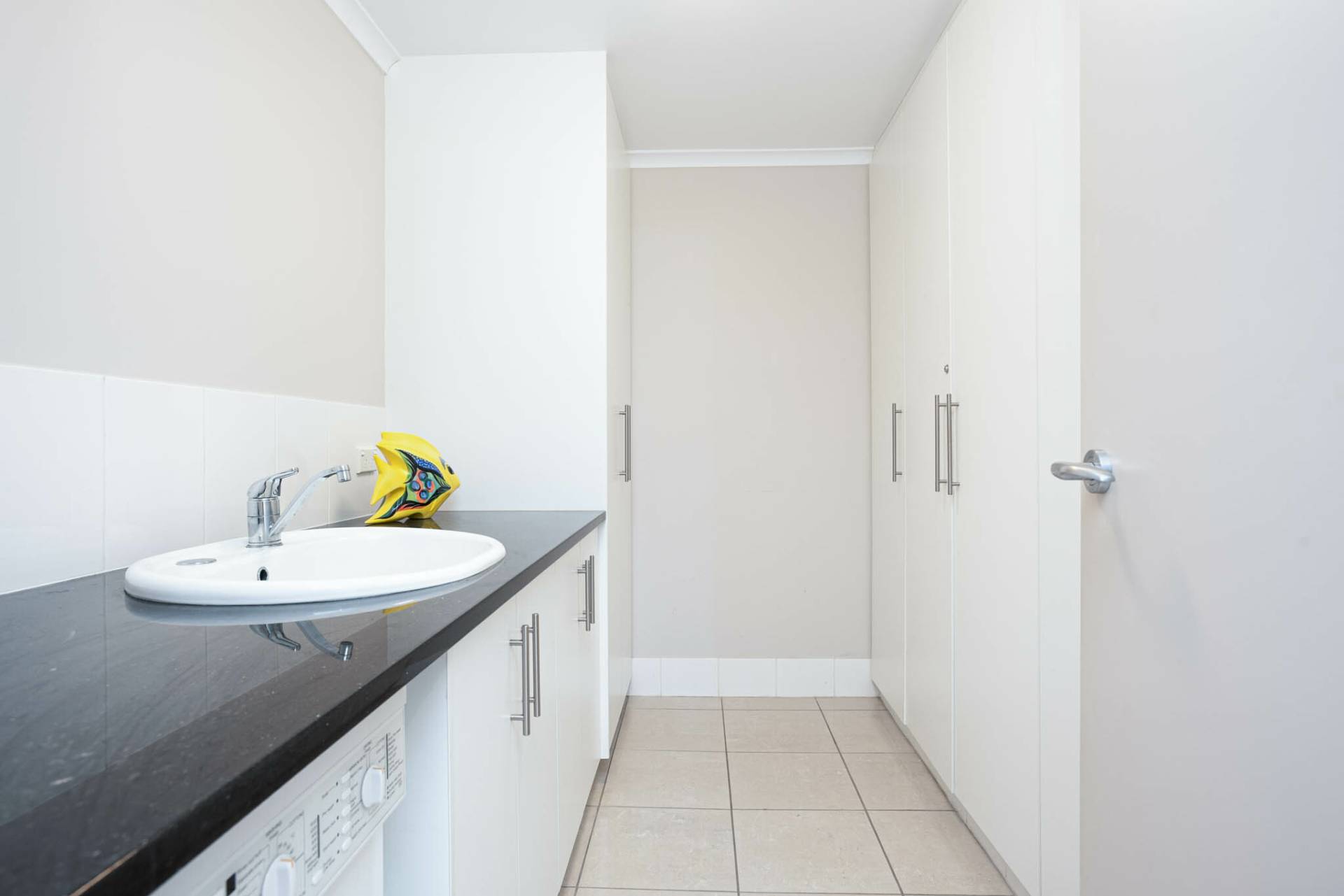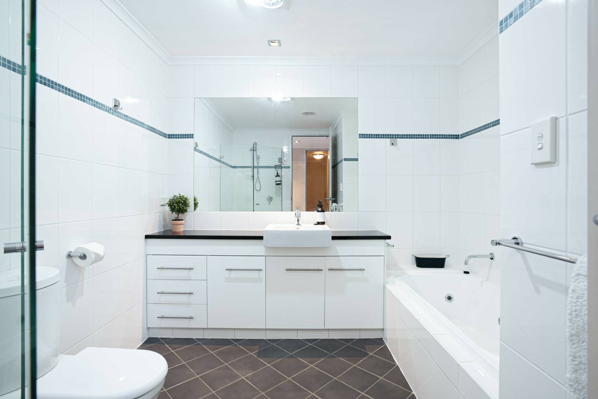 The main bathroom is spacious, with a large shower, separate bath, and a sleek vanity. You'll also enjoy a generous laundry with a front-loading washing machine and plenty of bench space.