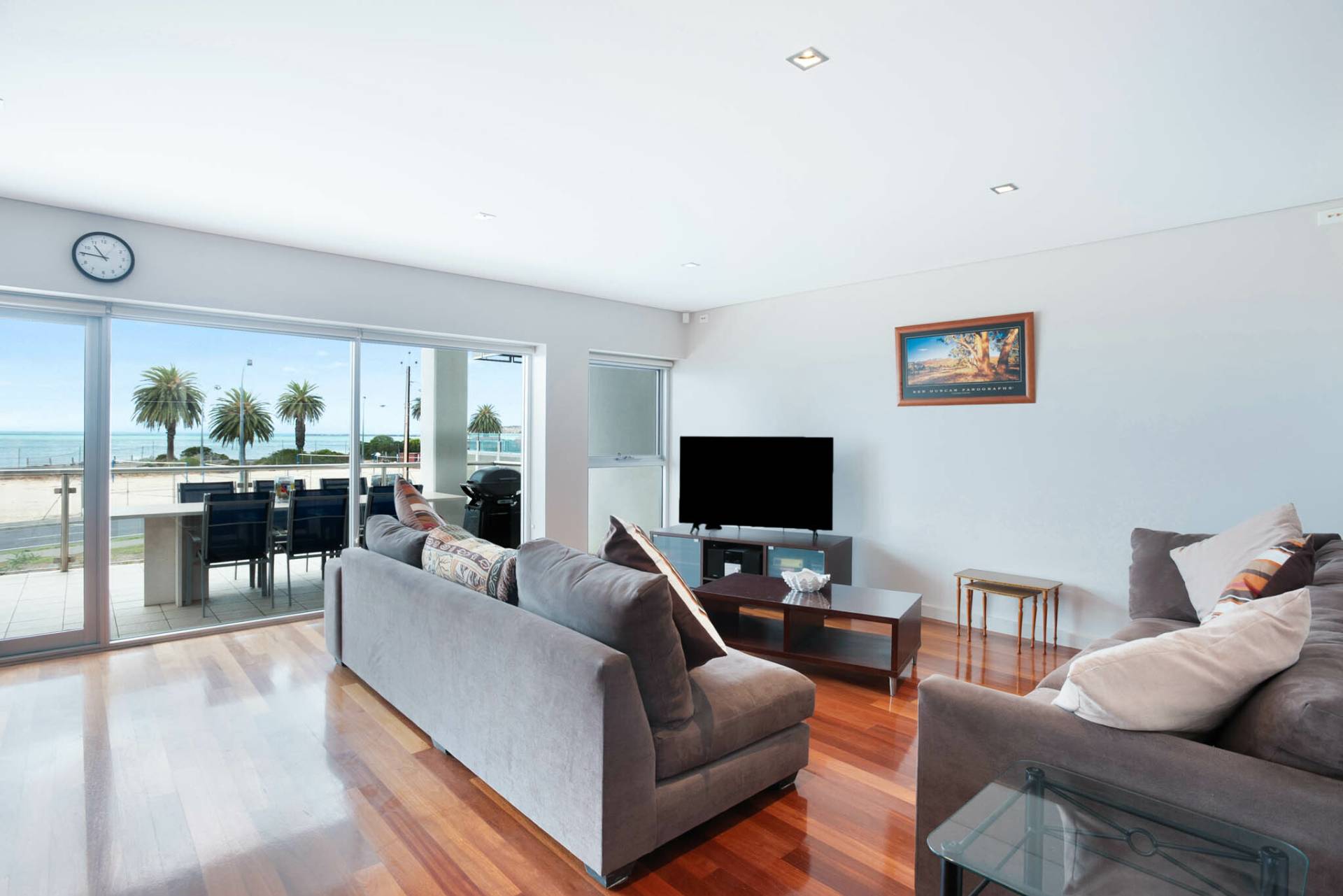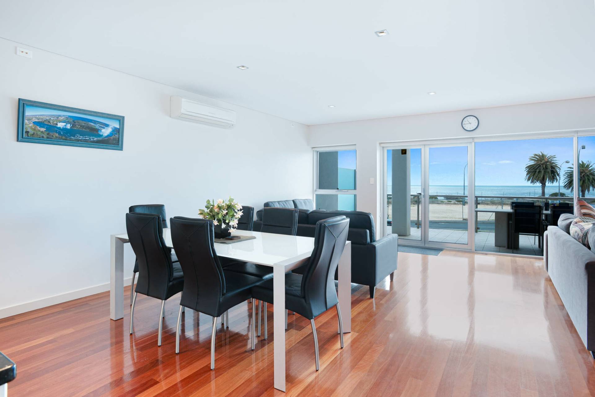 Enjoy two cozy living spaces: curl up with a book or settle in for a movie night on the large couch overlooking the ocean. A split system air conditioner ensures year-round comfort.