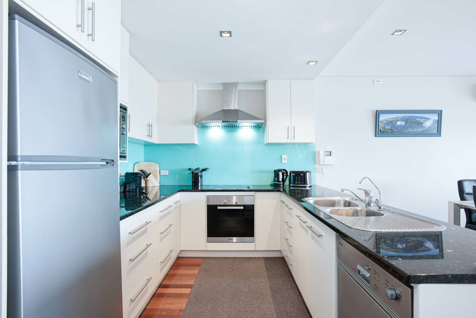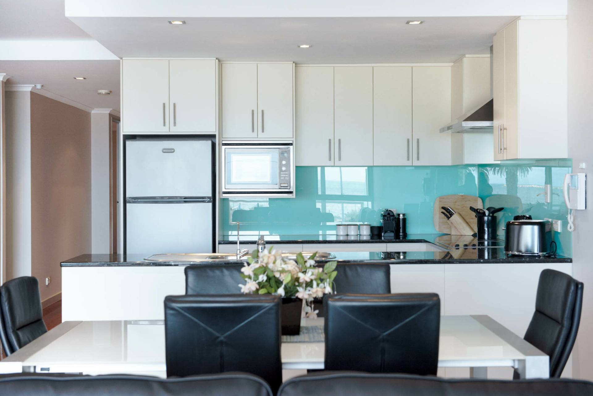 The rear open-plan kitchen, dining, and living area is the heart of the home—perfect for cooking, relaxing, and soaking in the view. The kitchen is fully equipped with modern appliances, ample bench space, dishwasher and coffee pod machine.