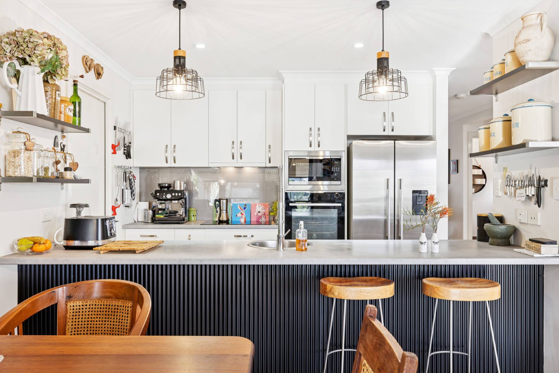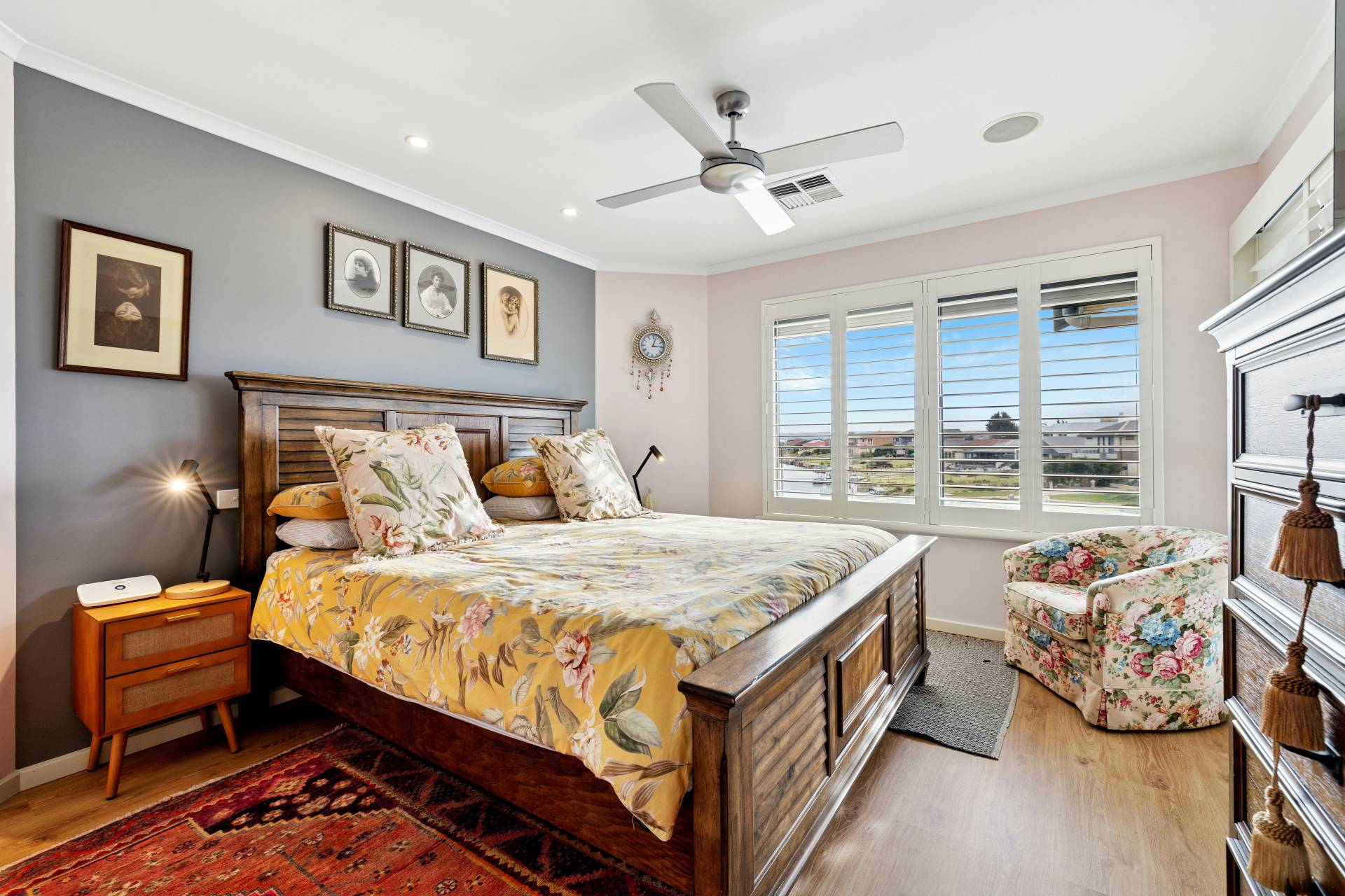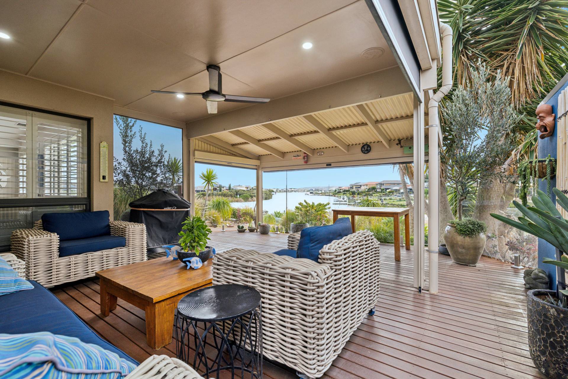 Open-plan living and dining areas flow seamlessly to the outdoors, where the covered entertaining deck becomes your second living room. Complete with a ceiling fan and pull-down blinds, this space is perfect for hosting year-round – all set against lush landscaped gardens and the calm of the canal beyond.