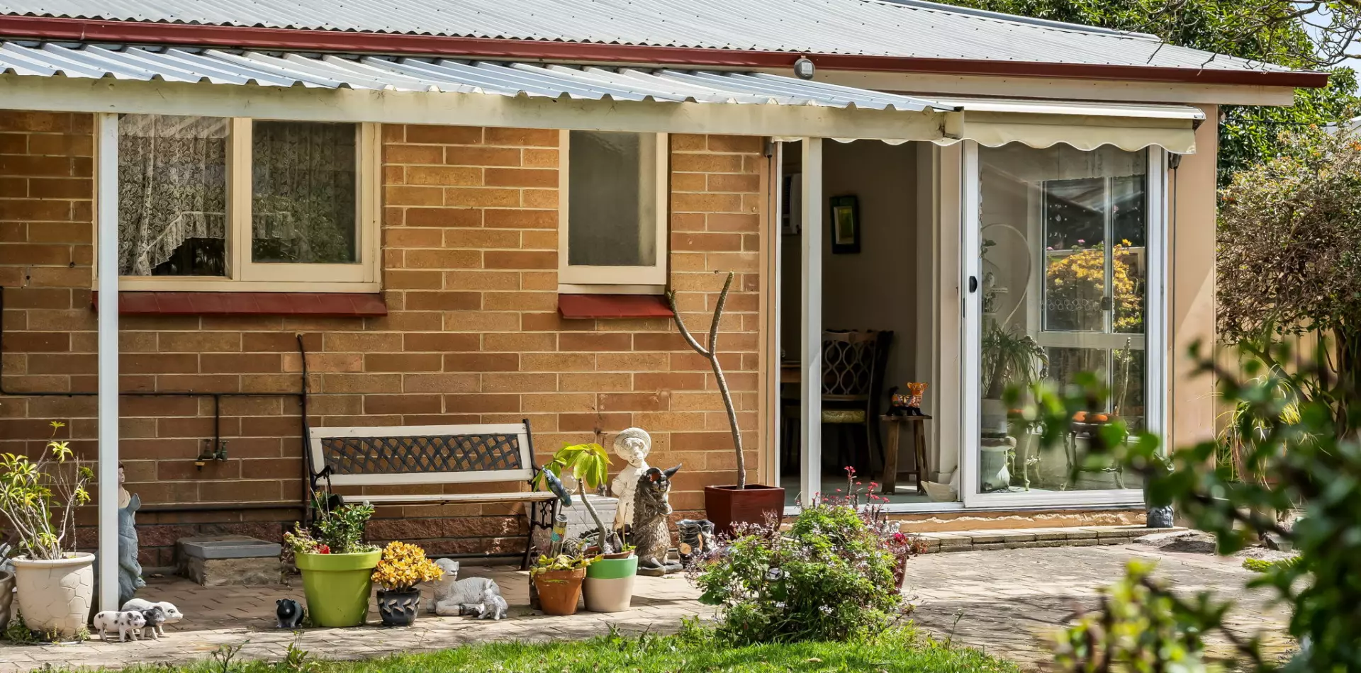 • Covered porch, paved areas, and mature gardens