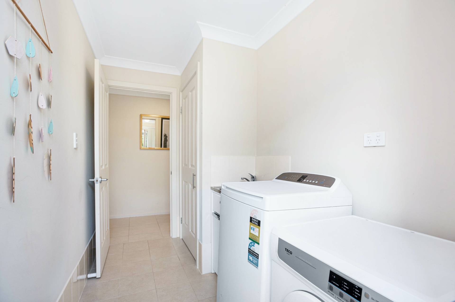 • A family bathroom with full bath, separate toilet, and practical laundry with extra storage.
