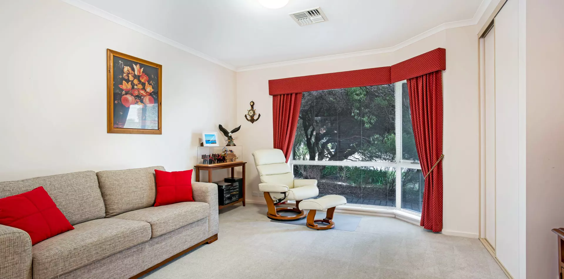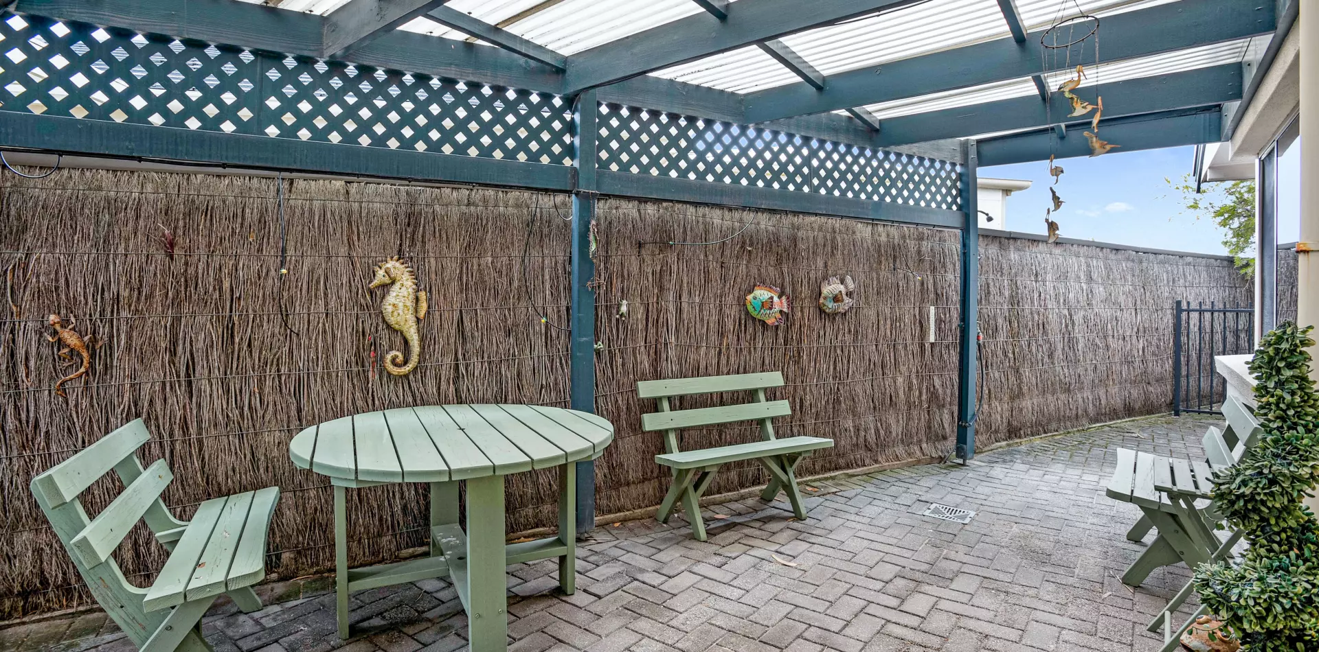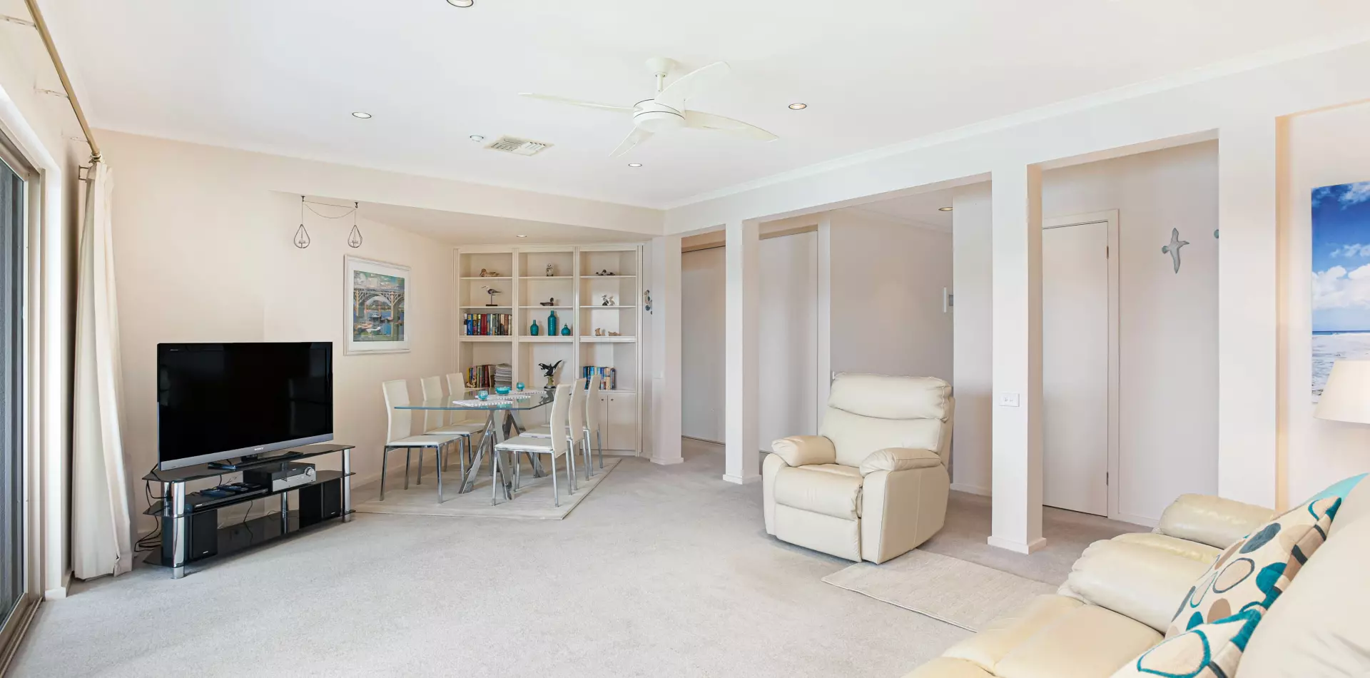 The open-plan kitchen, dining and living areas are the heart of the home, spacious, light-filled and perfect for both everyday living and entertaining. The modern kitchen includes a dishwasher, generous storage, and a breakfast bar that flows effortlessly into the dining area. Large windows and sliding doors bring the outdoors in, leading to a generous patio/pergola – an ideal spot for a BBQ, a quiet morning coffee, or evening drinks with friends.
