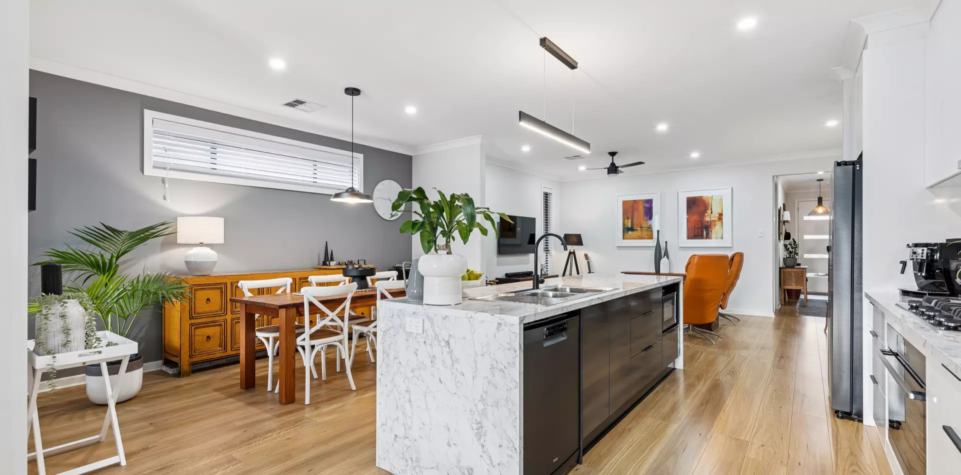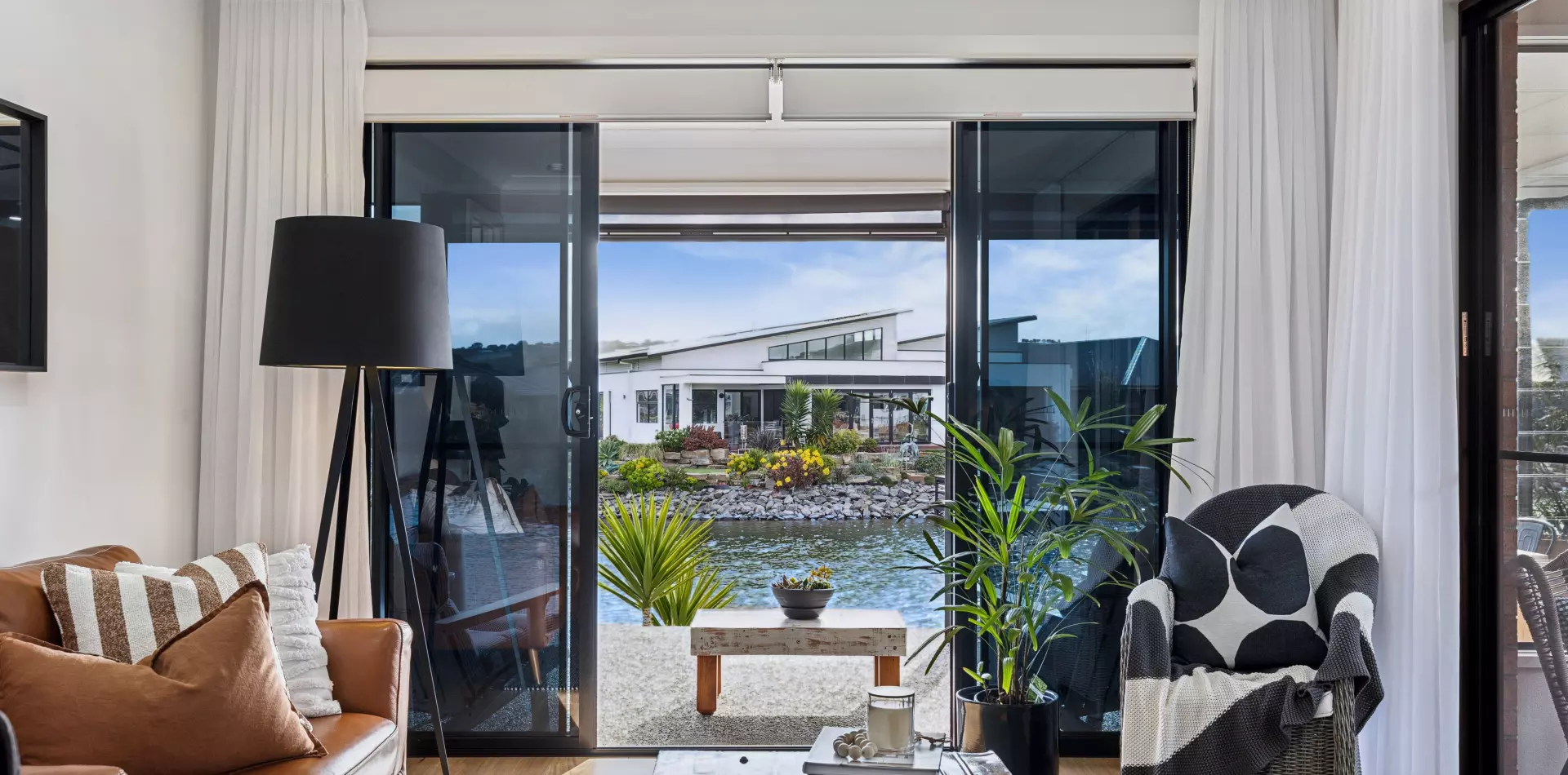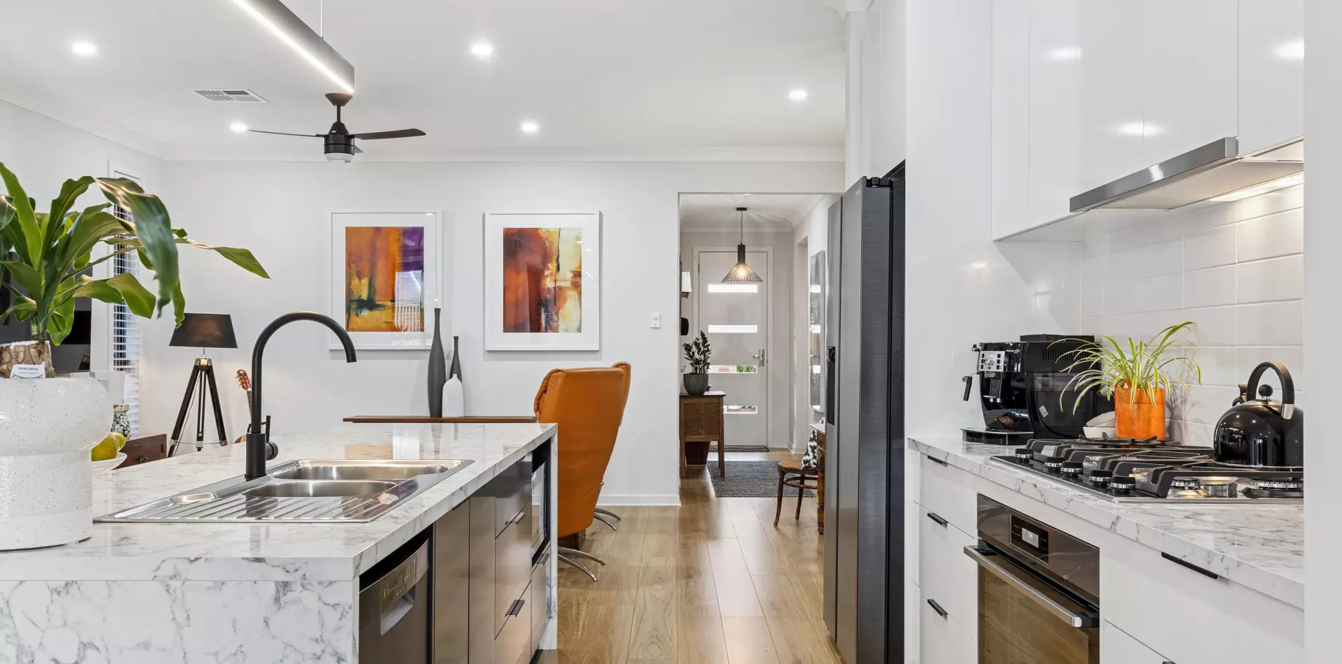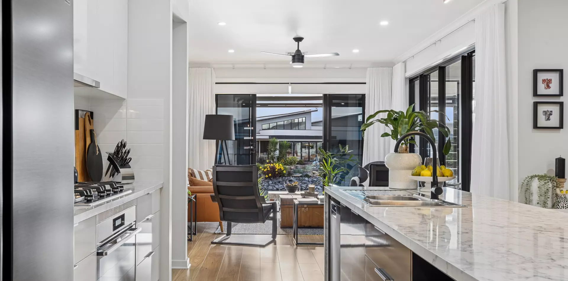 Inside, you’re welcomed by sleek finishes and thoughtful details, laminate timber-finish floors underfoot, a kitchen that’s as striking as it is functional with its waterfall island, 900mm gas cooktop, and bold black accents. The spaces are versatile with two living areas. Every element from the freestanding bath to the sheer curtains and timber venetians has been carefully chosen to create warmth, style, and a sense of home.