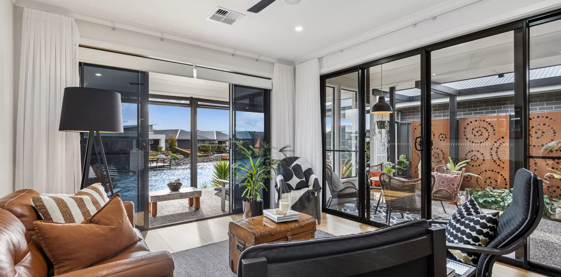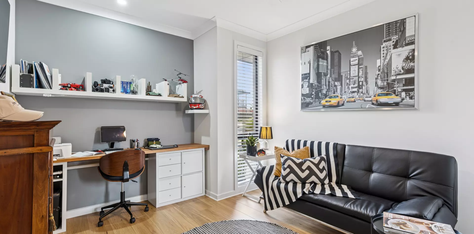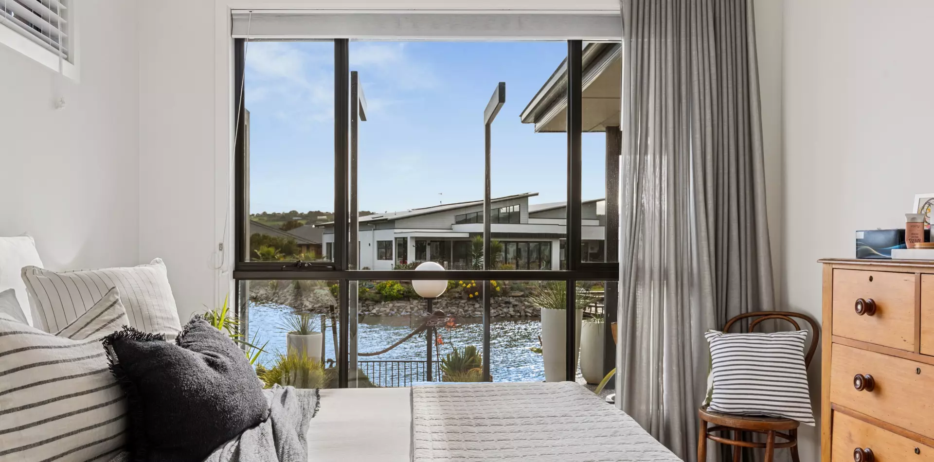 Inside, you’re welcomed by sleek finishes and thoughtful details, laminate timber-finish floors underfoot, a kitchen that’s as striking as it is functional with its waterfall island, 900mm gas cooktop, and bold black accents. The spaces are versatile with two living areas. Every element from the freestanding bath to the sheer curtains and timber venetians has been carefully chosen to create warmth, style, and a sense of home.