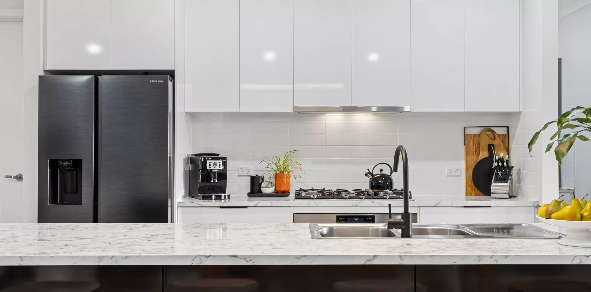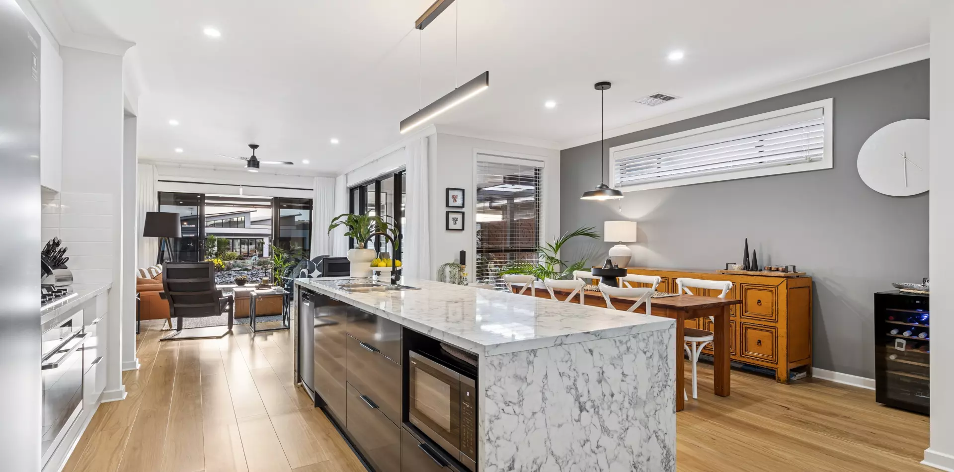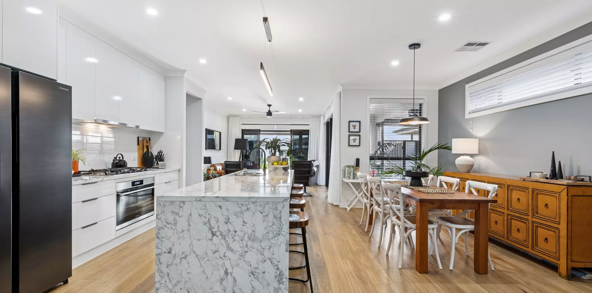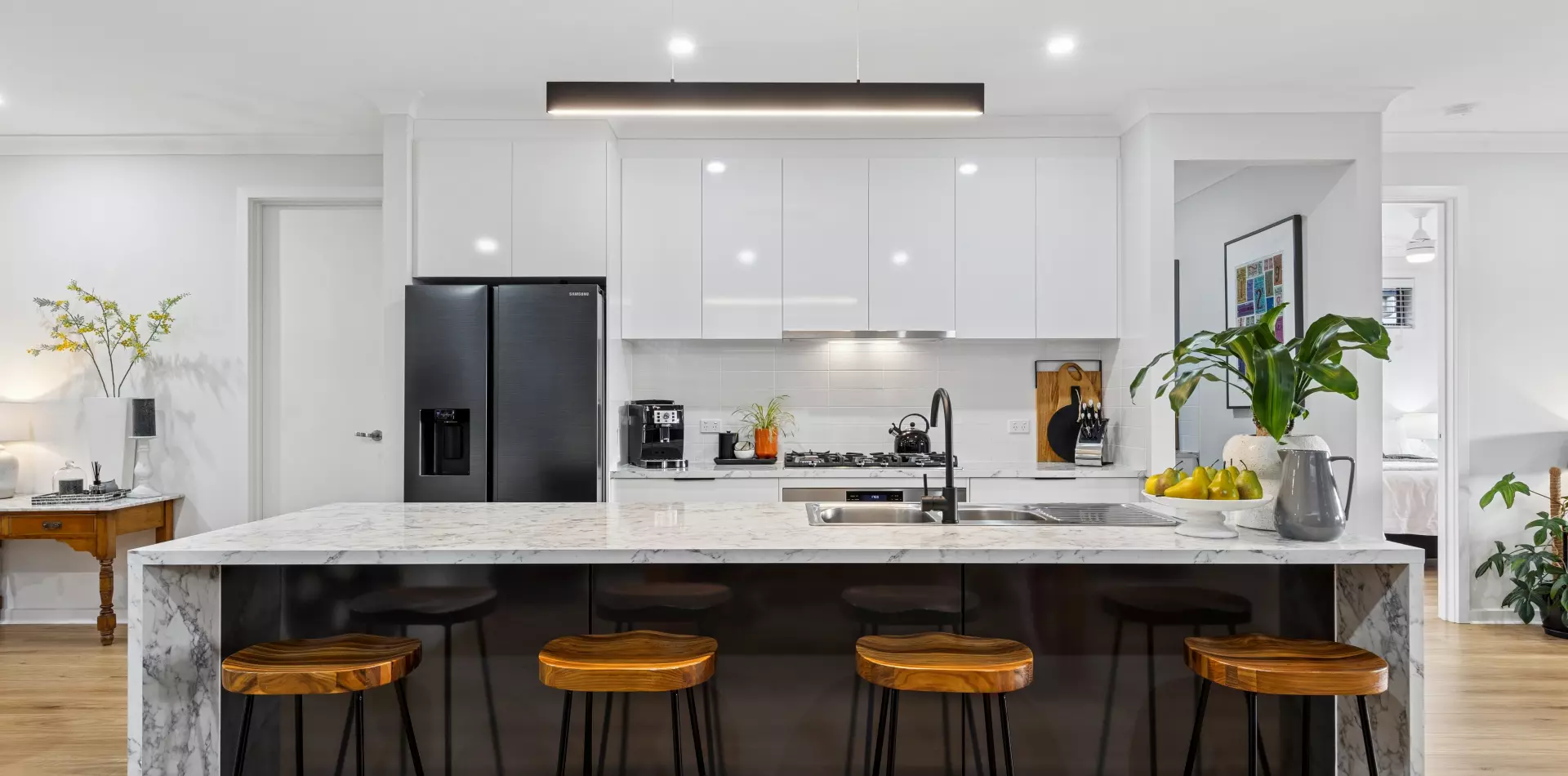 • Designer kitchen featuring 40mm waterfall island bench, sleek black accents, 900mm gas cooktop, dishwasher, and premium finishes