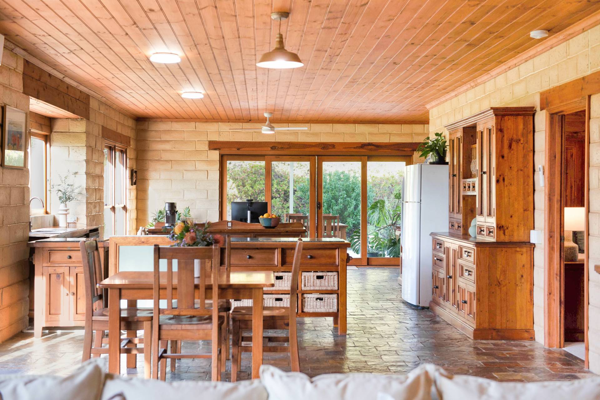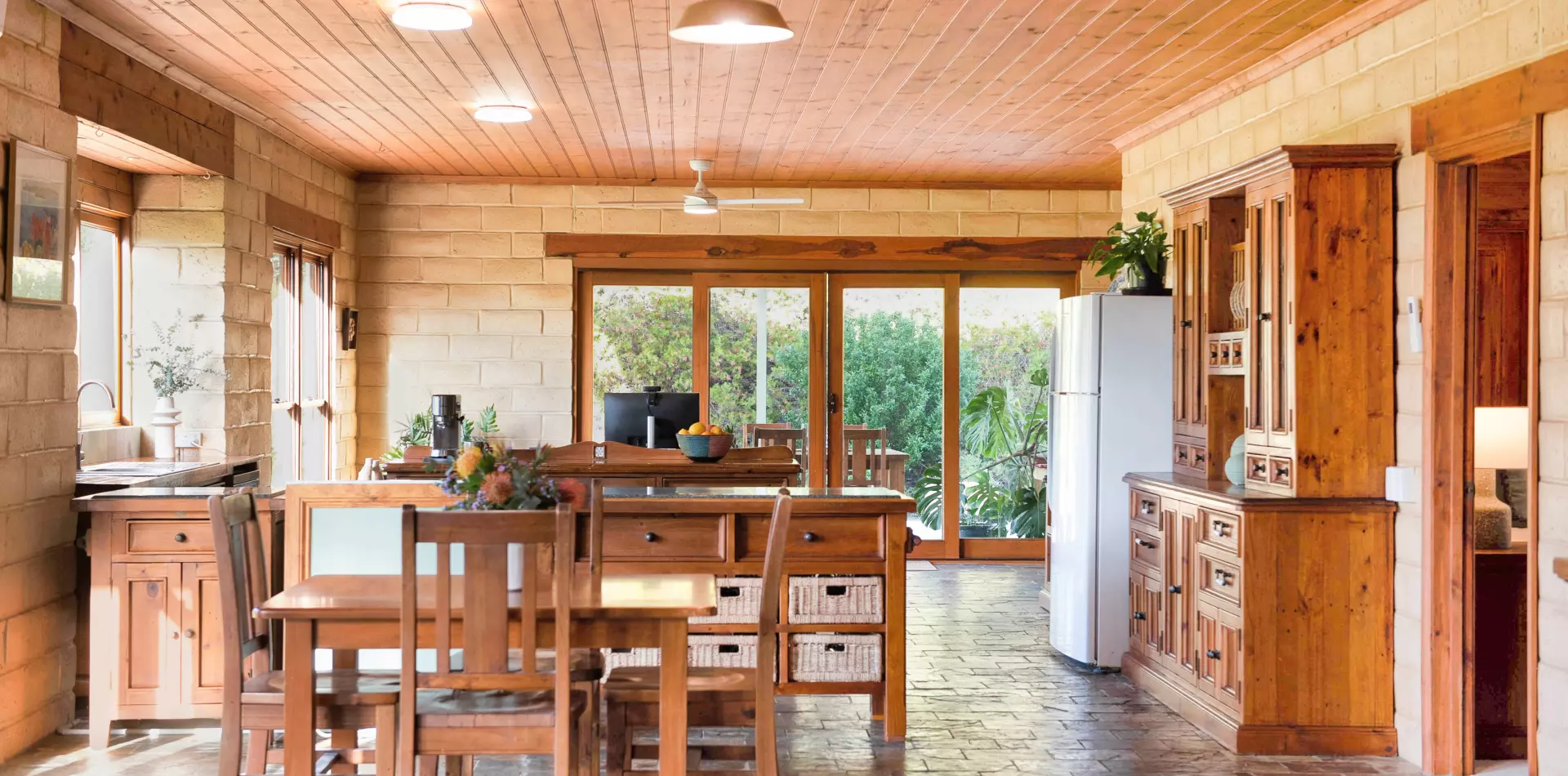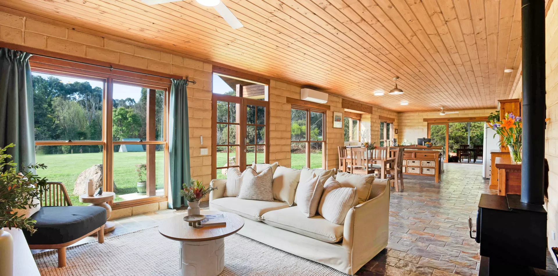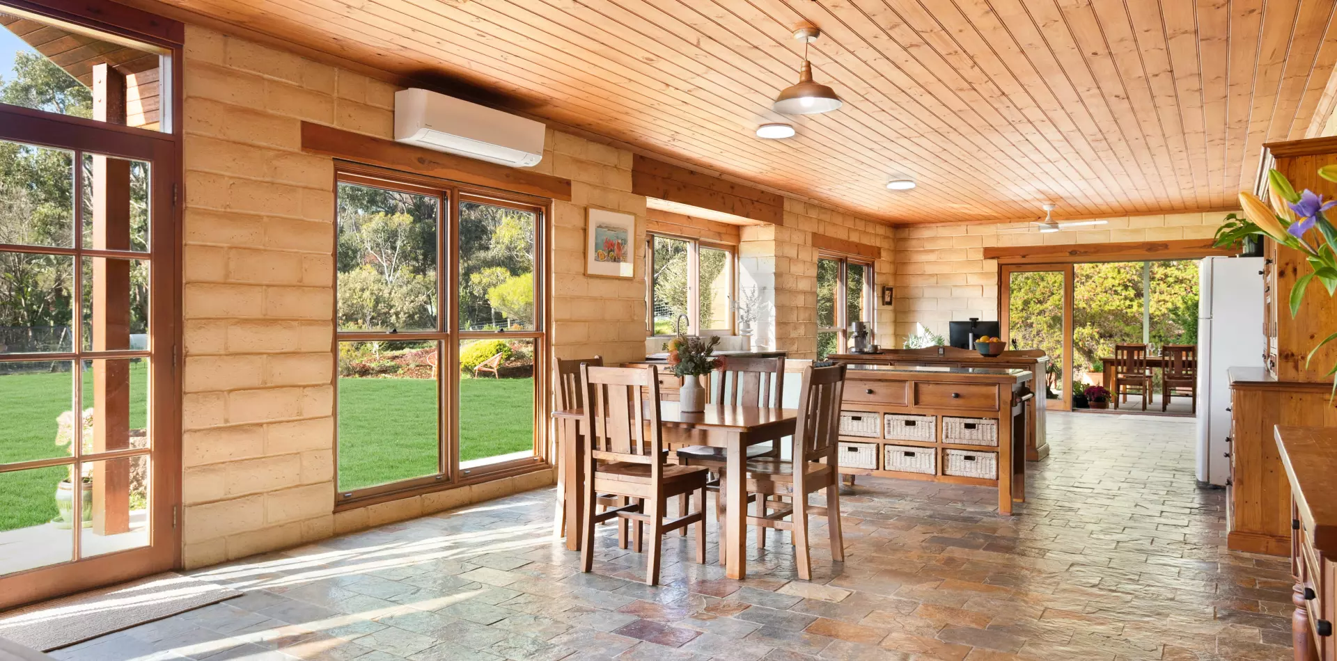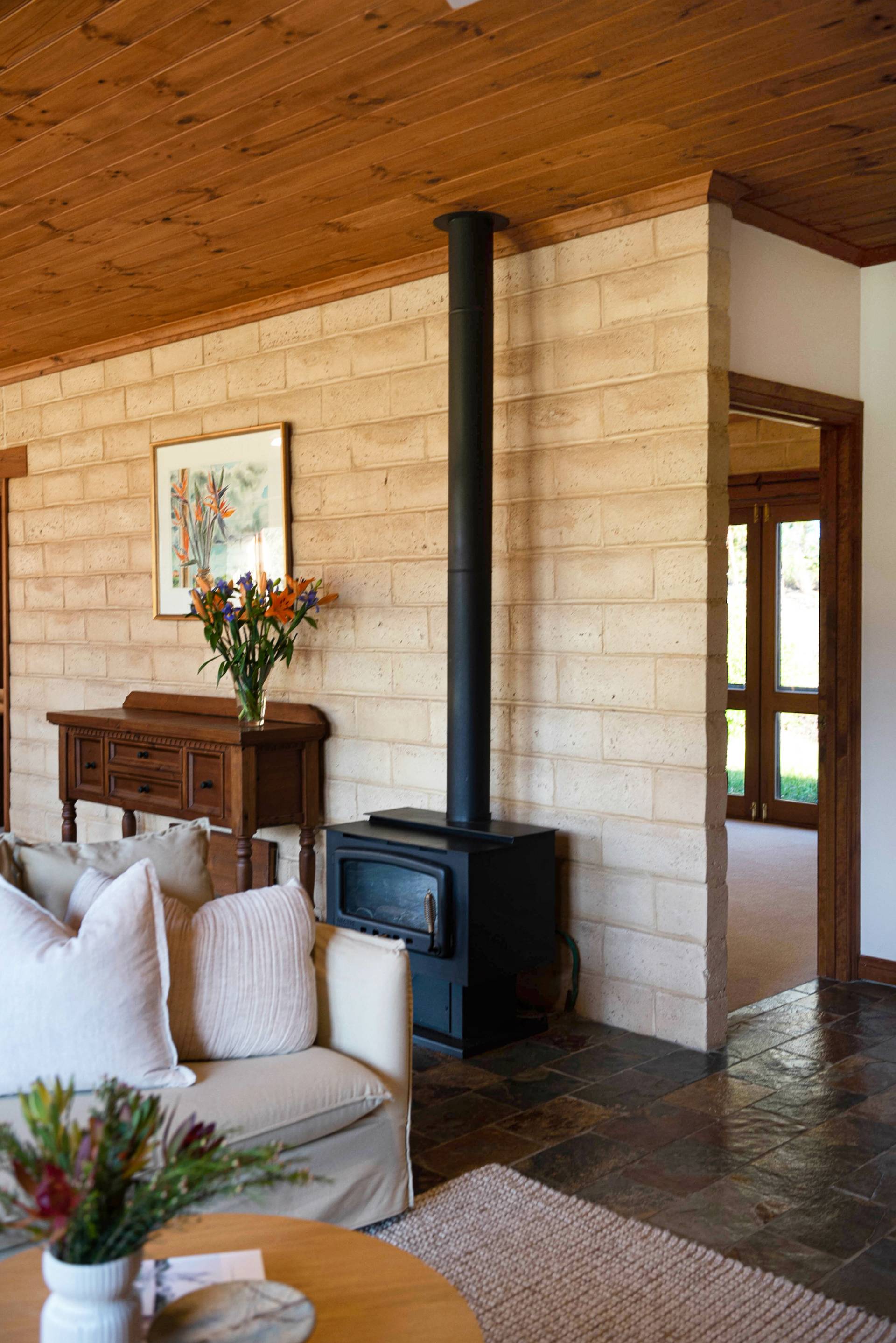 Homes built from timbercrete are renowned for their sustainability and strength. The thick walls act as natural insulation, keeping interiors cooler in summer and warmer in winter while also delivering acoustic comfort and an earthy beauty that feels instantly grounding. Complemented by timber-lined ceilings, timber windows, and feature lintels, the craftsmanship in this home is unmistakable.
