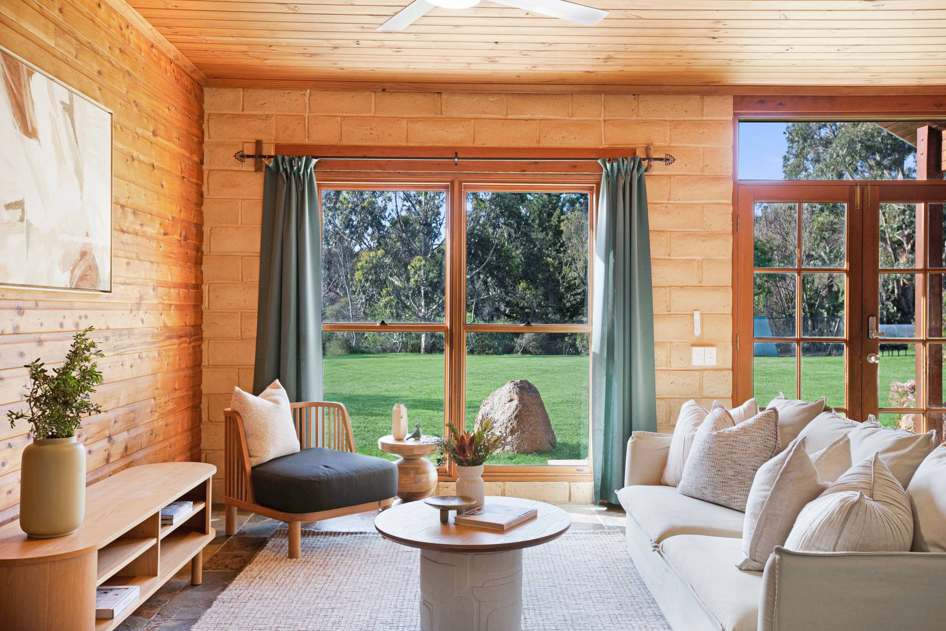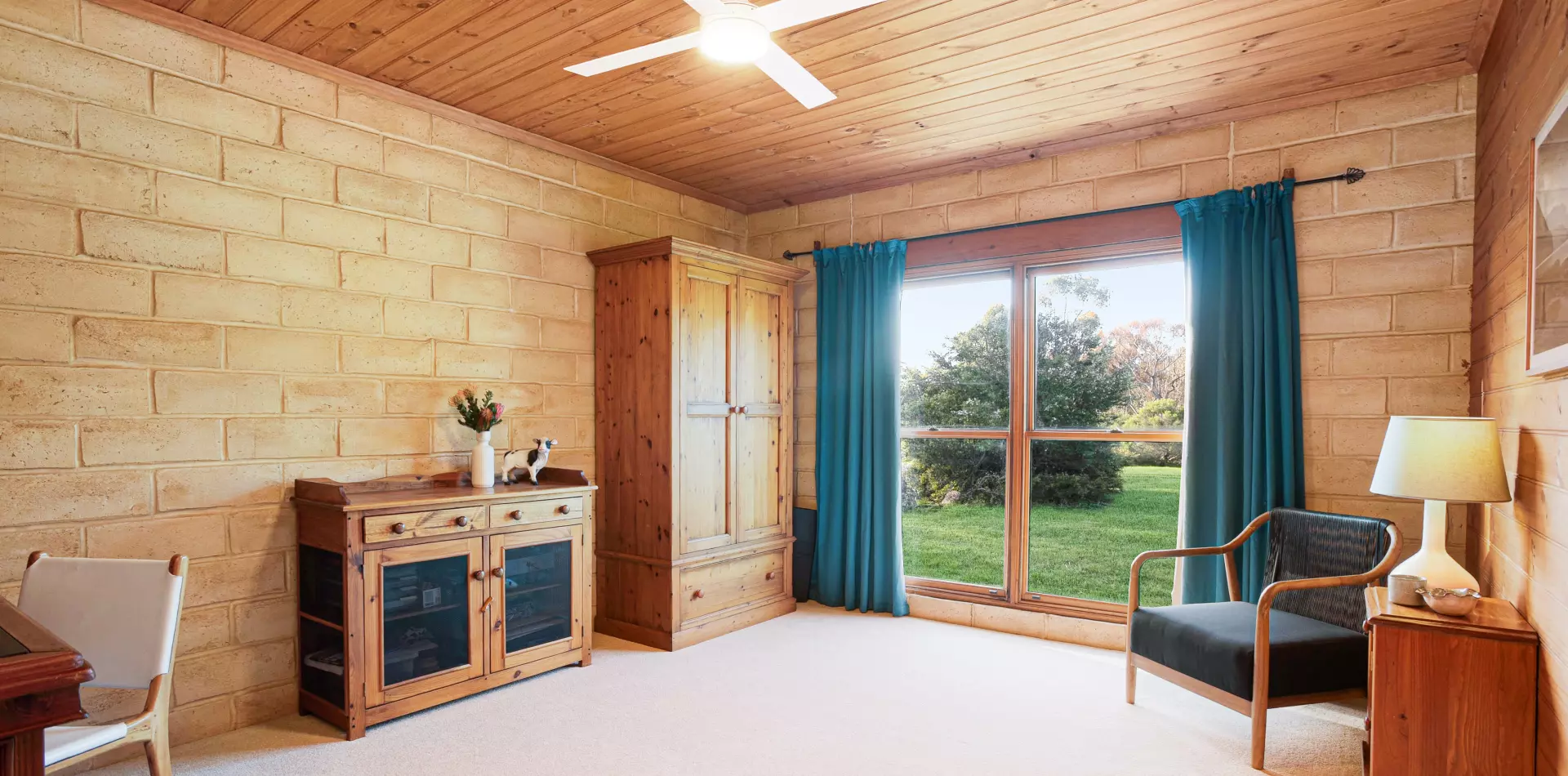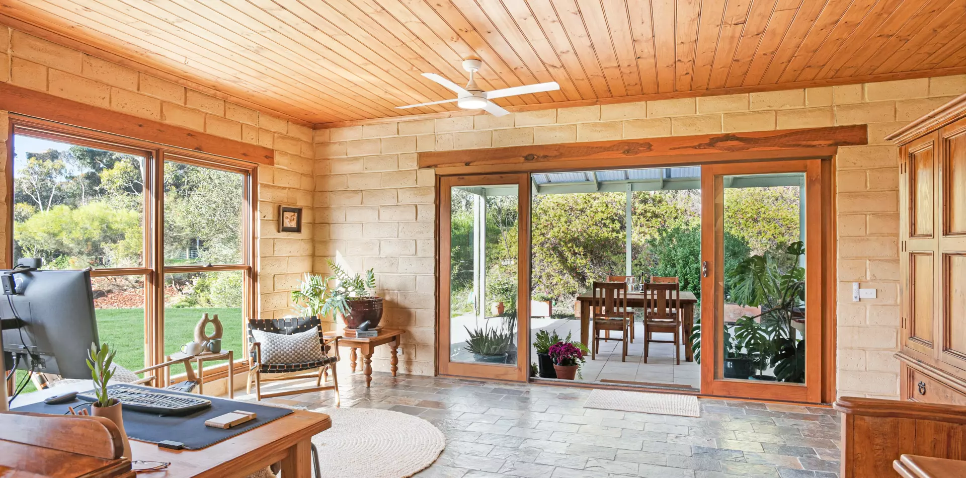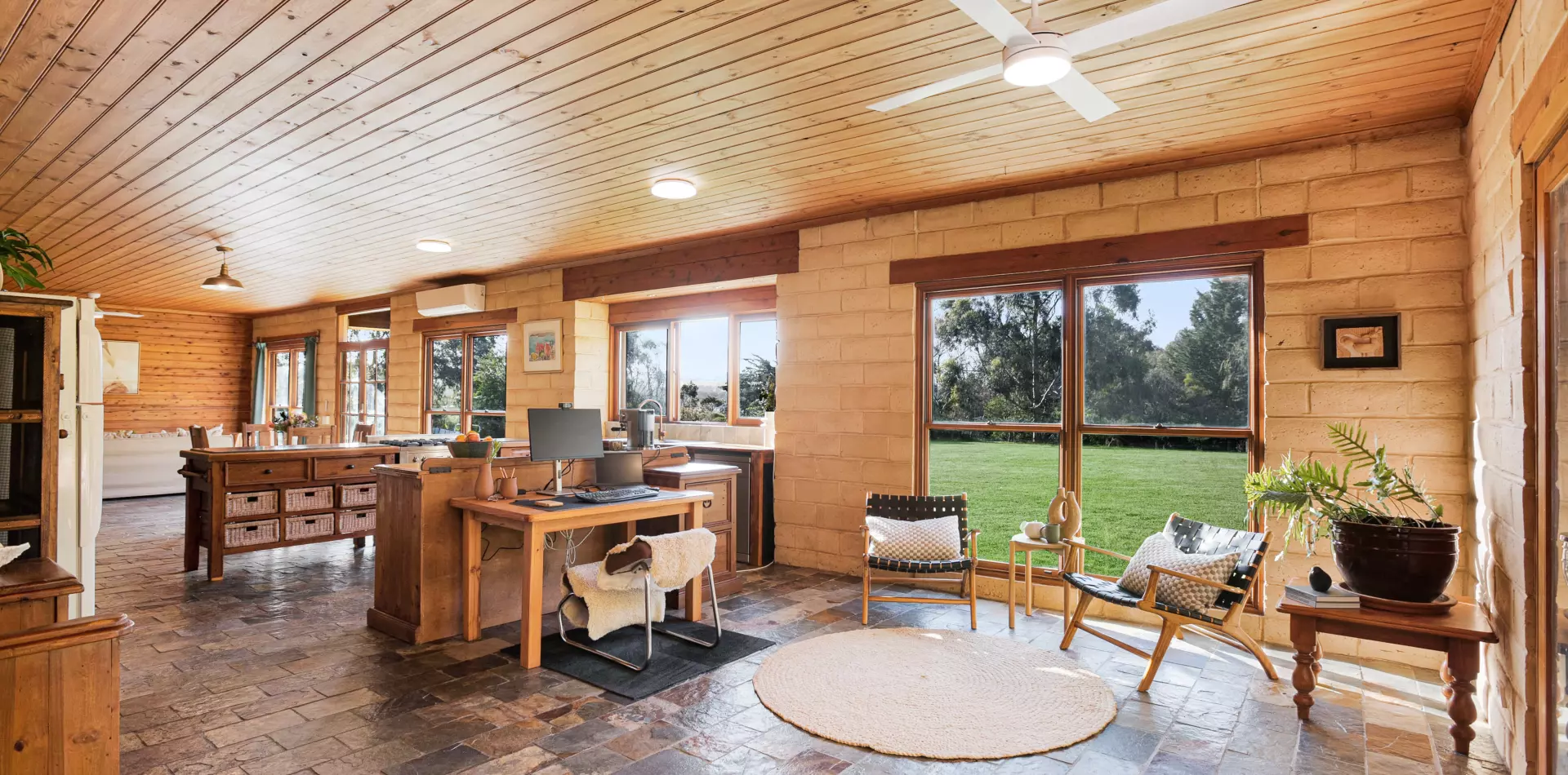 Homes built from timbercrete are renowned for their sustainability and strength. The thick walls act as natural insulation, keeping interiors cooler in summer and warmer in winter while also delivering acoustic comfort and an earthy beauty that feels instantly grounding. Complemented by timber-lined ceilings, timber windows, and feature lintels, the craftsmanship in this home is unmistakable.