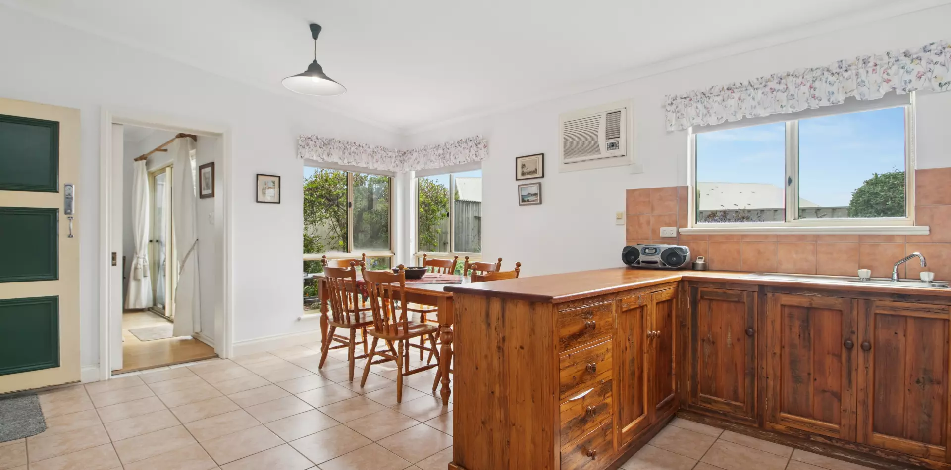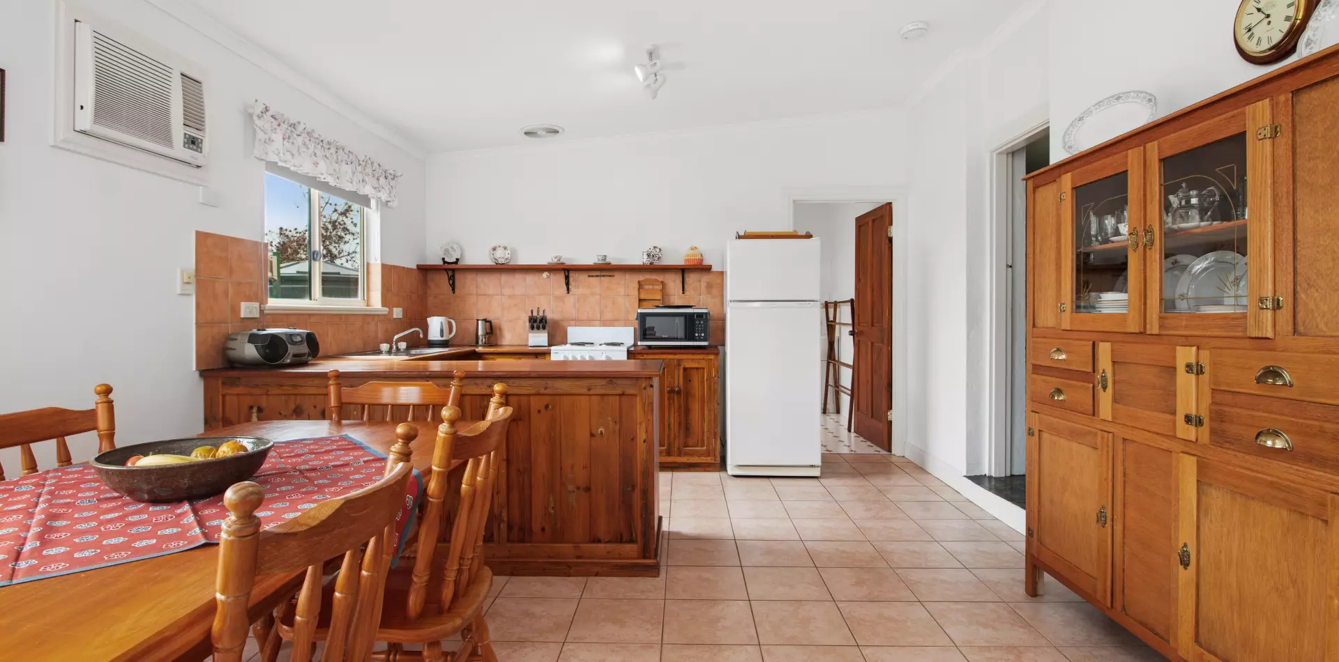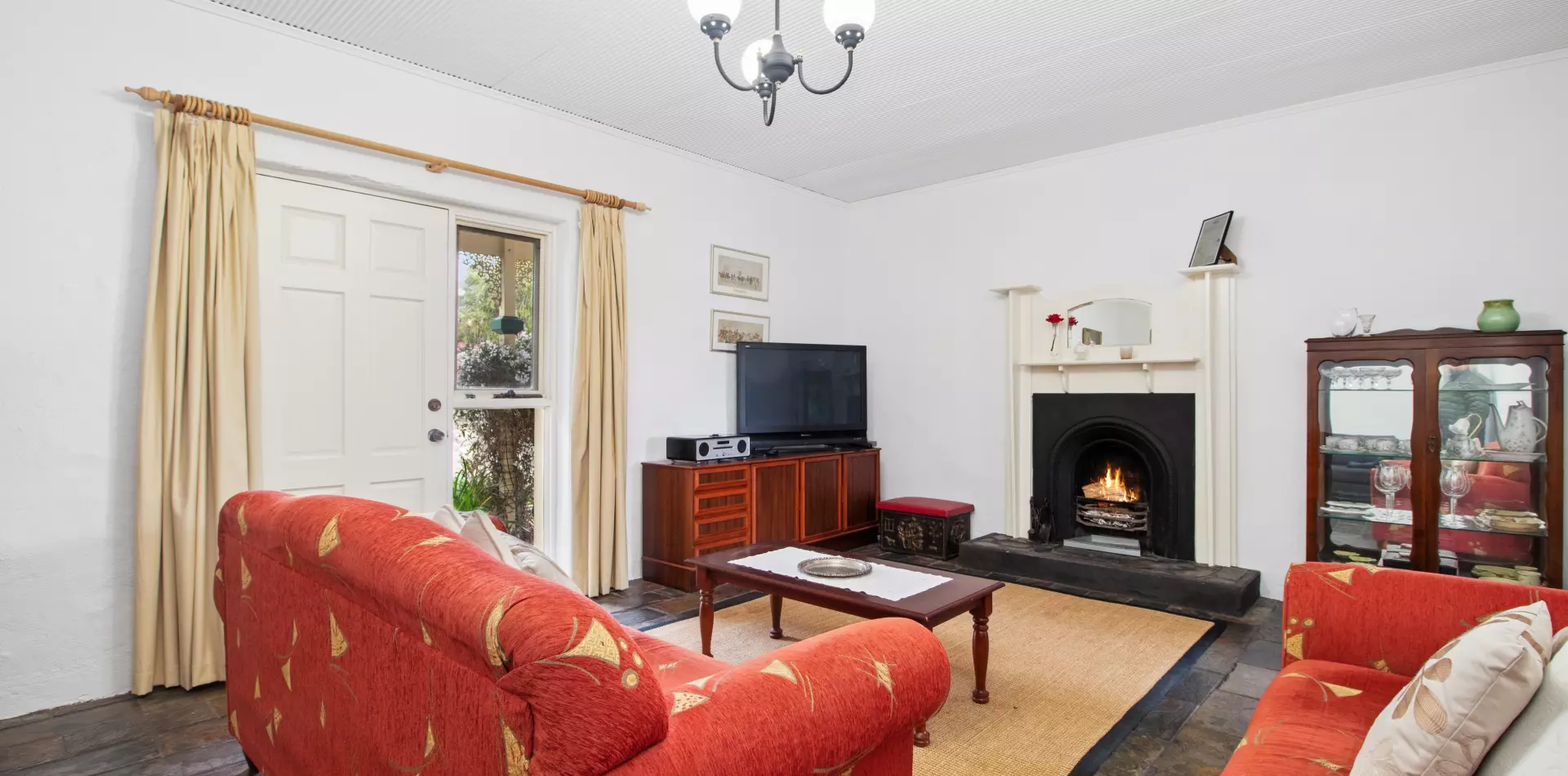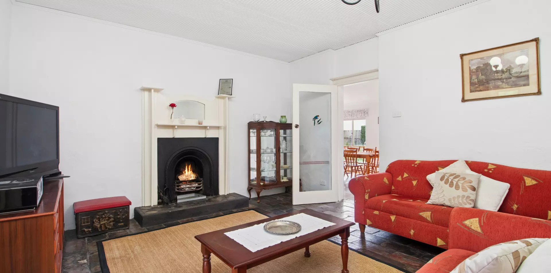 Step inside and discover character at every turn, the kitchen, lovingly constructed from original recycled timber, is the heart of the home, overlooking the dining space and beyond to a sun-filled leafy rear garden. Two bedrooms provide comfort and practicality, the master complete with built-in robe and ensuite, while a large, combined laundry and second bathroom sit conveniently off the kitchen. A cosy lounge with operational iron fireplace and timber mantle creates a warm retreat, complimented by a ceiling fan for year-round comfort.