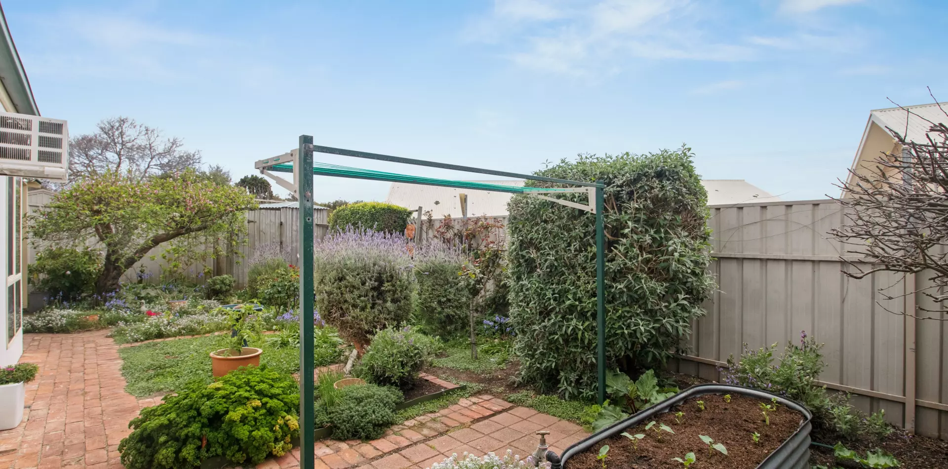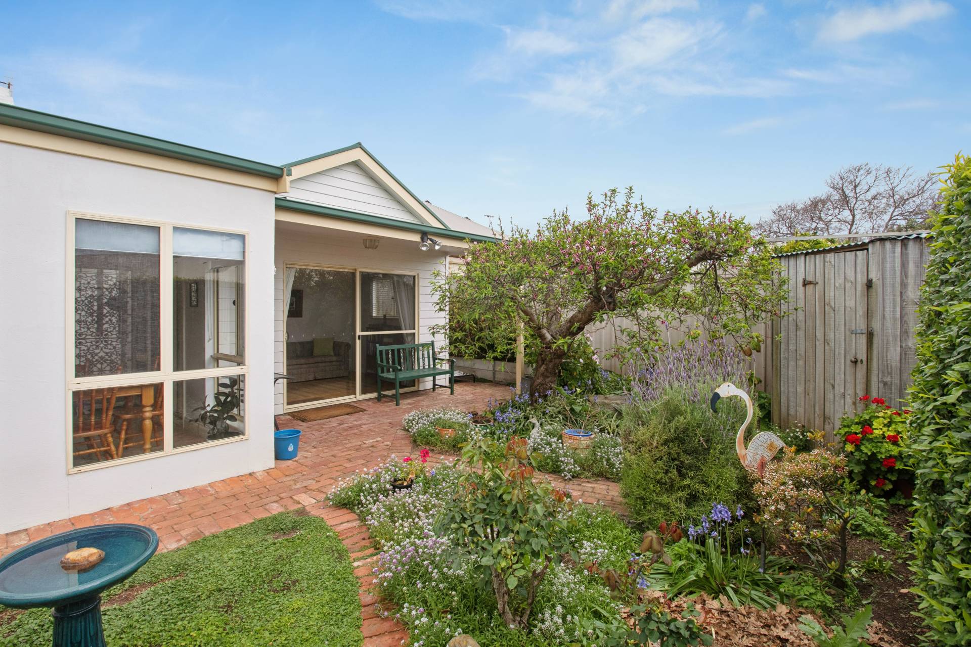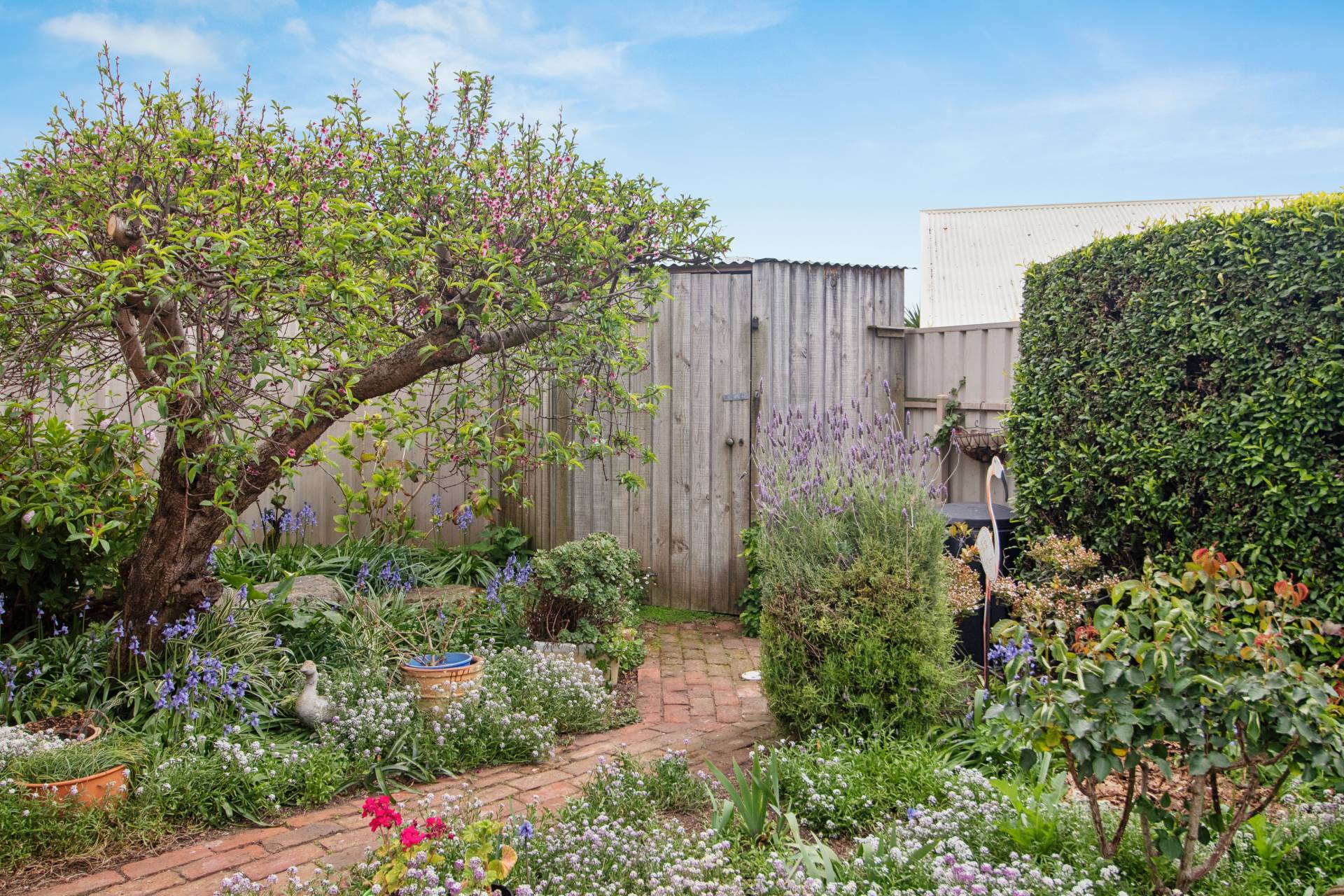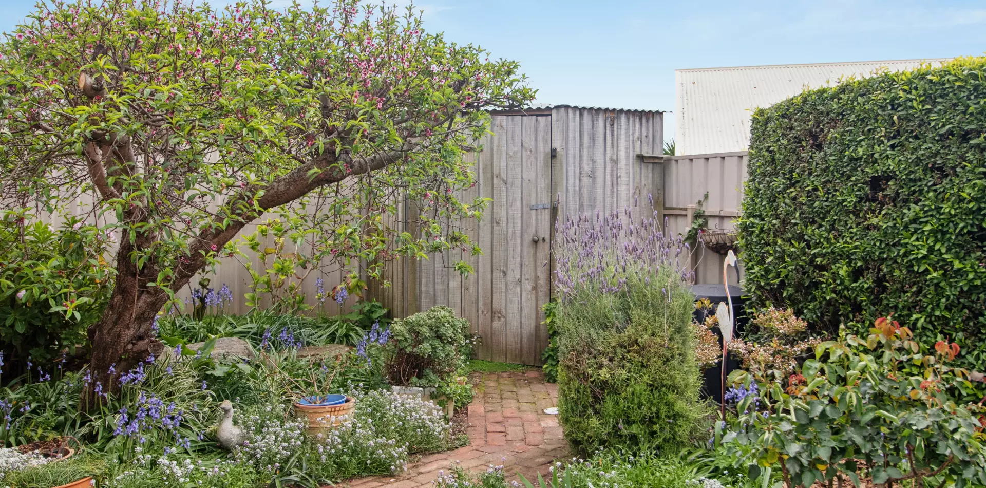 Outside, the cottage gardens are a delight, recycled brick paths, fragrant flowers, herbs, and shrubs in full bloom, and even a raised bed with beans ready to start their climb. A bullnose veranda frames the front façade, while timber windows, storage sheds at both front and rear, and a rainwater tank enhance the home’s practicality.