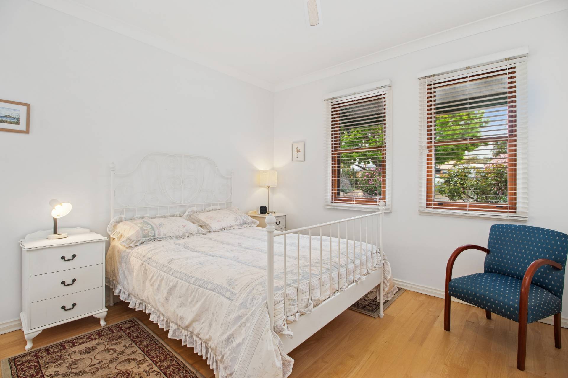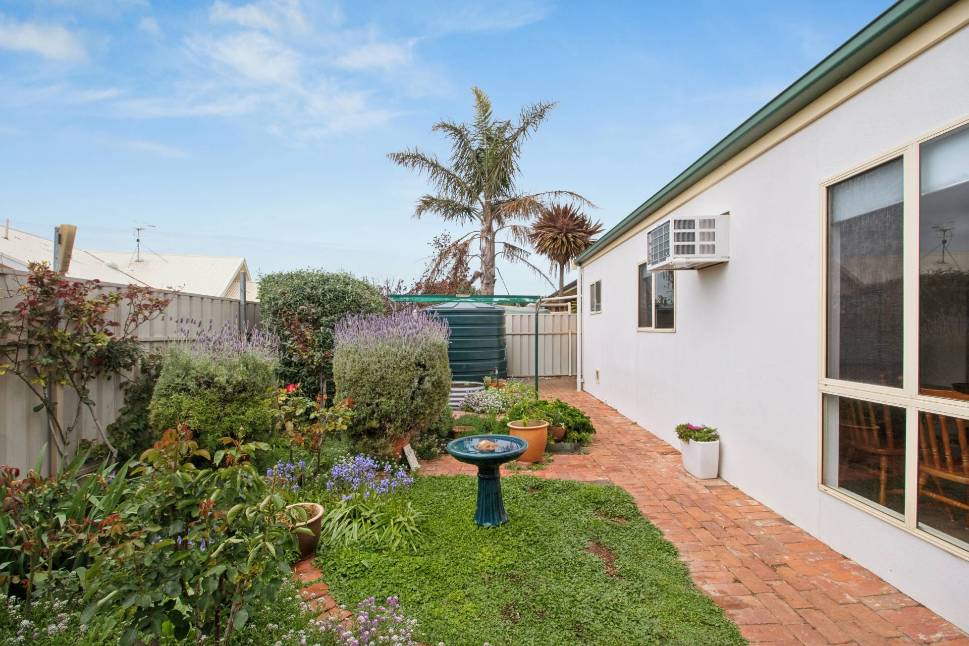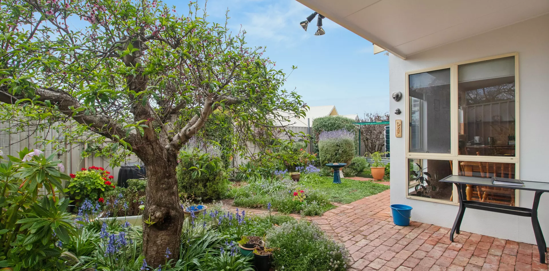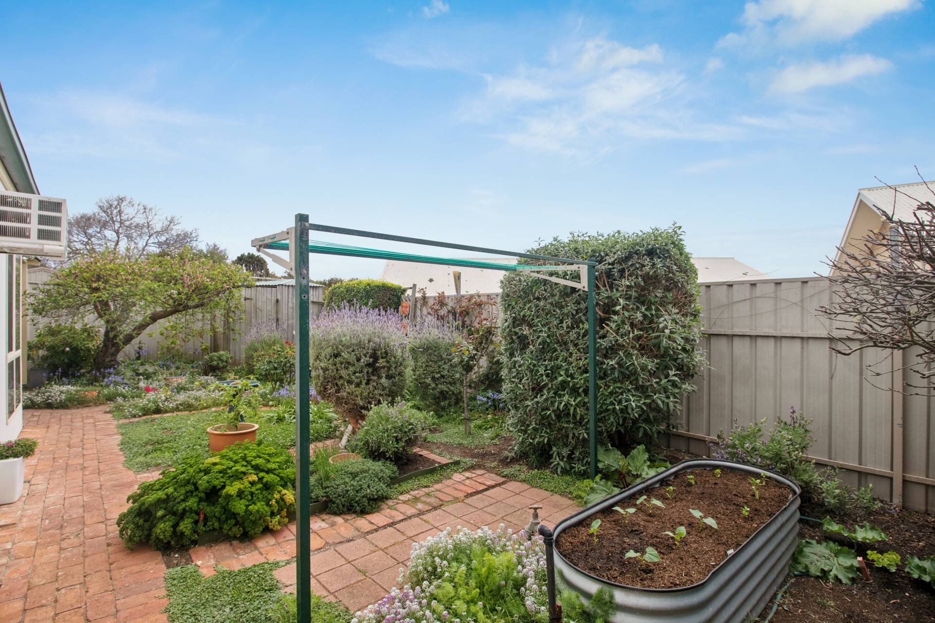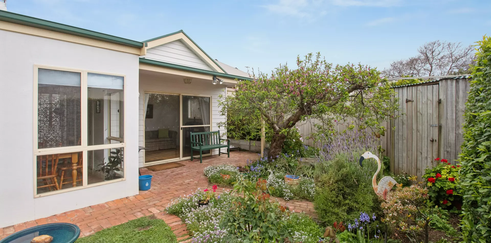 Outside, the cottage gardens are a delight, recycled brick paths, fragrant flowers, herbs, and shrubs in full bloom, and even a raised bed with beans ready to start their climb. A bullnose veranda frames the front façade, while timber windows, storage sheds at both front and rear, and a rainwater tank enhance the home’s practicality.