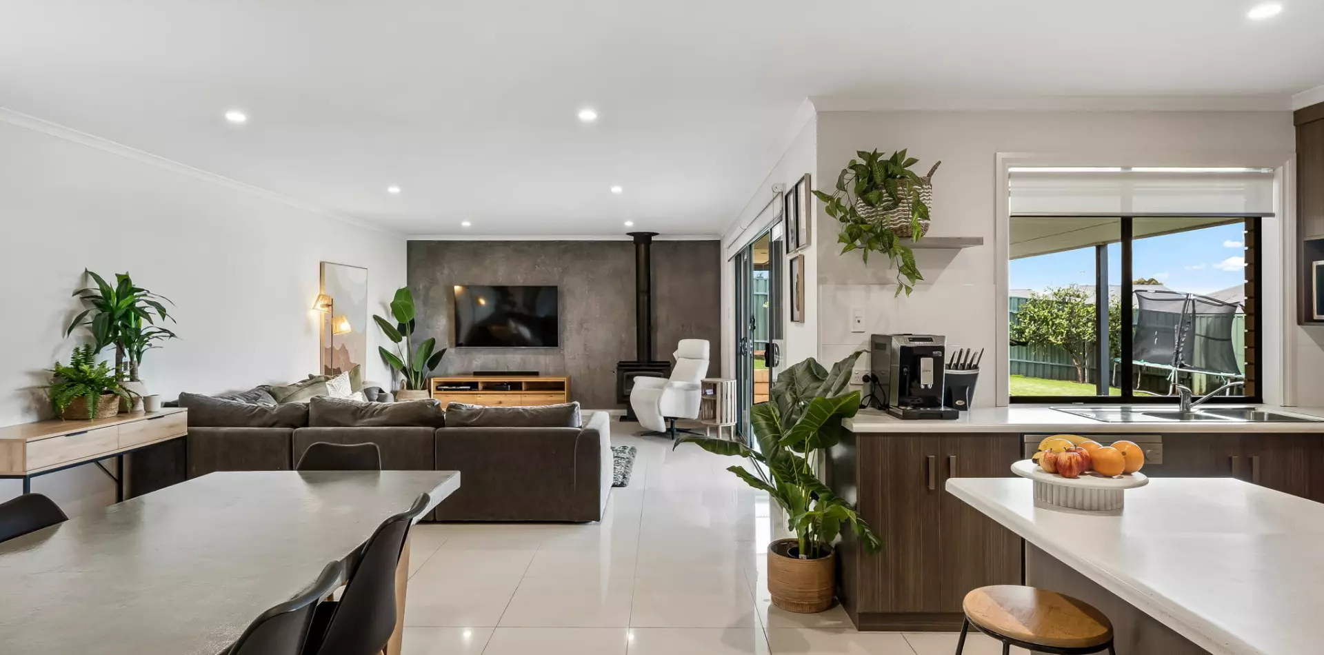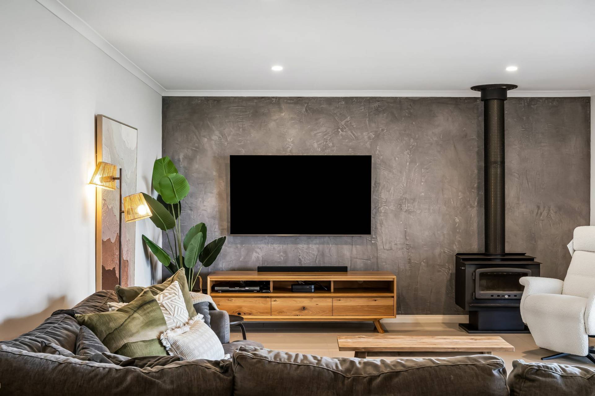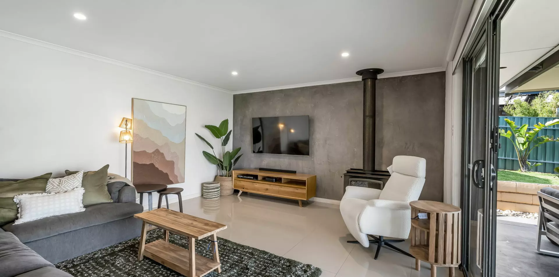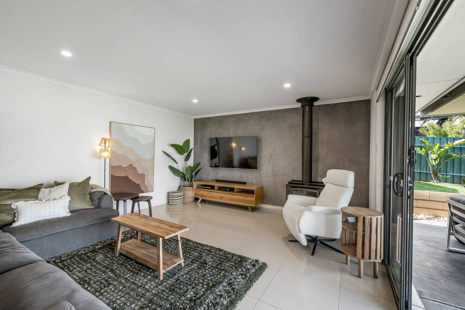 Inside, the home showcases a thoughtfully designed floorplan featuring three generous bedrooms, two stylish bathrooms, and two separate living areas. The light-filled kitchen is beautifully appointed with dark timber-grain cabinetry, a gas cooktop, island bench, and dishwasher, all flowing seamlessly into the open-plan dining and family area. A feature concrete-look wall and freestanding fireplace add warmth and personality, while large-format floor tiles, downlights, and split-system air conditioning enhance the modern appeal. Ceiling fans throughout the bedrooms provide comfort all year round.