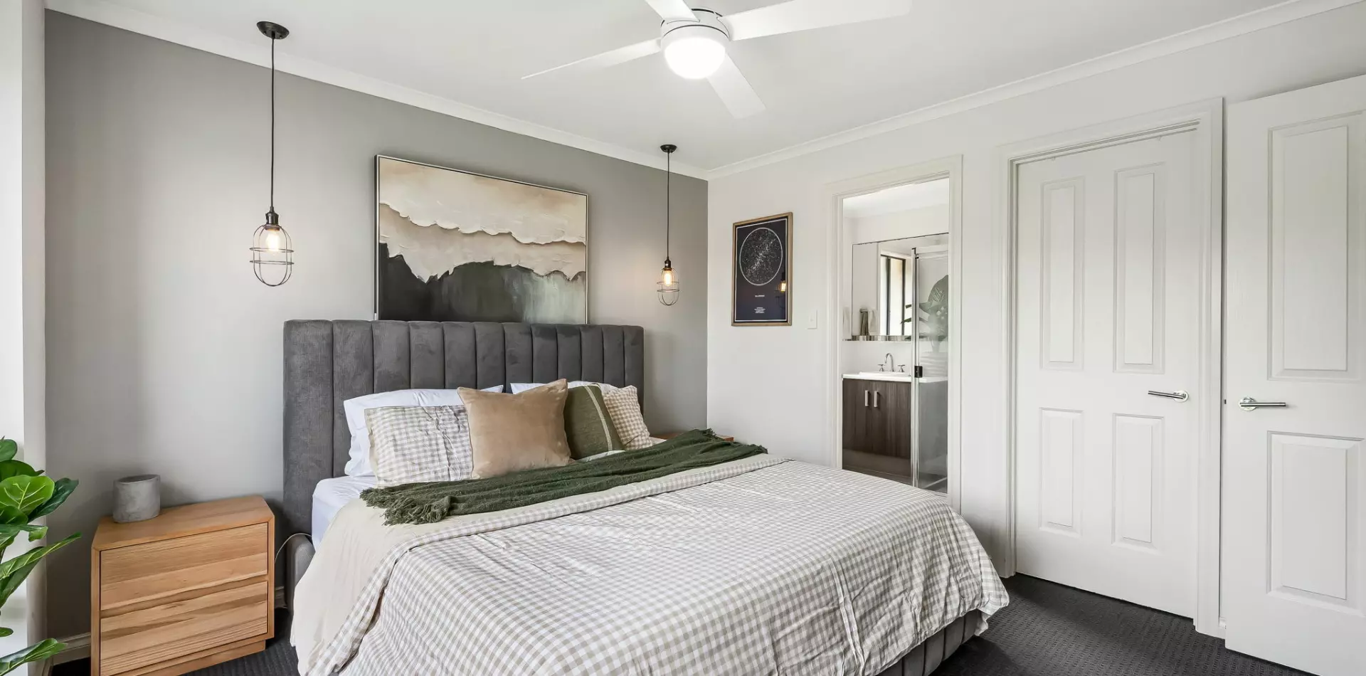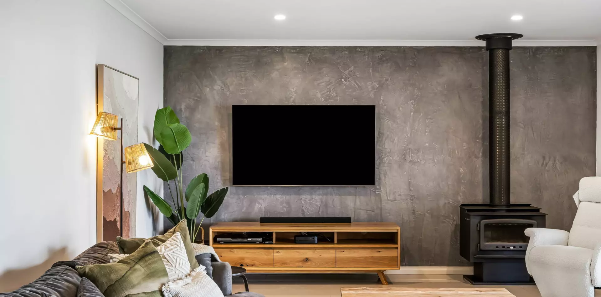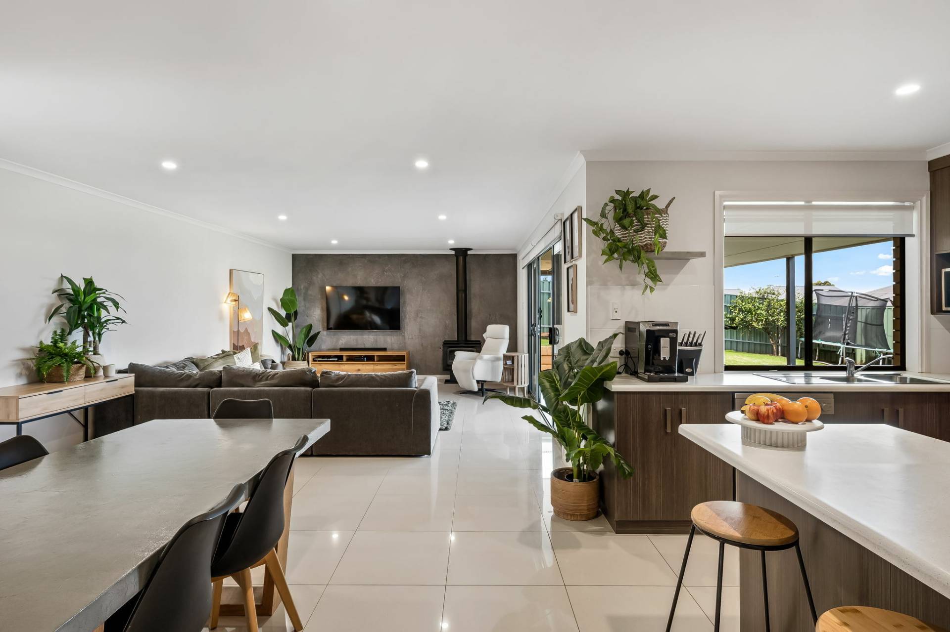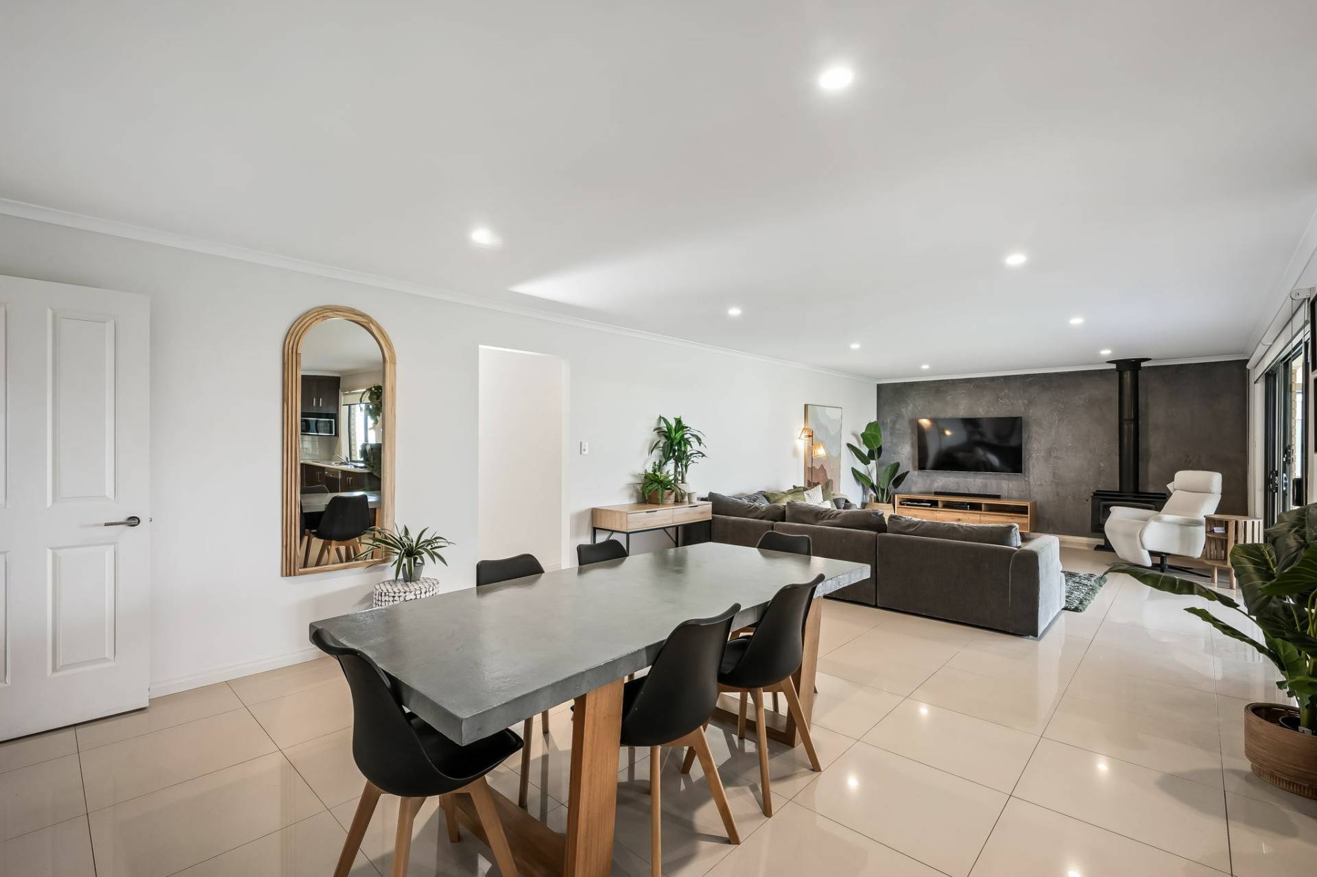 Inside, the home showcases a thoughtfully designed floorplan featuring three generous bedrooms, two stylish bathrooms, and two separate living areas. The light-filled kitchen is beautifully appointed with dark timber-grain cabinetry, a gas cooktop, island bench, and dishwasher, all flowing seamlessly into the open-plan dining and family area. A feature concrete-look wall and freestanding fireplace add warmth and personality, while large-format floor tiles, downlights, and split-system air conditioning enhance the modern appeal. Ceiling fans throughout the bedrooms provide comfort all year round.